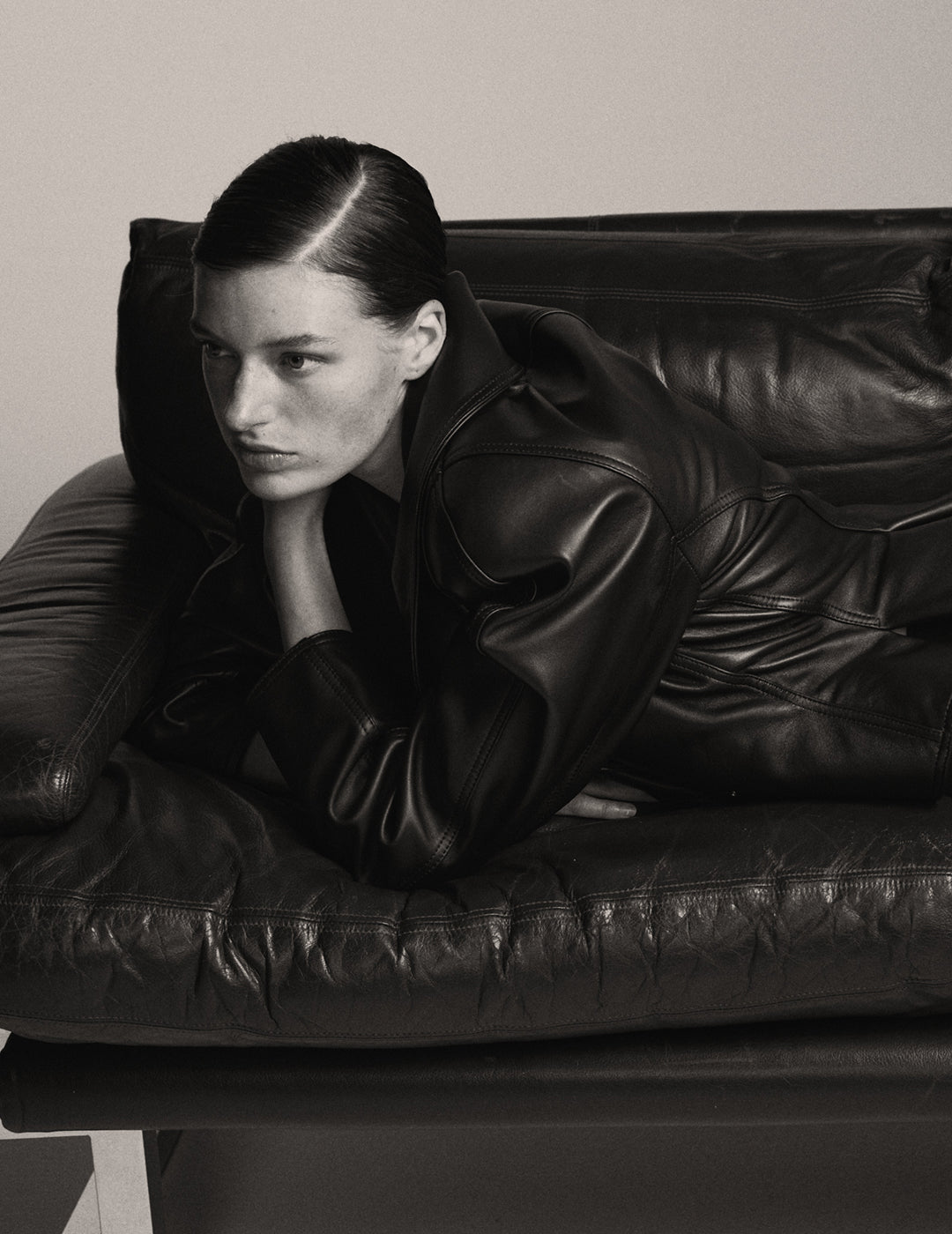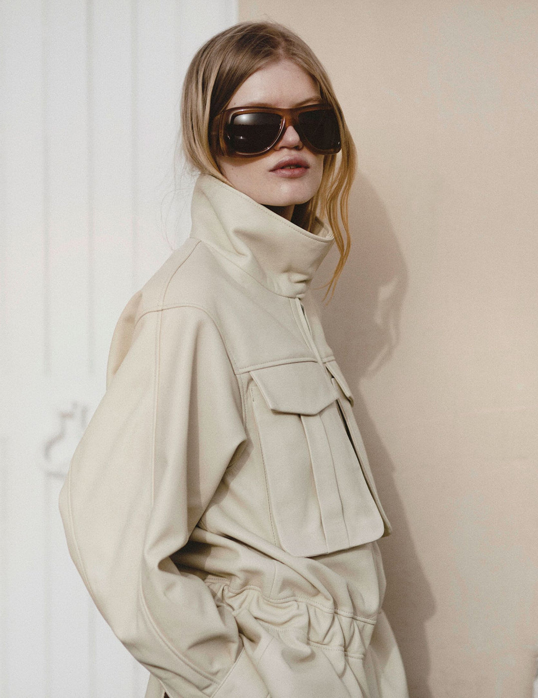 Crafted from supple, premium leather and lined in smooth satin, it offers both comfort and structure. A clean funnel neck adds a contemporary edge, while oversized front pockets at the chest bring a functional, utility feel.