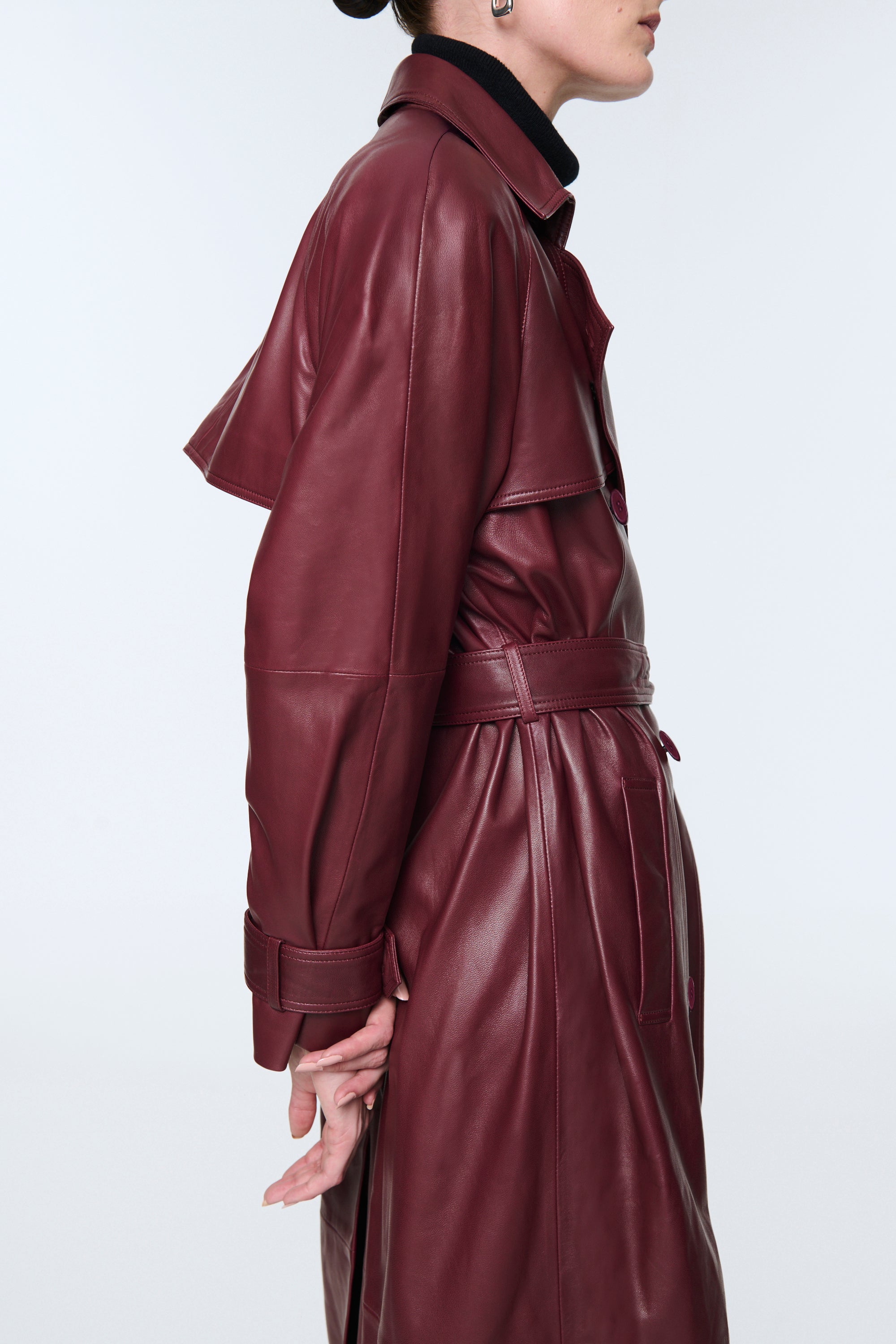 This coat will get you noticed. The incredibly soft, high quality leather is beautifully tailored into a classic double breasted trench complete with storm flap, shoulder pads and leather sash. This cocooning coat will be a constant in your wardrobe.
