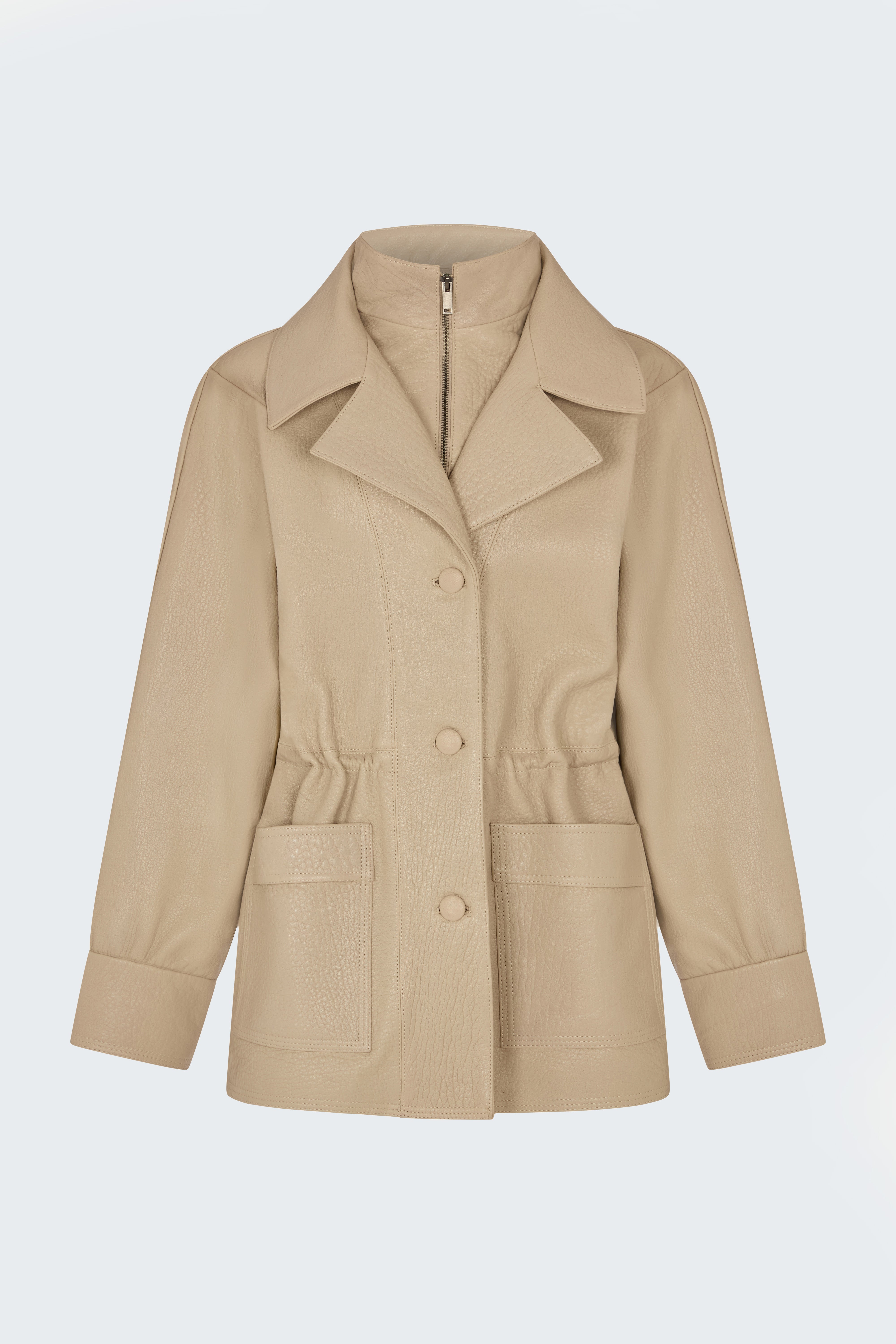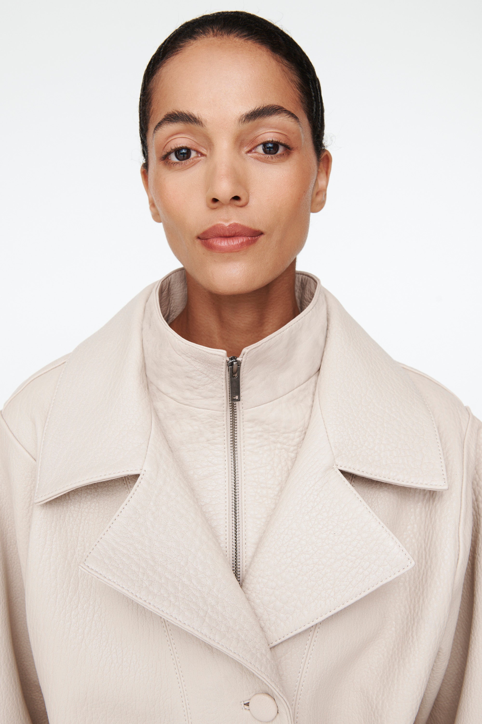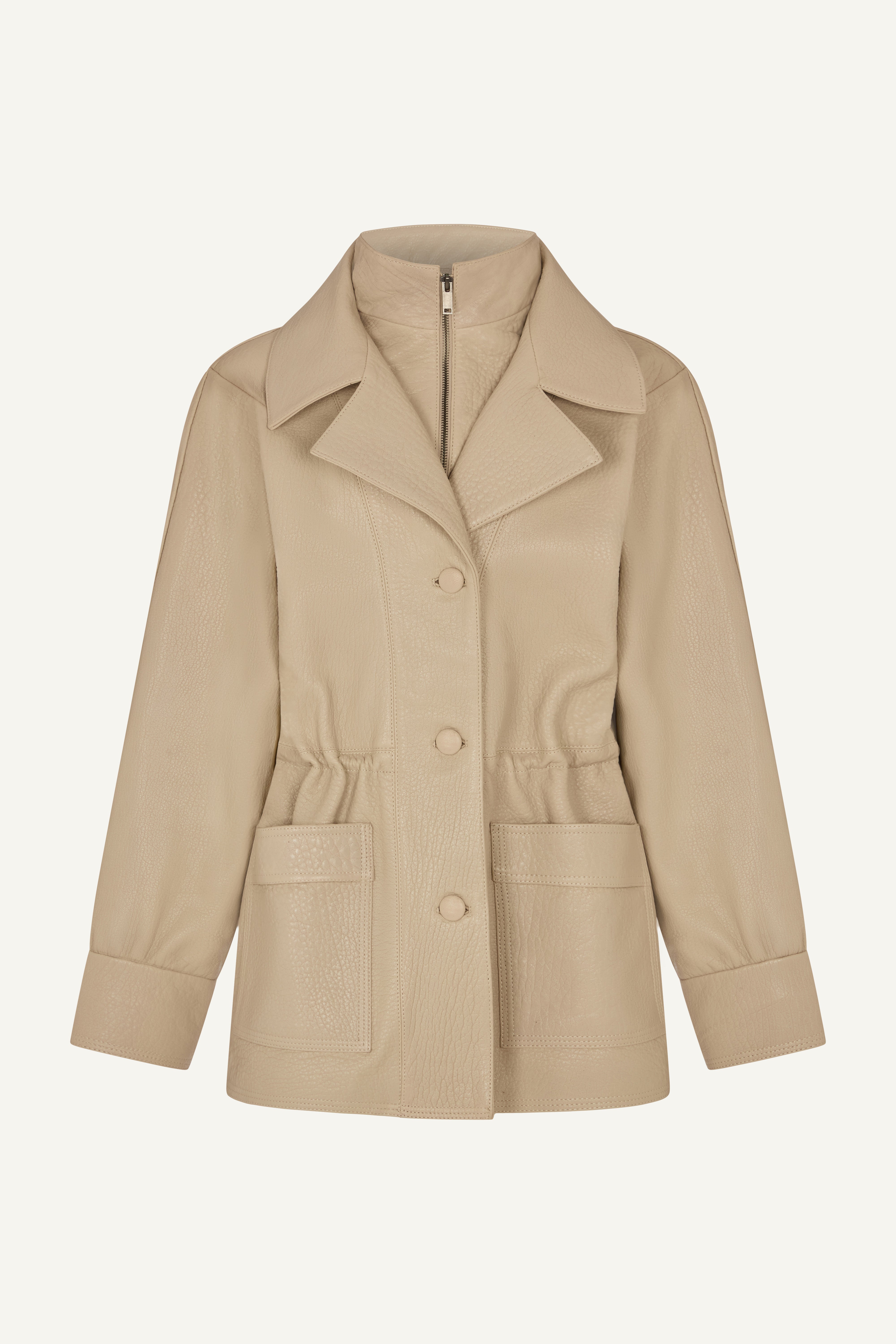 A beautiful double collar leather jacket, use the draw cord to cinch the waist for an effortlessly relaxed look.