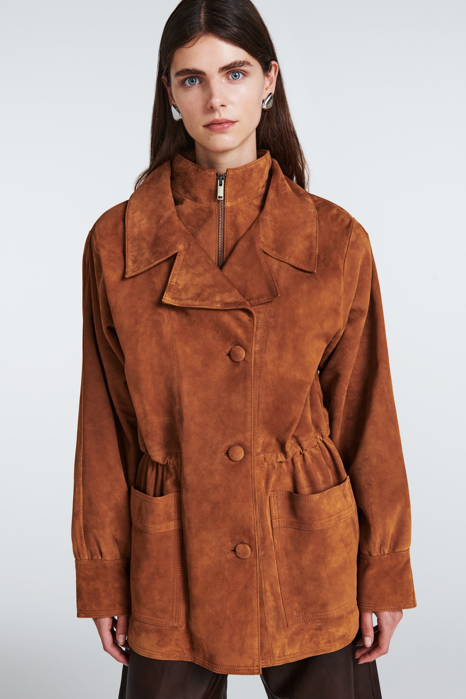 A beautiful double collar suede jacket, use the draw cord to cinch the waist for an effortlessly relaxed look.