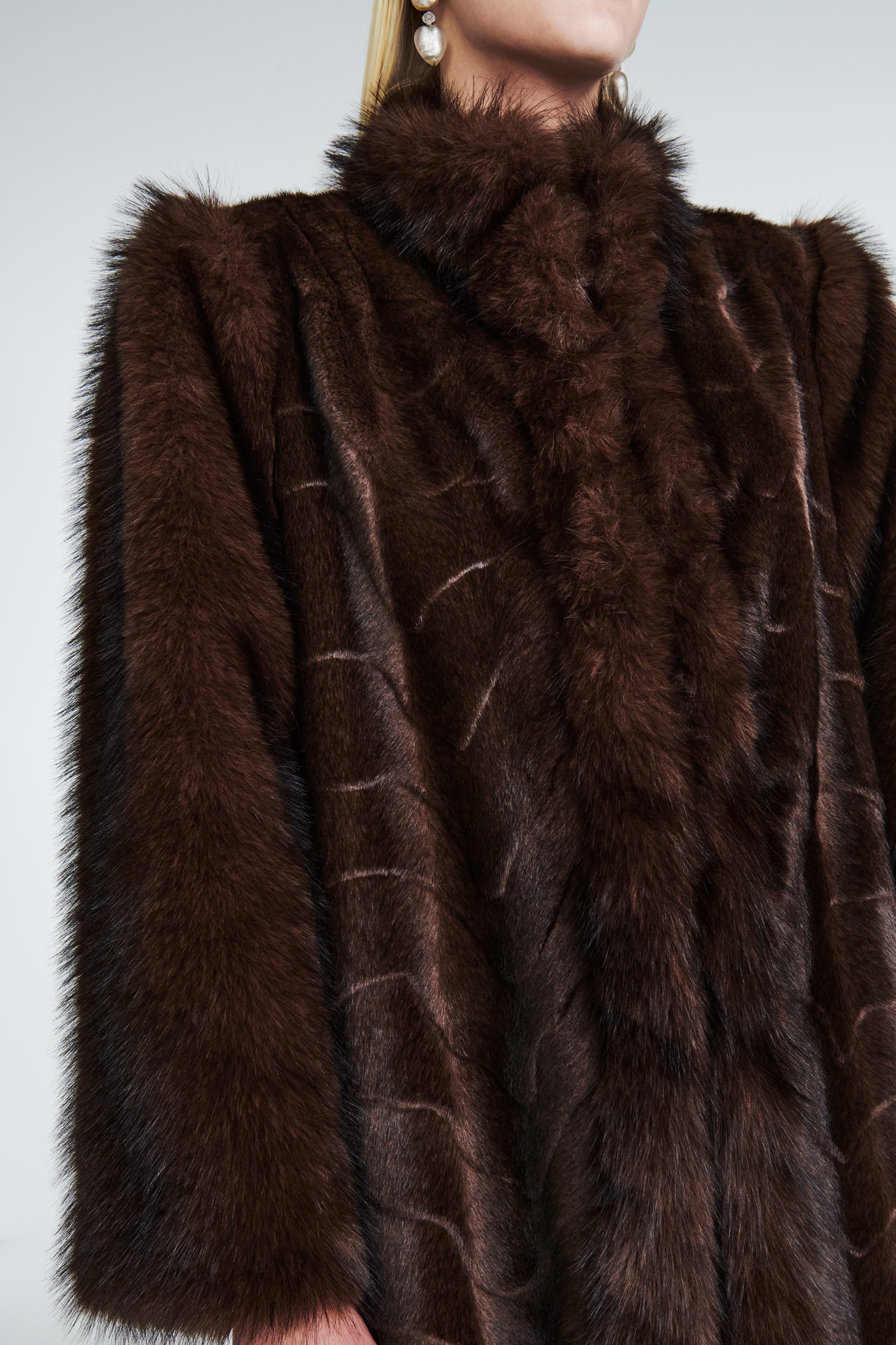 An oppulent mid length faux fur coat combining two types of fur. It features a stand collar and princess sleeves leaning into the 90’s power shoulders silhouette. Side seam pockets and front hook fastenings make for a sleek finish.
