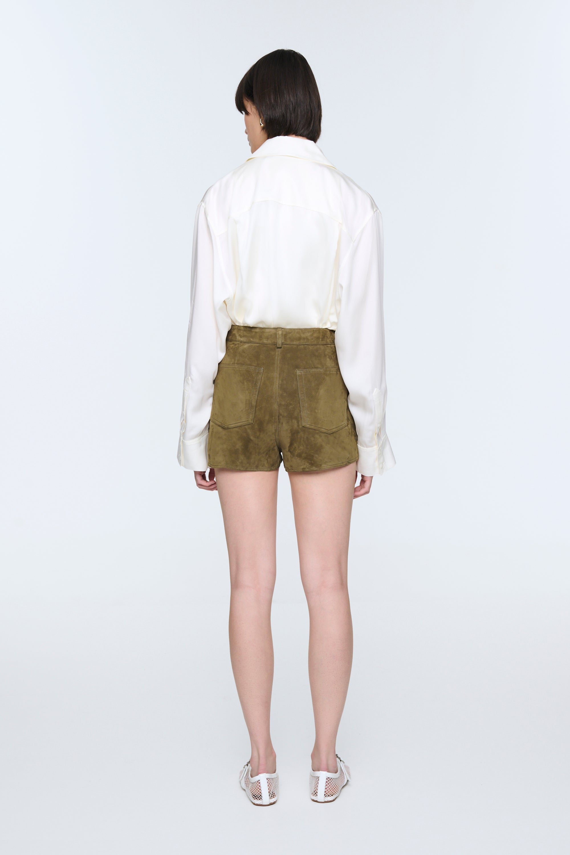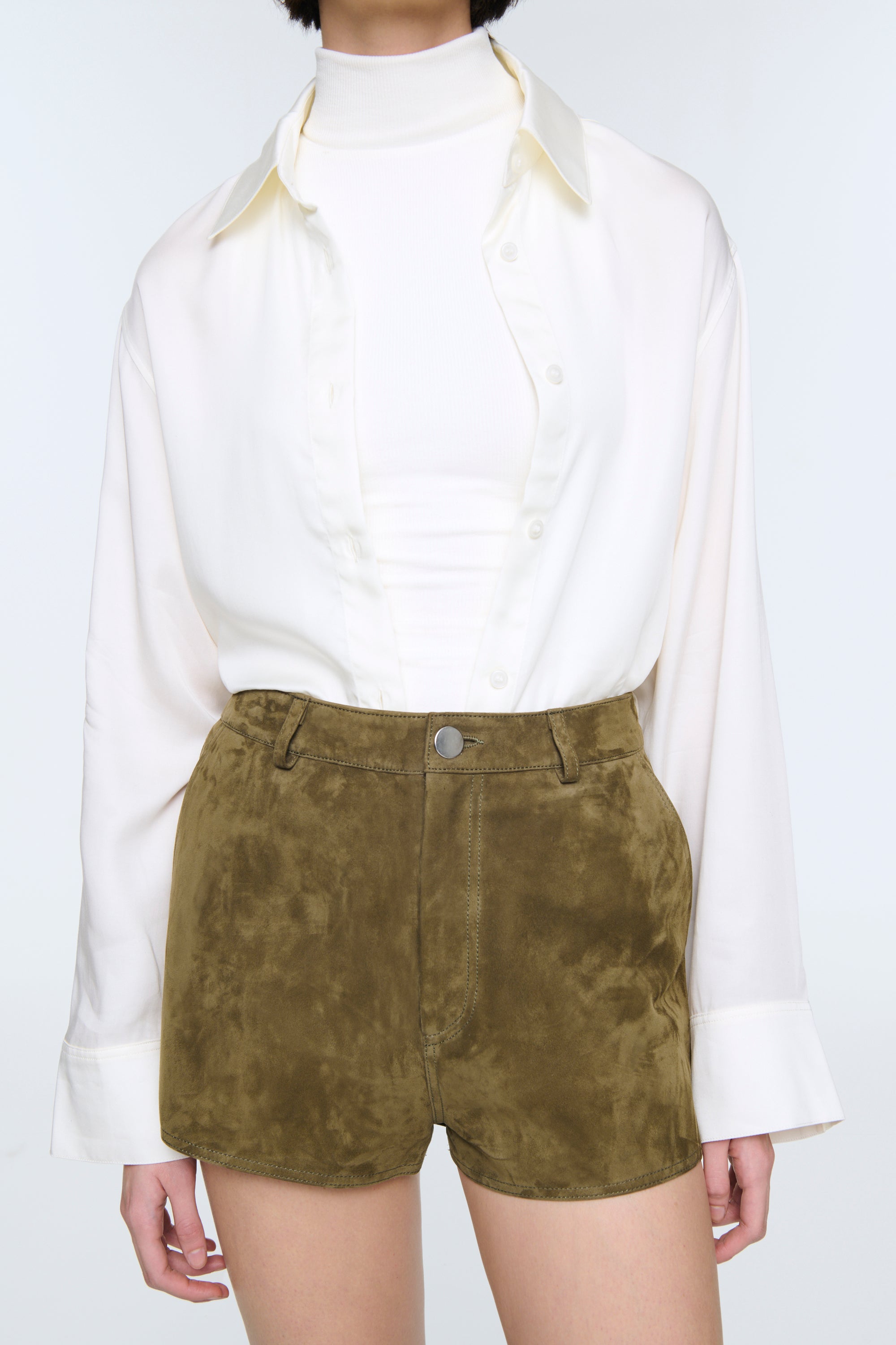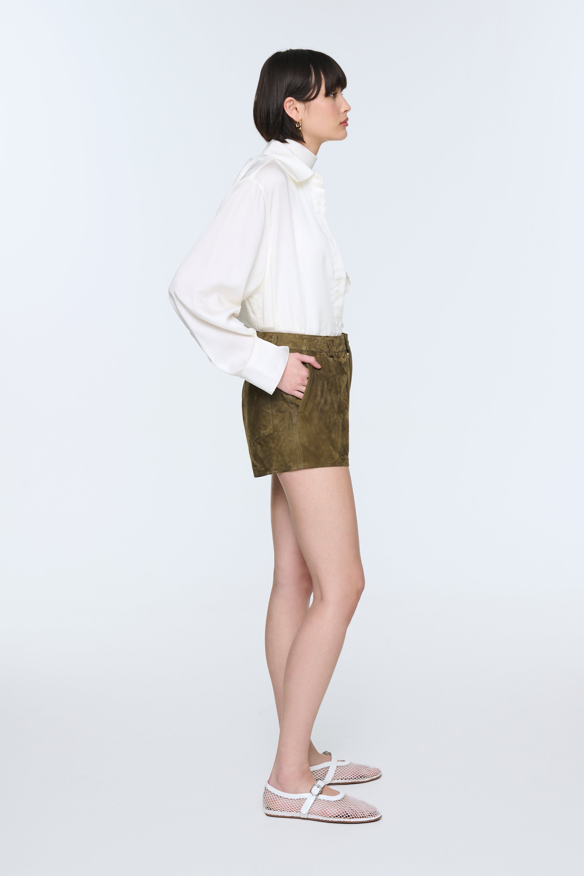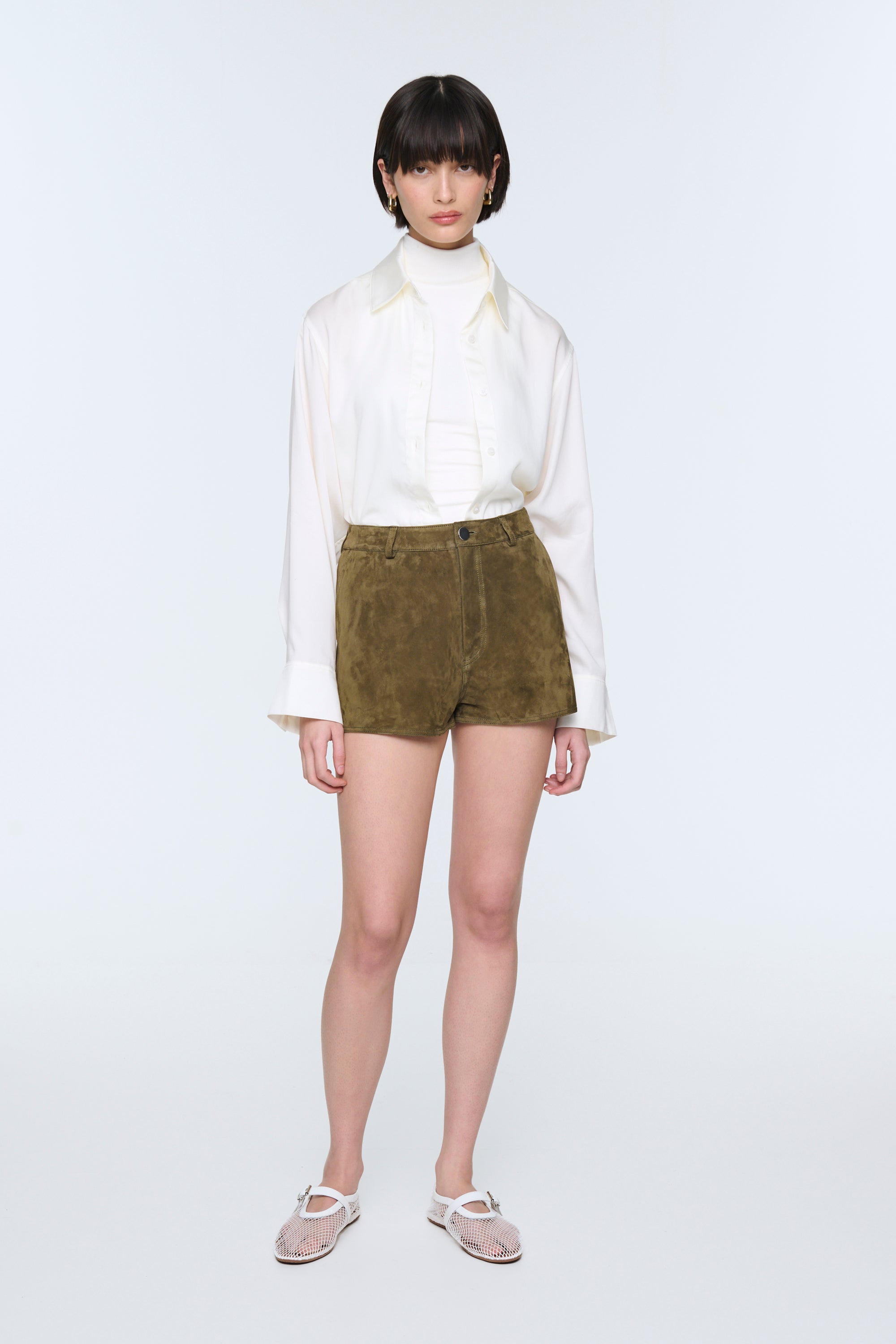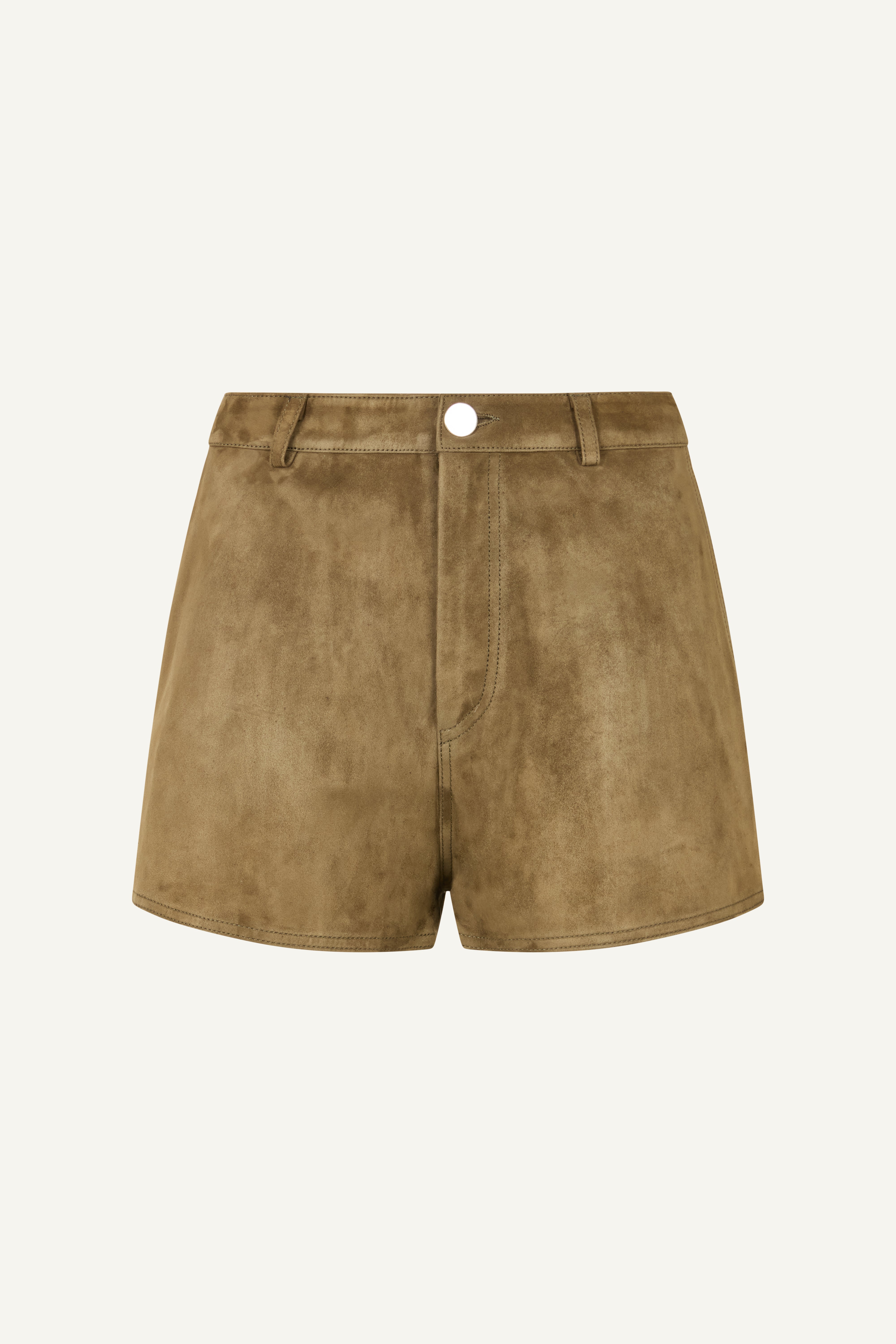 We're smitten with these olive suede shorts. Designed to flatter, they effortlessly transition from casual to dressed-up with a simple shoe change, or pair beautifully with tights for added versatility.