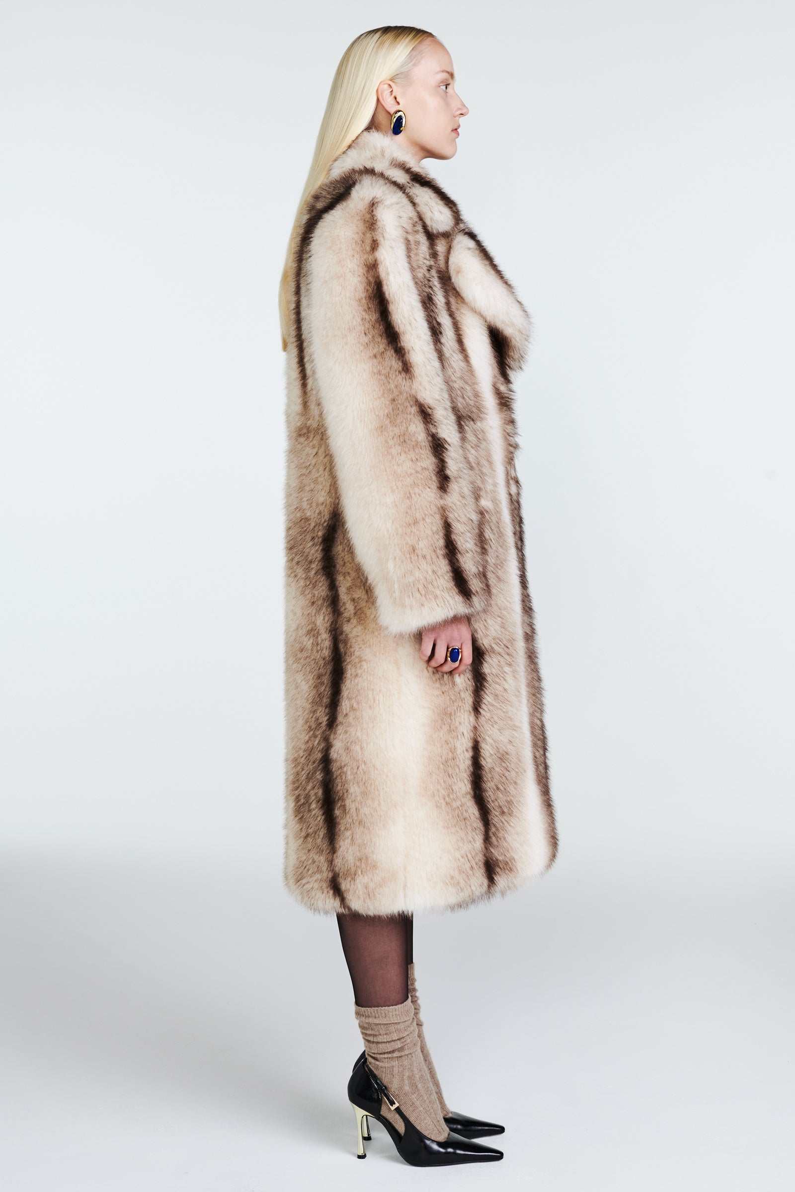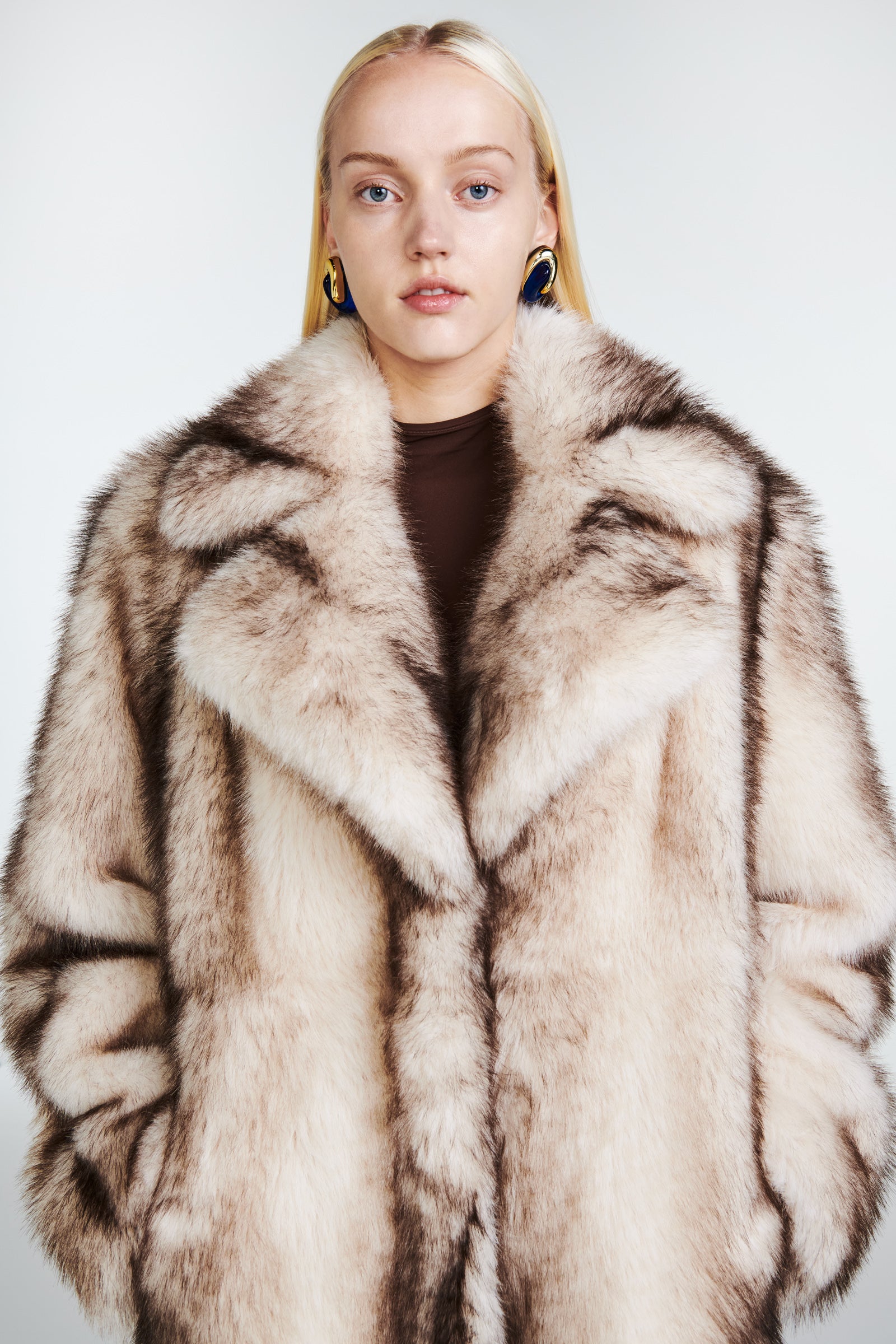 A show stopping piece! This mid-calf length luscious faux fur coat with exaggerated lapels pays homage to iconic Carrie Bradshaw look. Effortlessly elegant, minimal in details but bold in style; convenient front hook fastening and side seam pockets.
