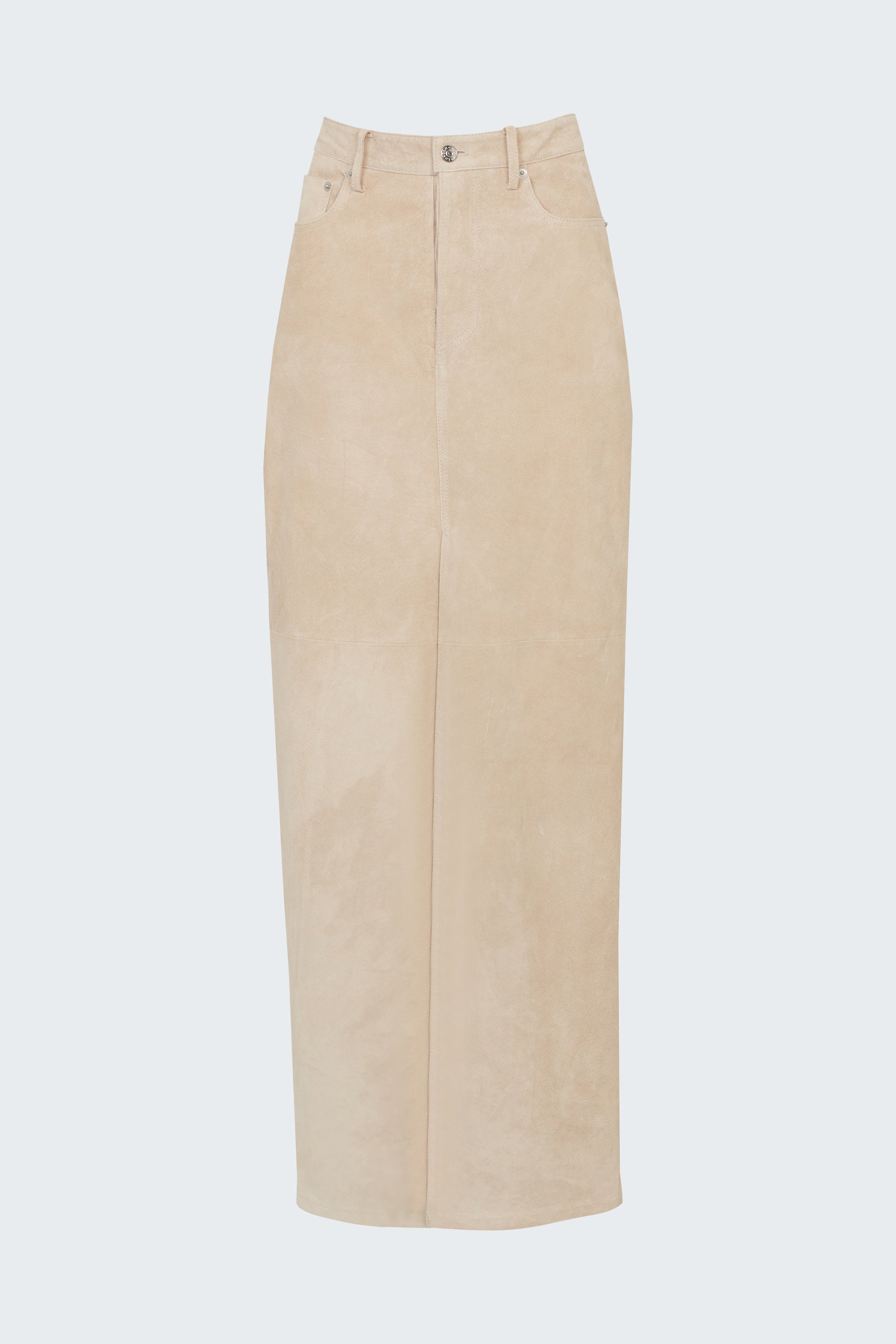 This luxurious maxi skirt will look incredible all year round, layered with a simple t-shirt or bra top in the summer and chunky knits in the winter. The extra-long length makes it feel super elegant and we love the denim style details and generous front slit for ease of movement and a glimpse of leg.