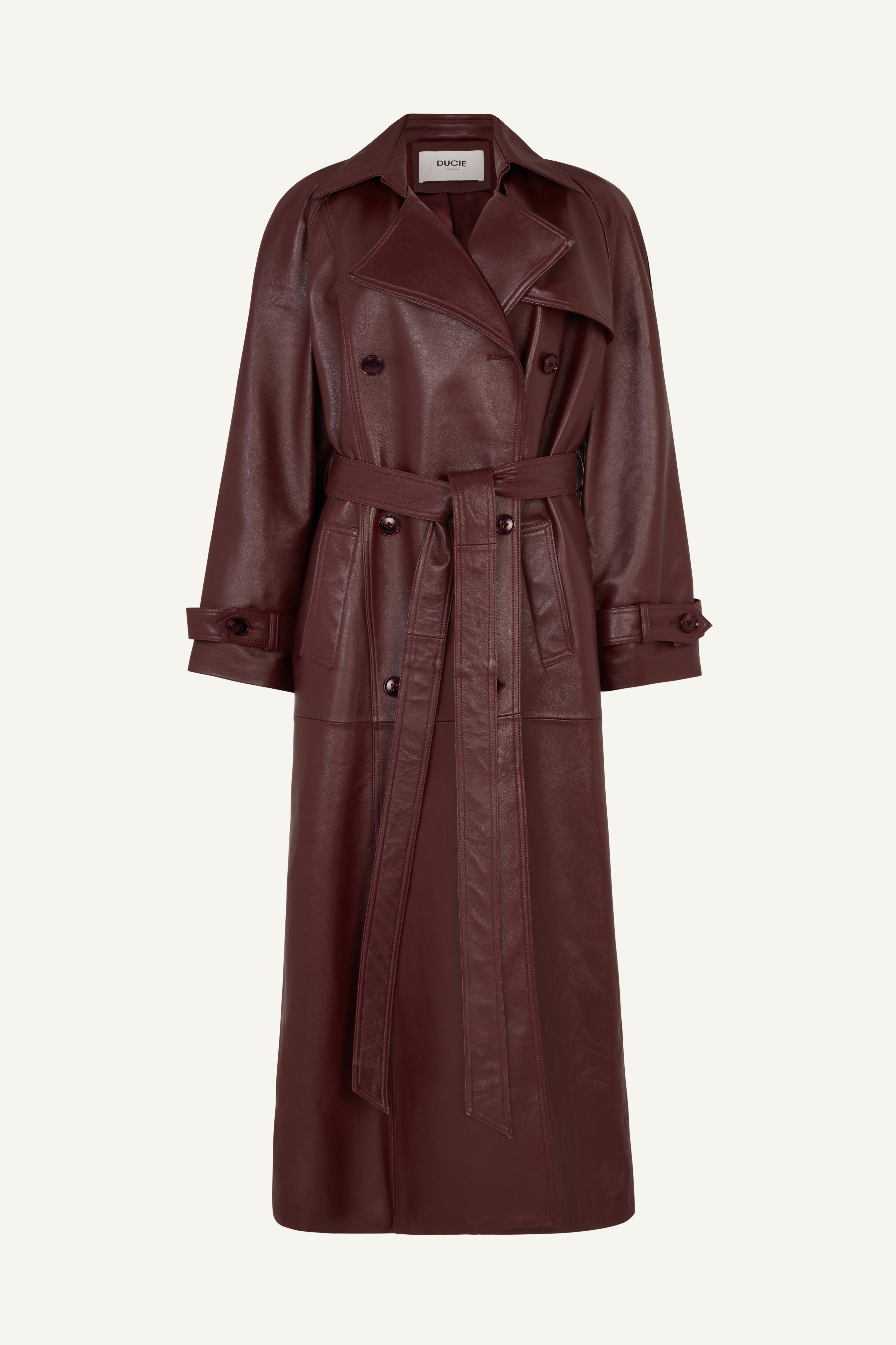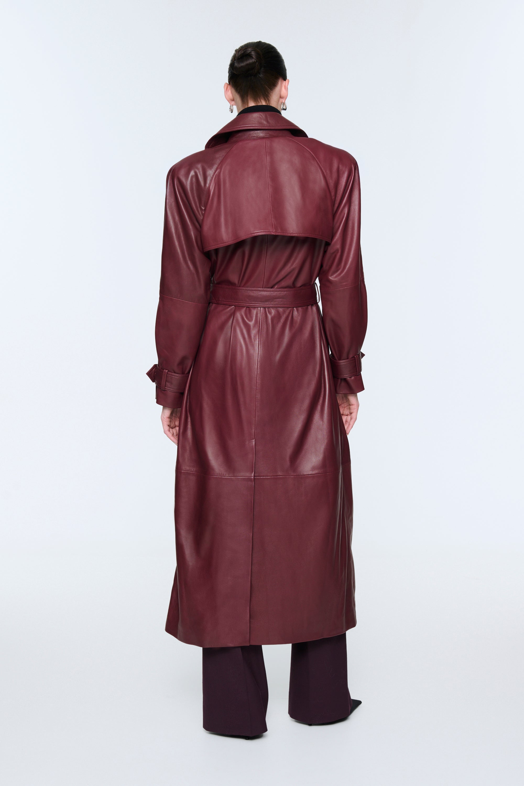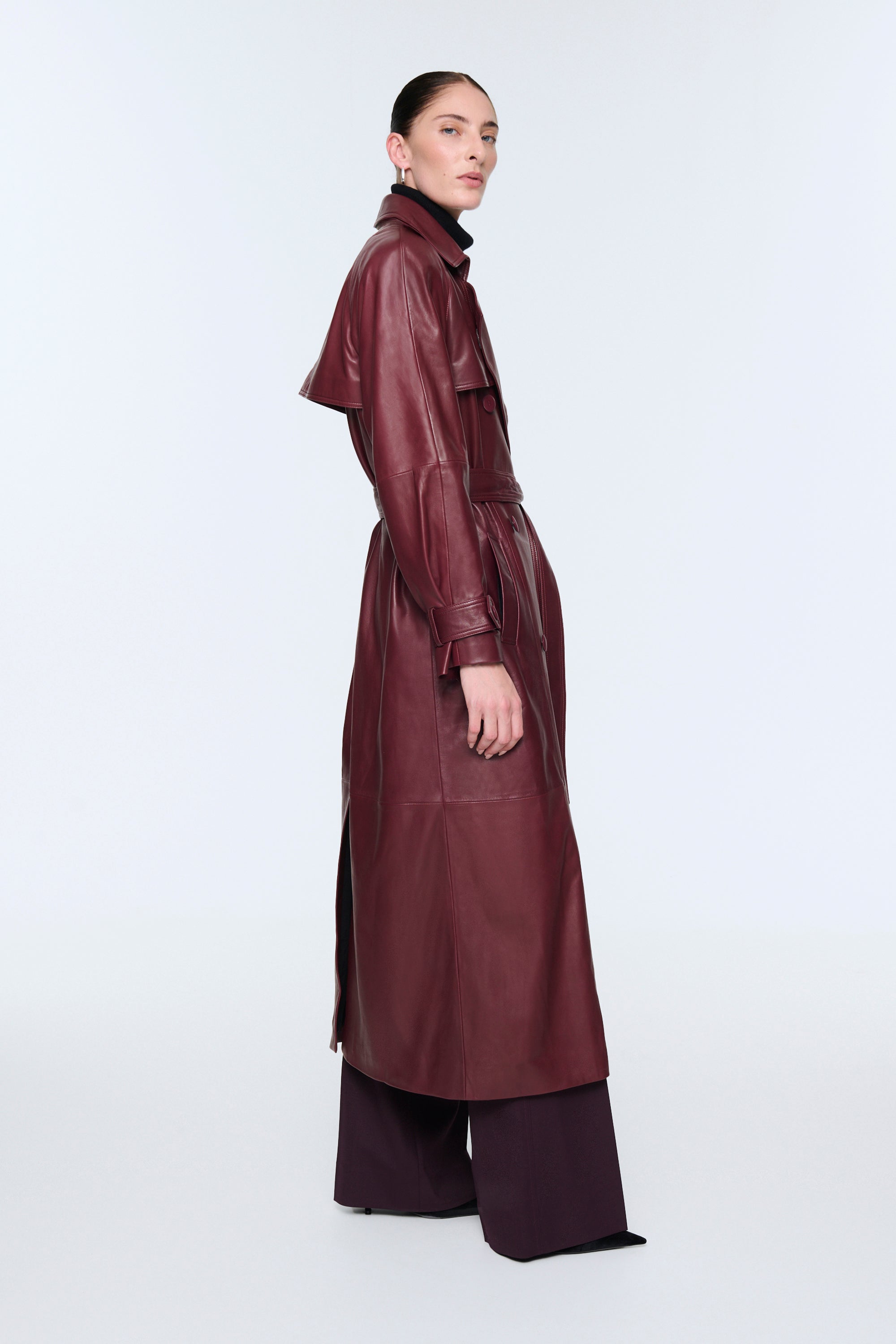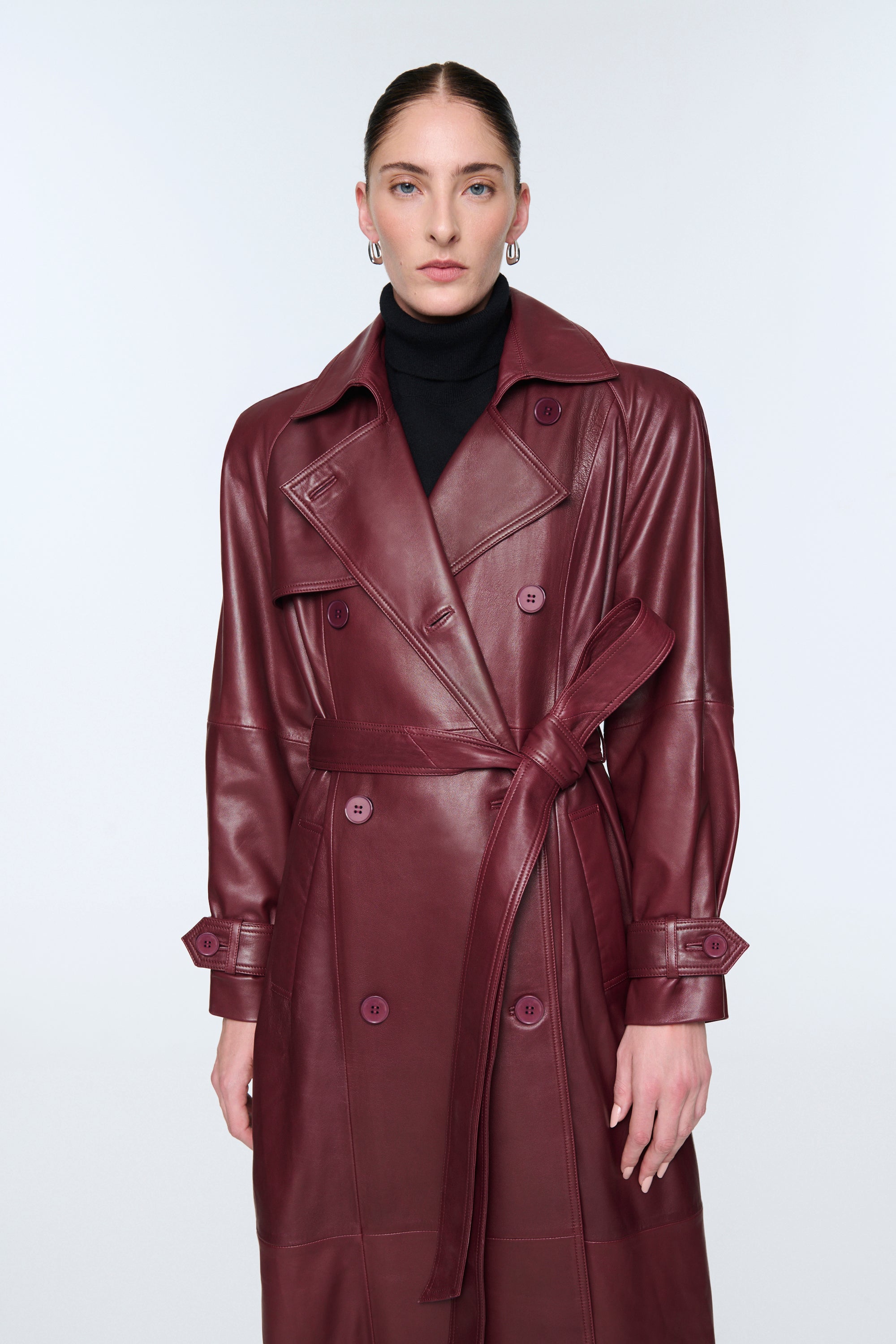 This coat will get you noticed. The incredibly soft, high quality leather is beautifully tailored into a classic double breasted trench complete with storm flap, shoulder pads and leather sash. This cocooning coat will be a constant in your wardrobe.