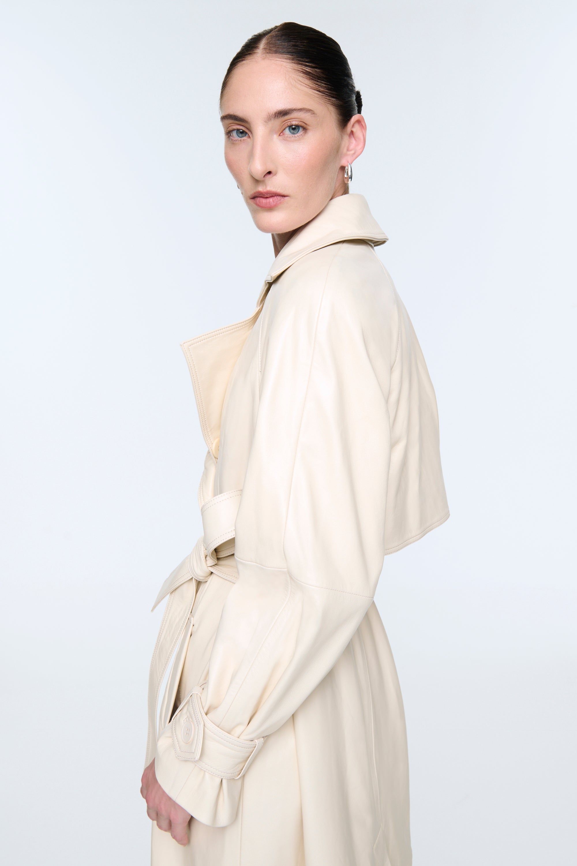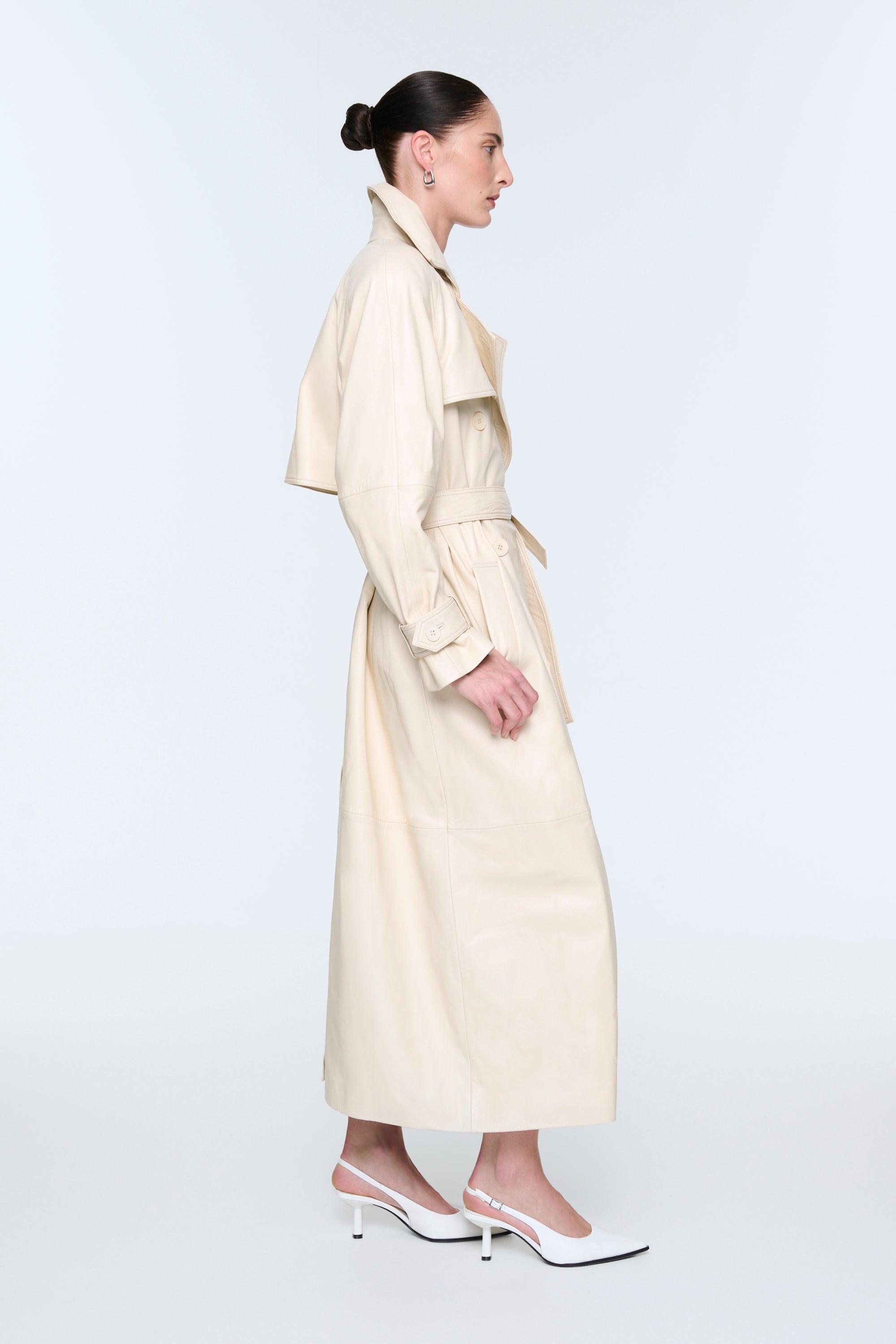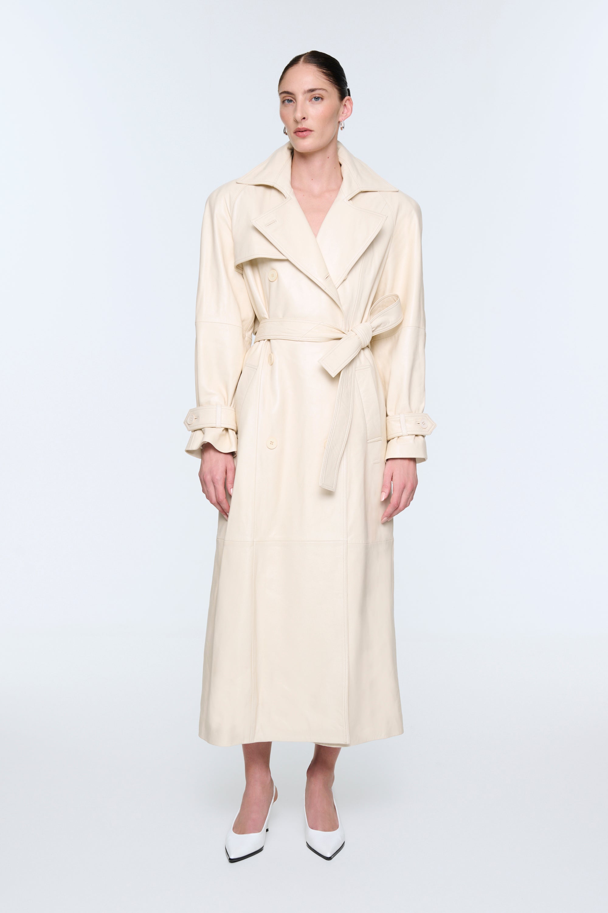 This coat will get you noticed. The incredibly soft, high quality leather is beautifully tailored into a classic double breasted trench complete with storm flap, shoulder pads and leather sash. This cocooning coat will be a constant in your wardrobe.