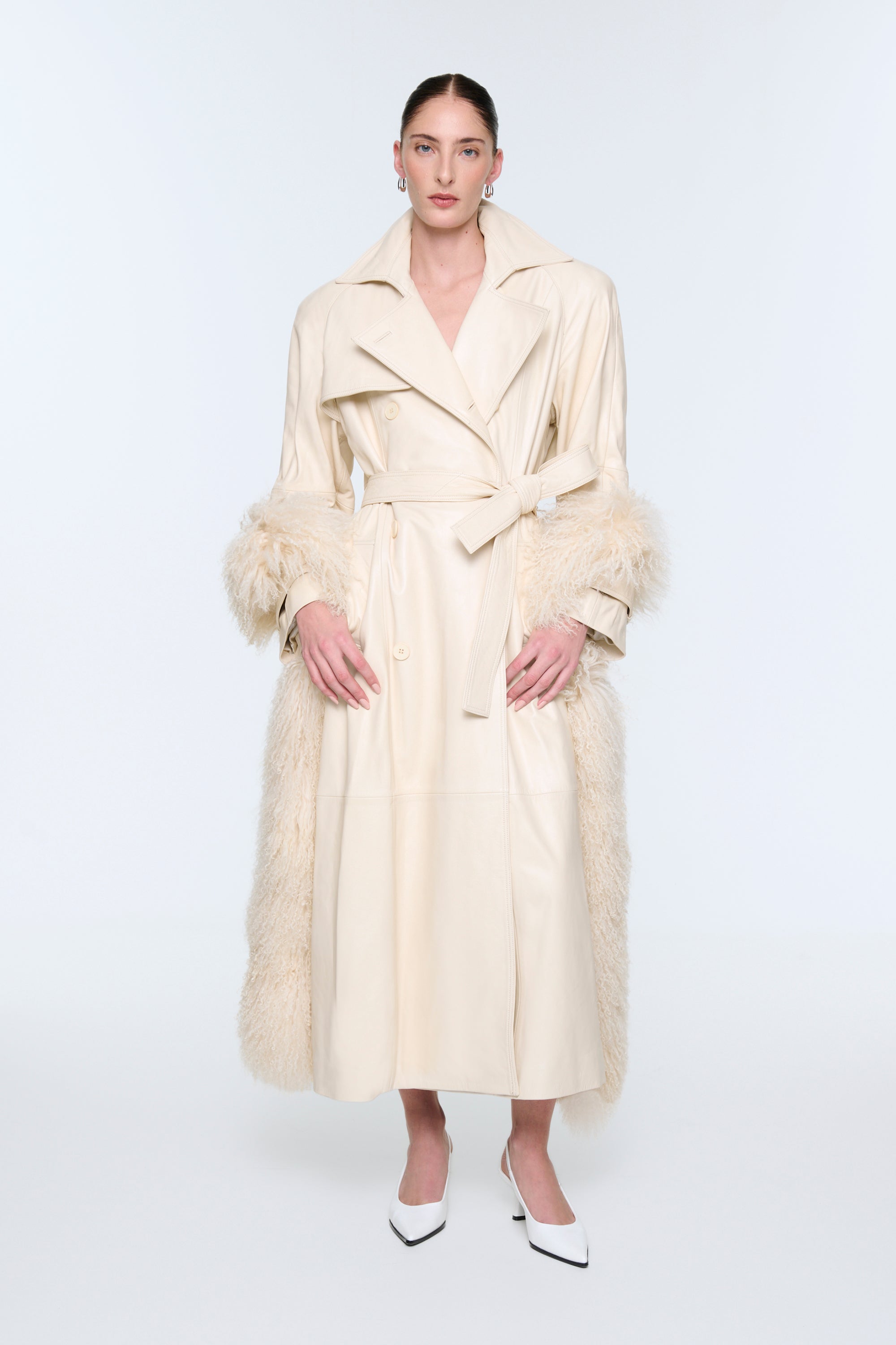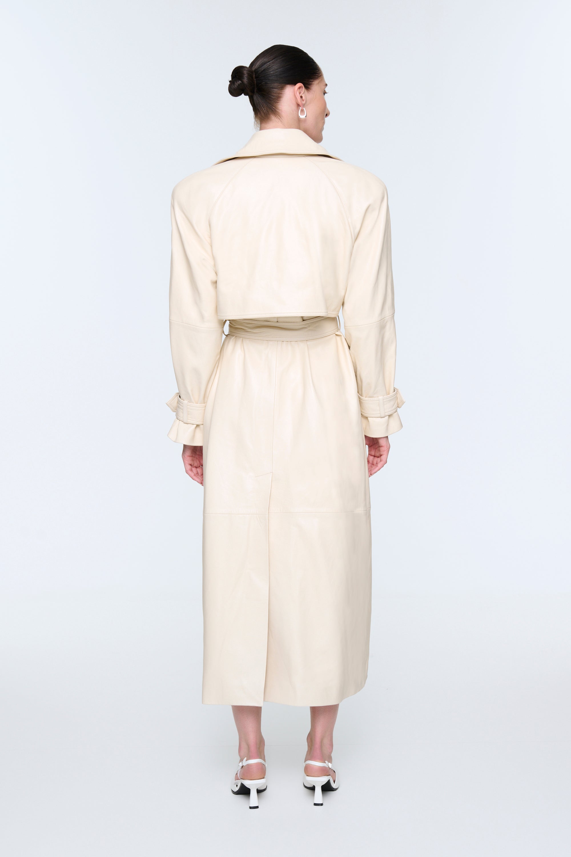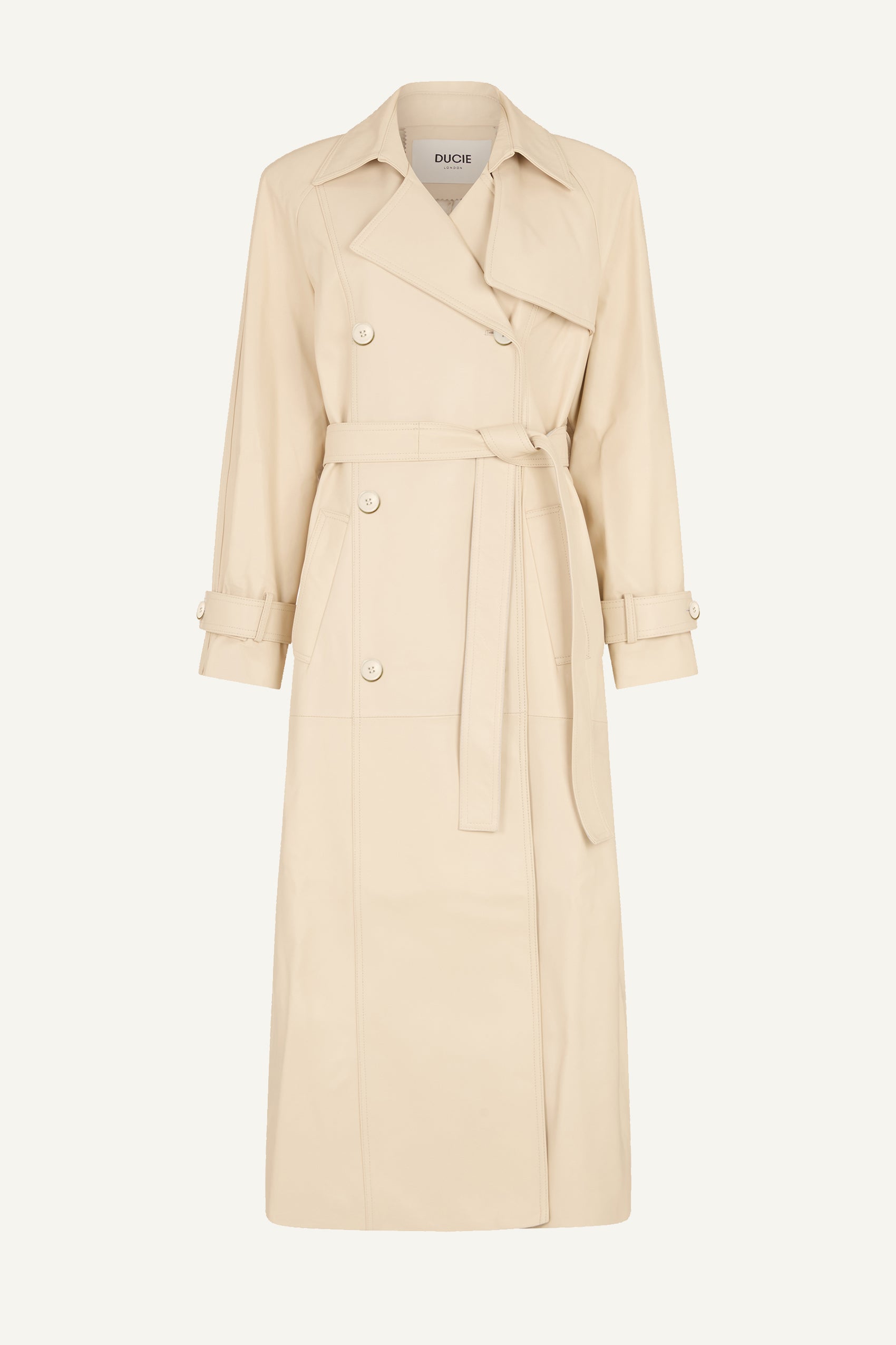 This coat will get you noticed. The incredibly soft, high quality leather is beautifully tailored into a classic double breasted trench complete with storm flap, shoulder pads and leather sash. This cocooning coat will be a constant in your wardrobe.