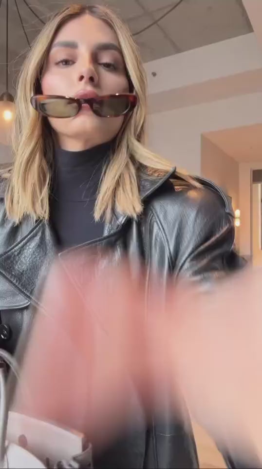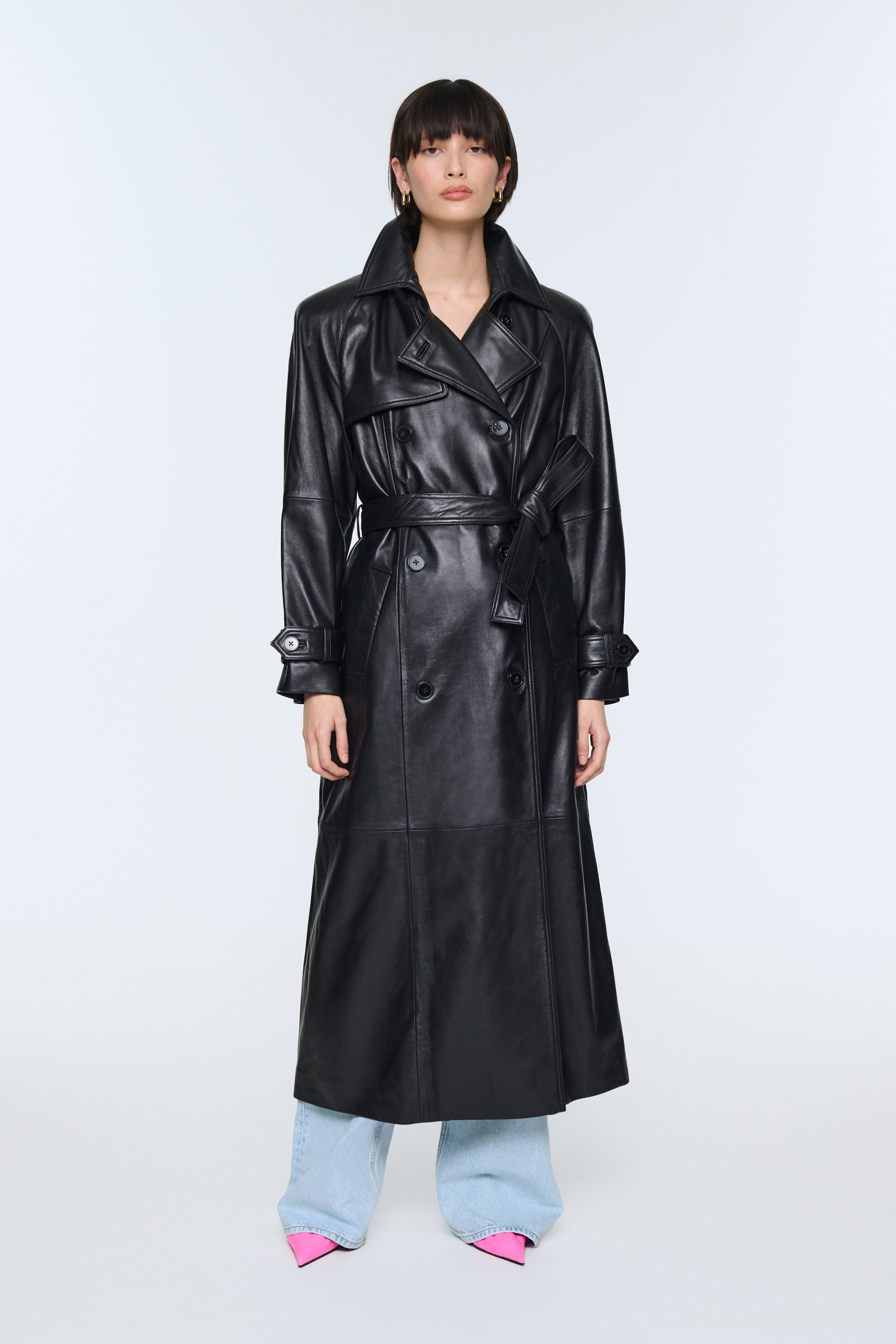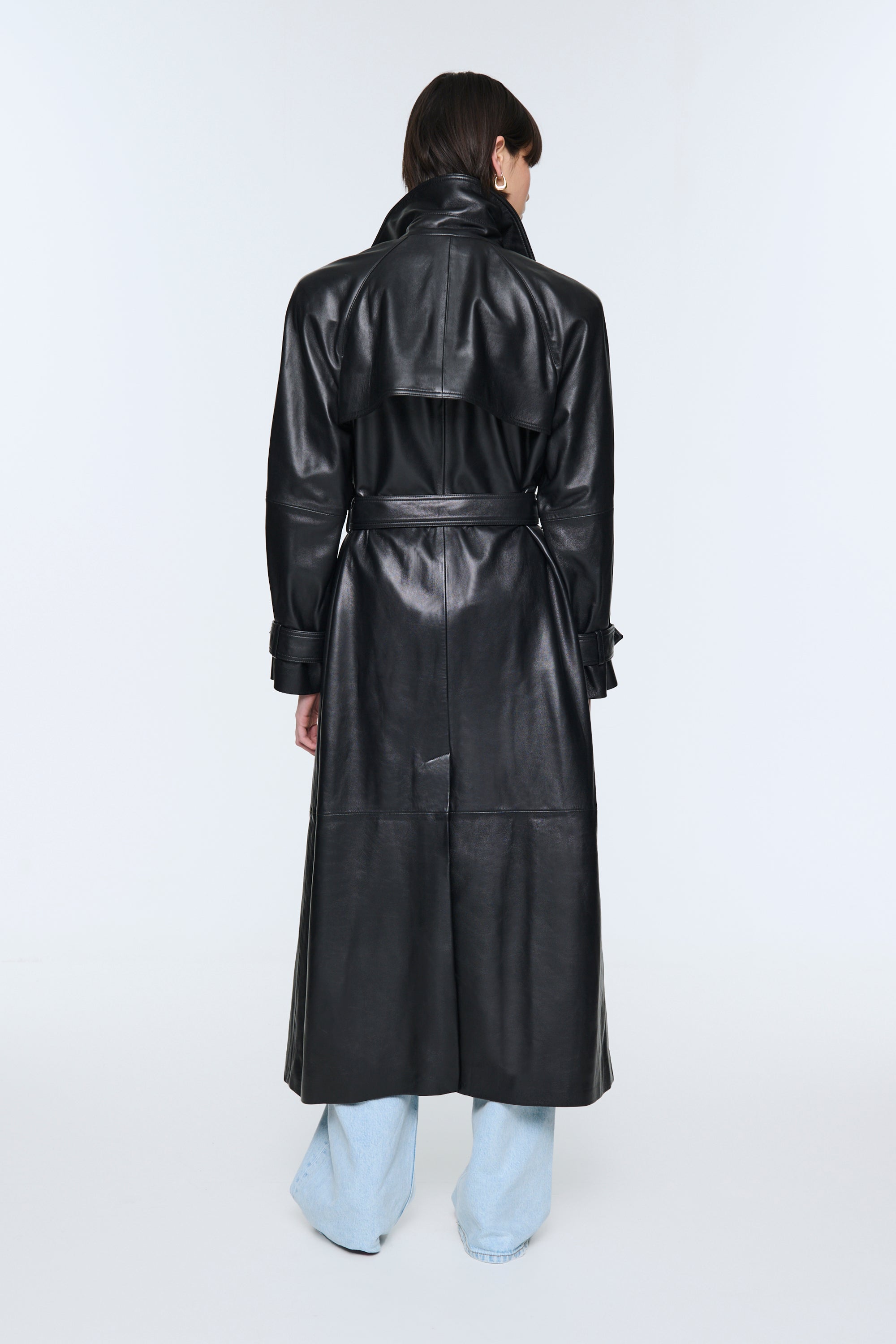 This coat will get you noticed. The incredibly soft, high quality leather is beautifully tailored into a classic double breasted trench complete with storm flap, shoulder pads and leather sash. This cocooning coat will be a constant in your wardrobe.