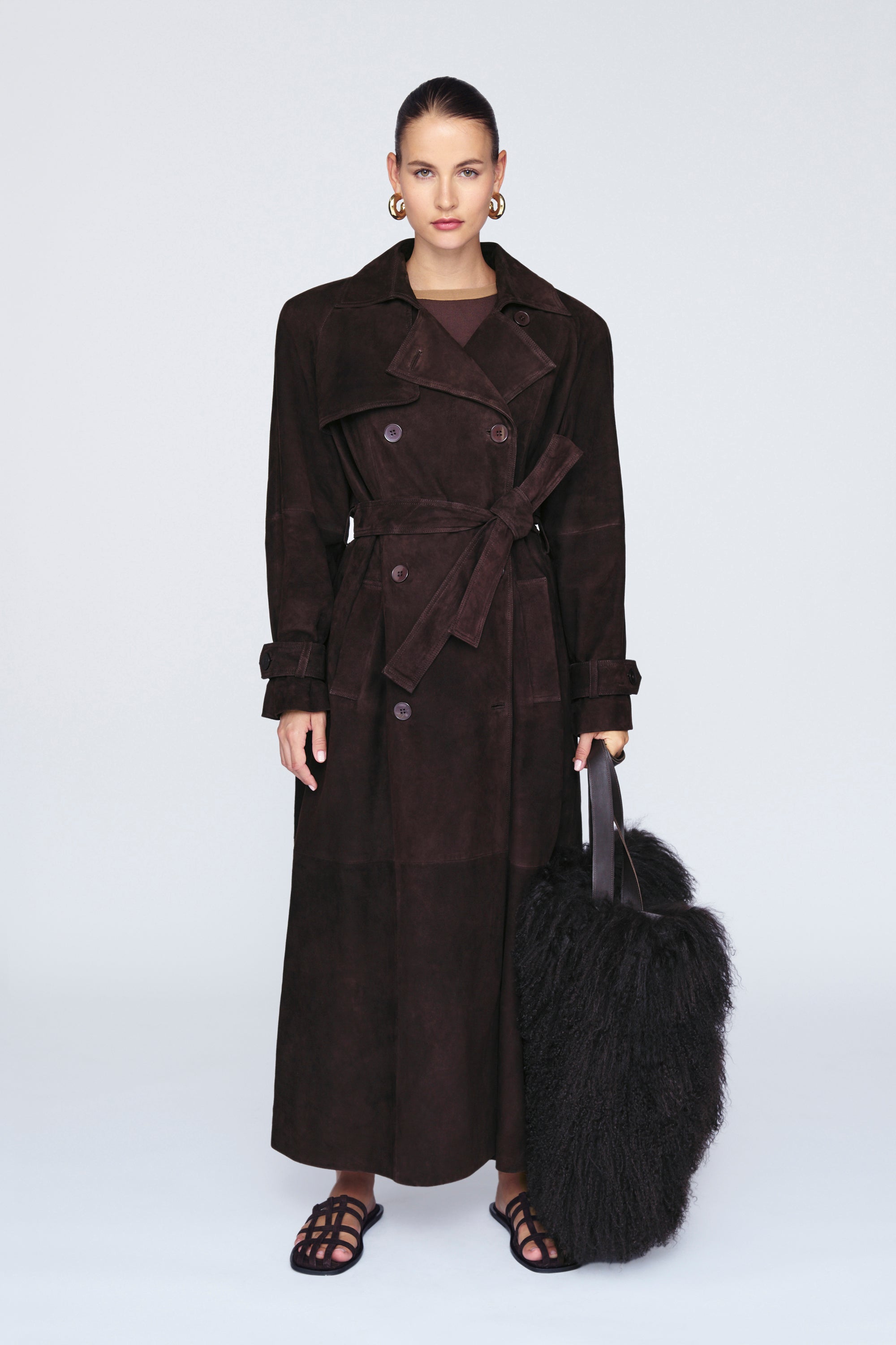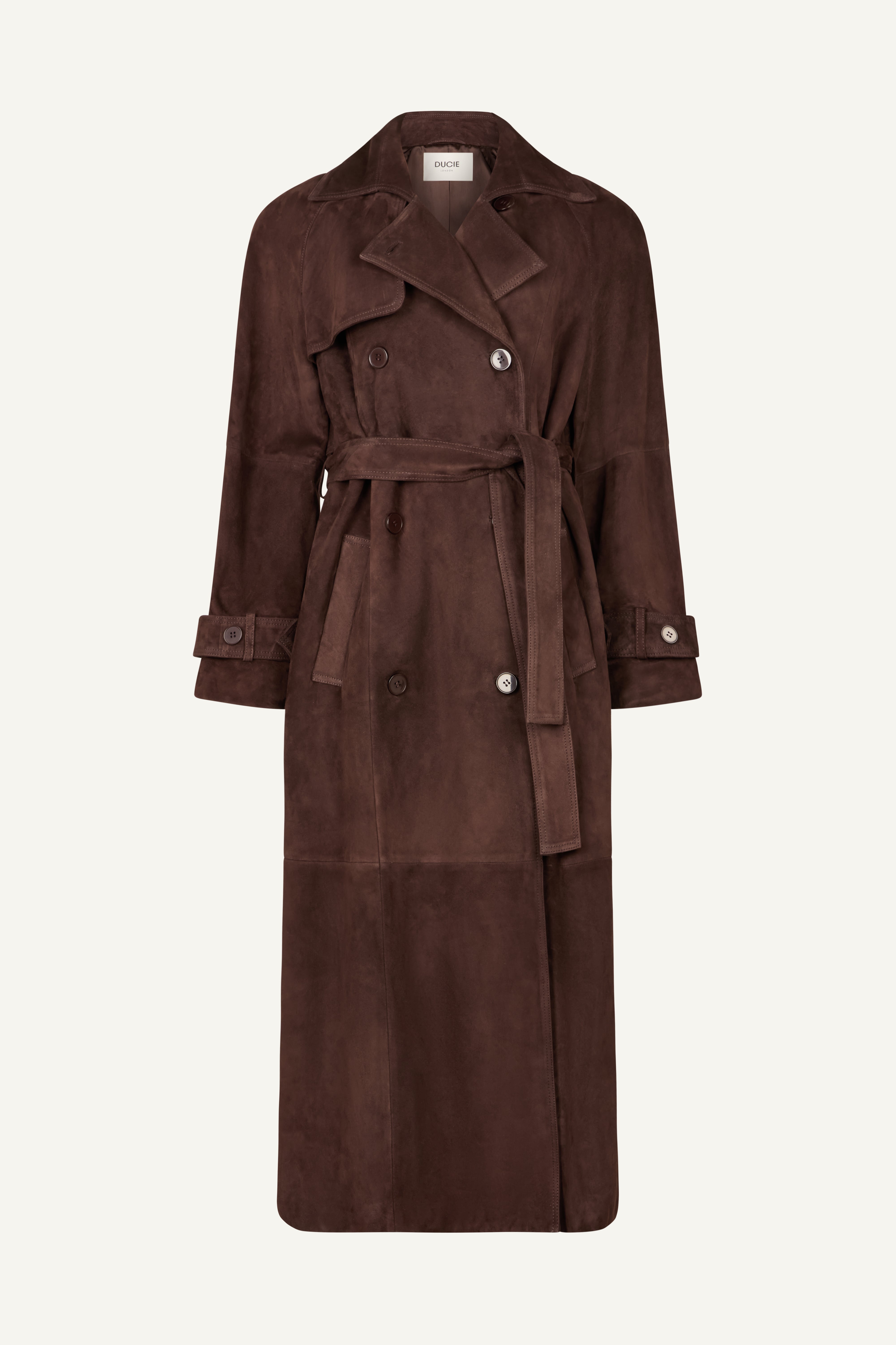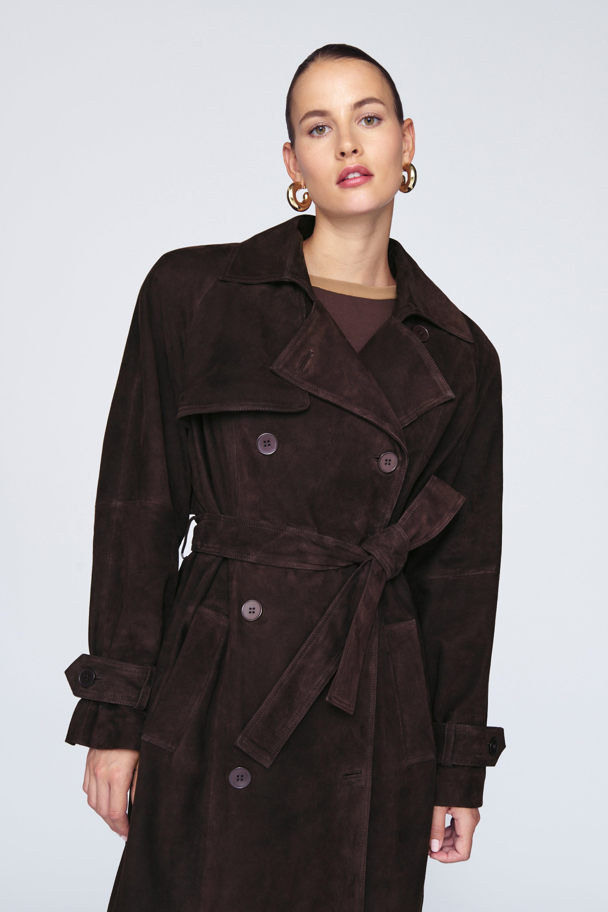This coat will get you noticed. The incredibly soft, high quality suede leather is beautifully tailored into a classic double breasted trench complete with storm flap and leather sash. This cocooning coat will be a constant in your wardrobe.