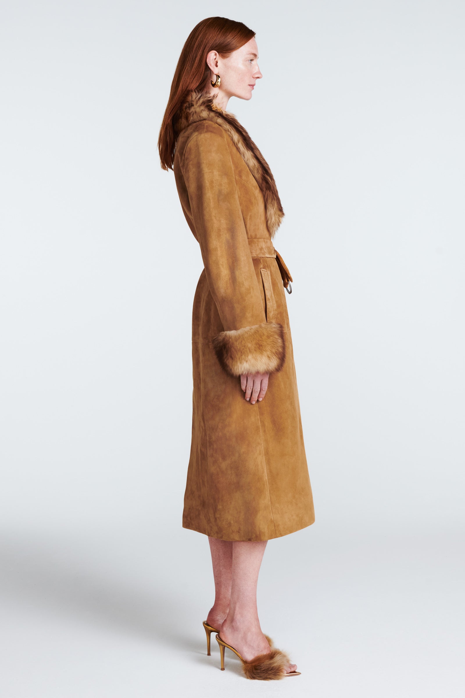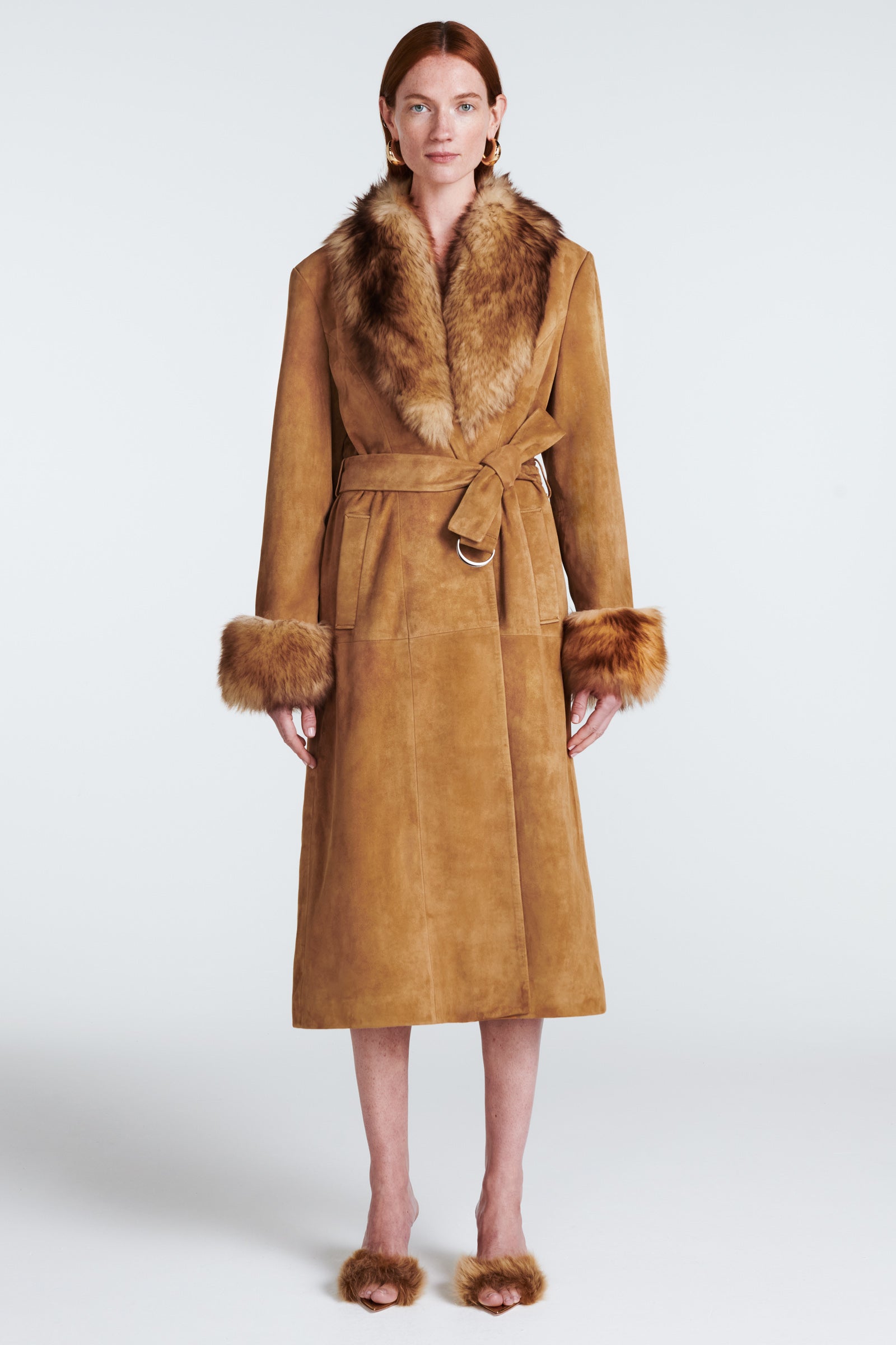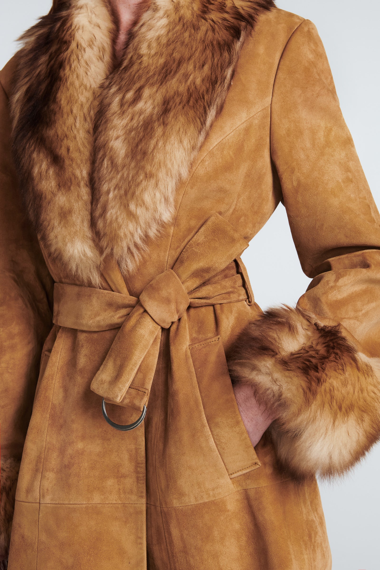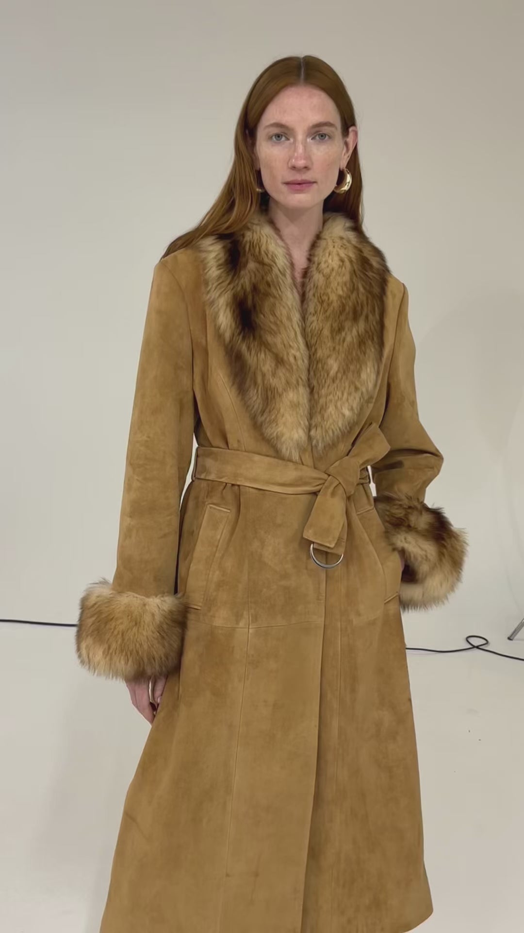 This stunning long suede coat takes its inspiration from the timeless elegance of the Old Hollywood glamour era. Daphne is adorned with a plush faux fur collar, adding a dramatic and cozy touch, featuring classic welt pockets and a long belt to cinch the waist.