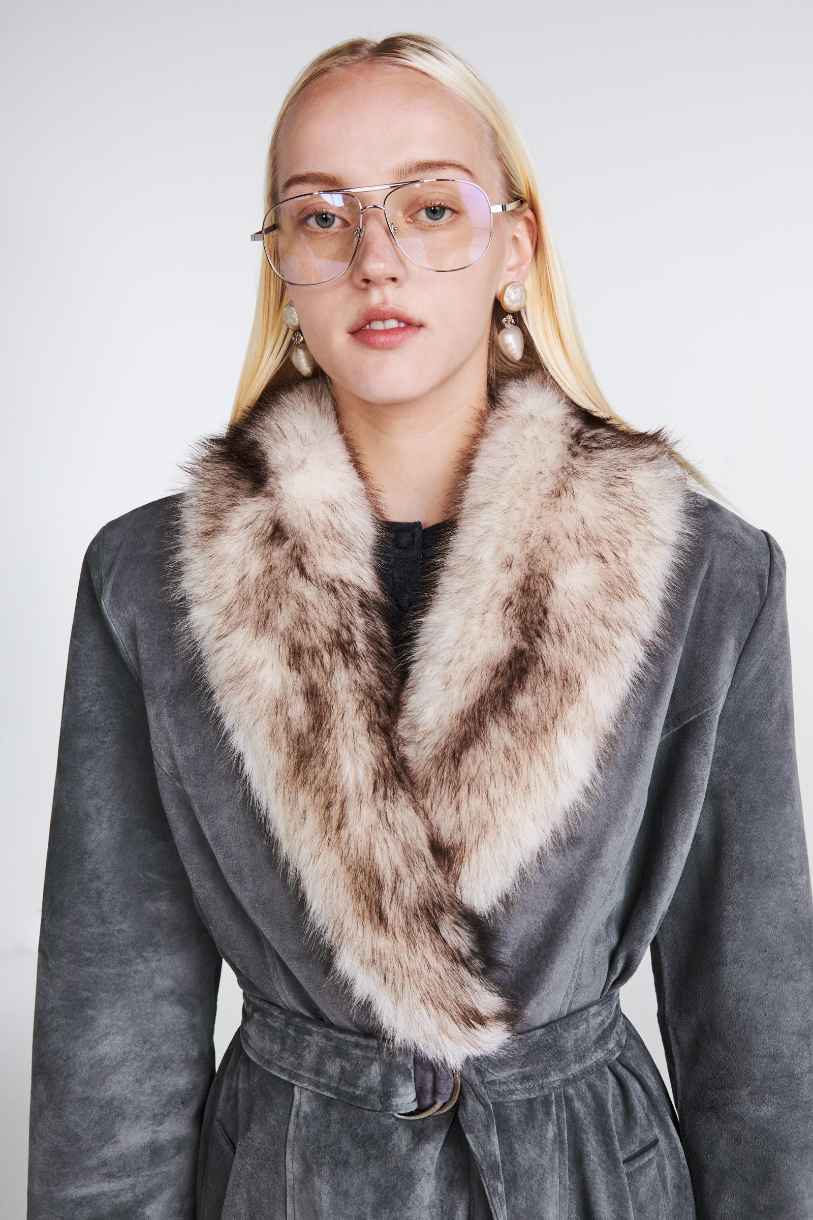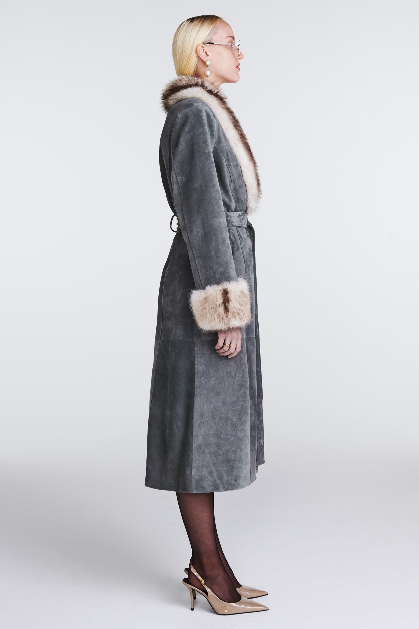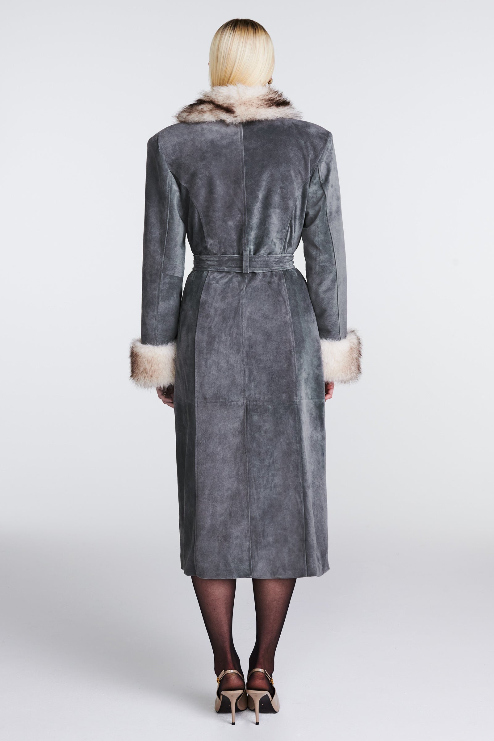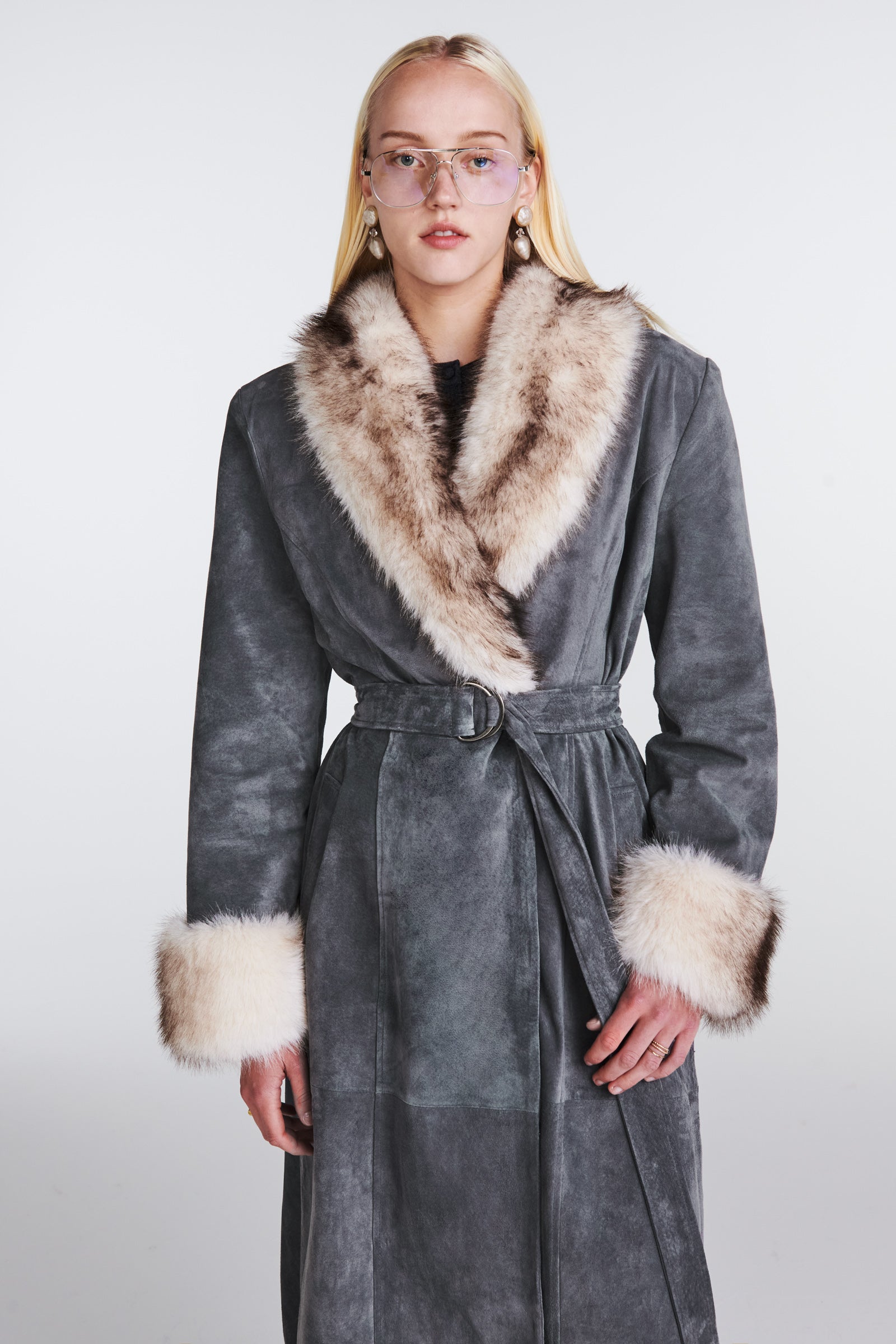 This stunning long suede coat takes its inspiration from the timeless elegance of the Old Hollywood glamour era. Daphne is adorned with a plush faux fur collar, adding a dramatic and cozy touch, featuring classic welt pockets and a long belt to cinch the waist.