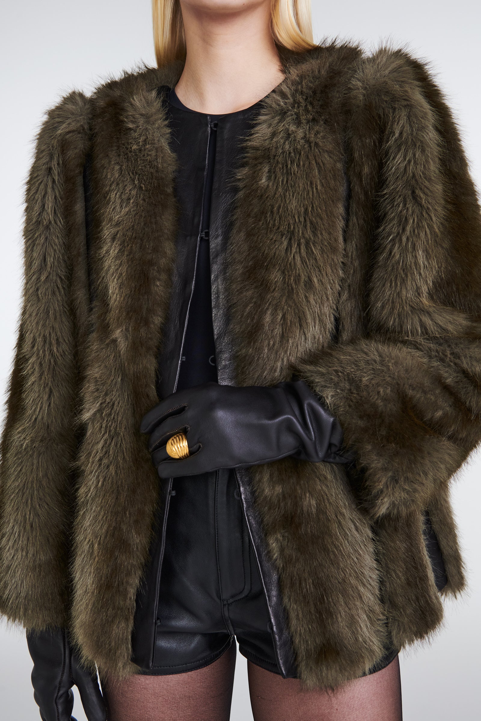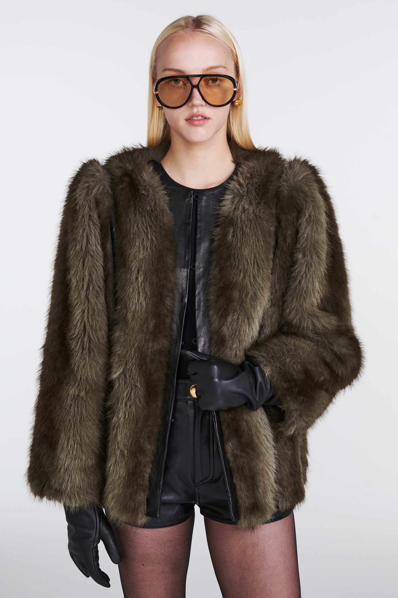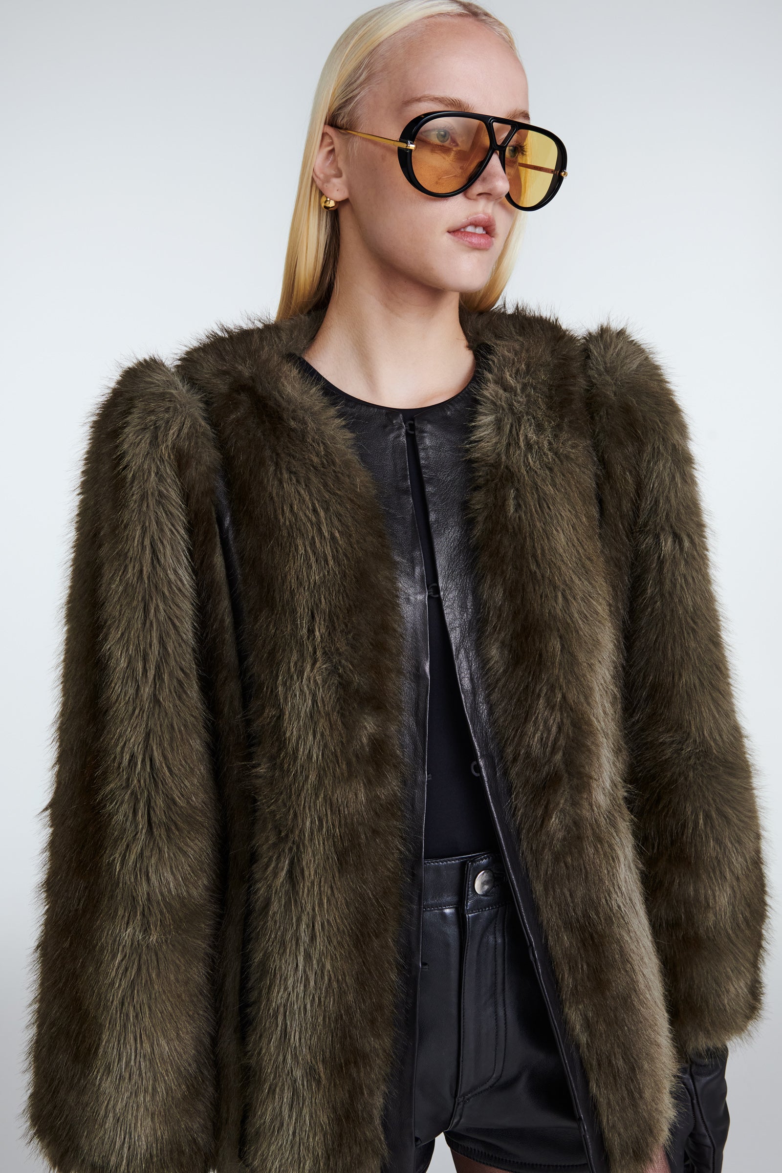 Sumptuous hip-length fur coat features imaginative structural design, combining leather and faux fur panels, with hook fastening and round neckline giving effortless chic look.