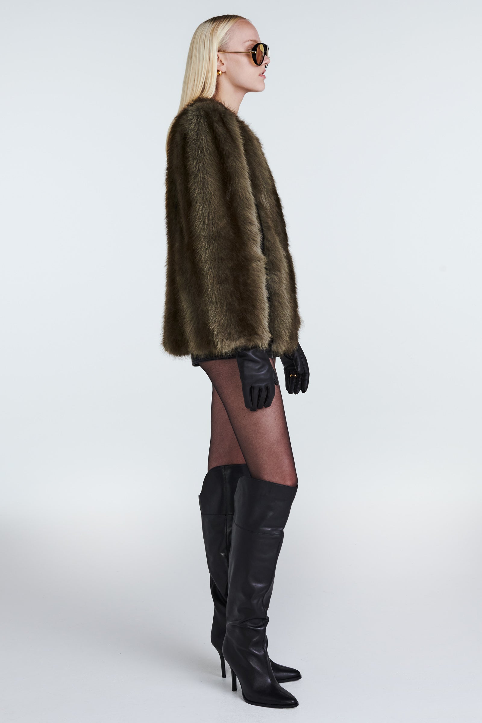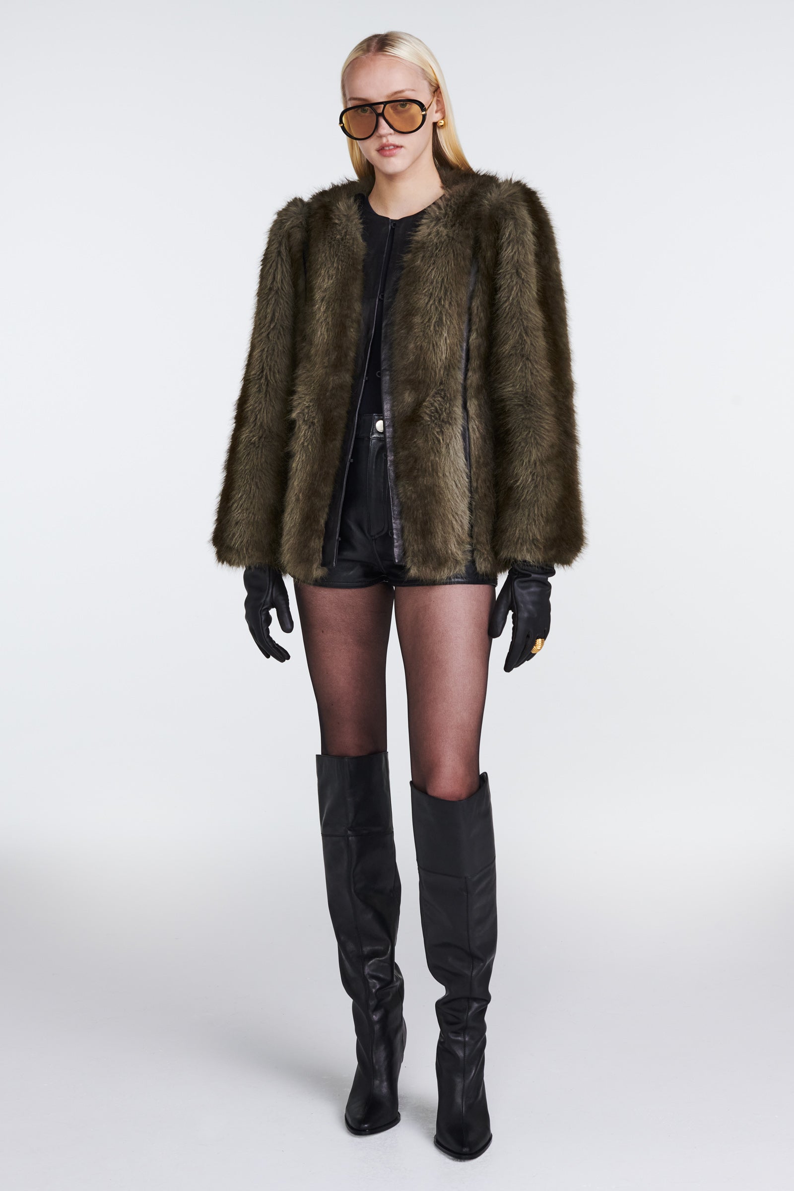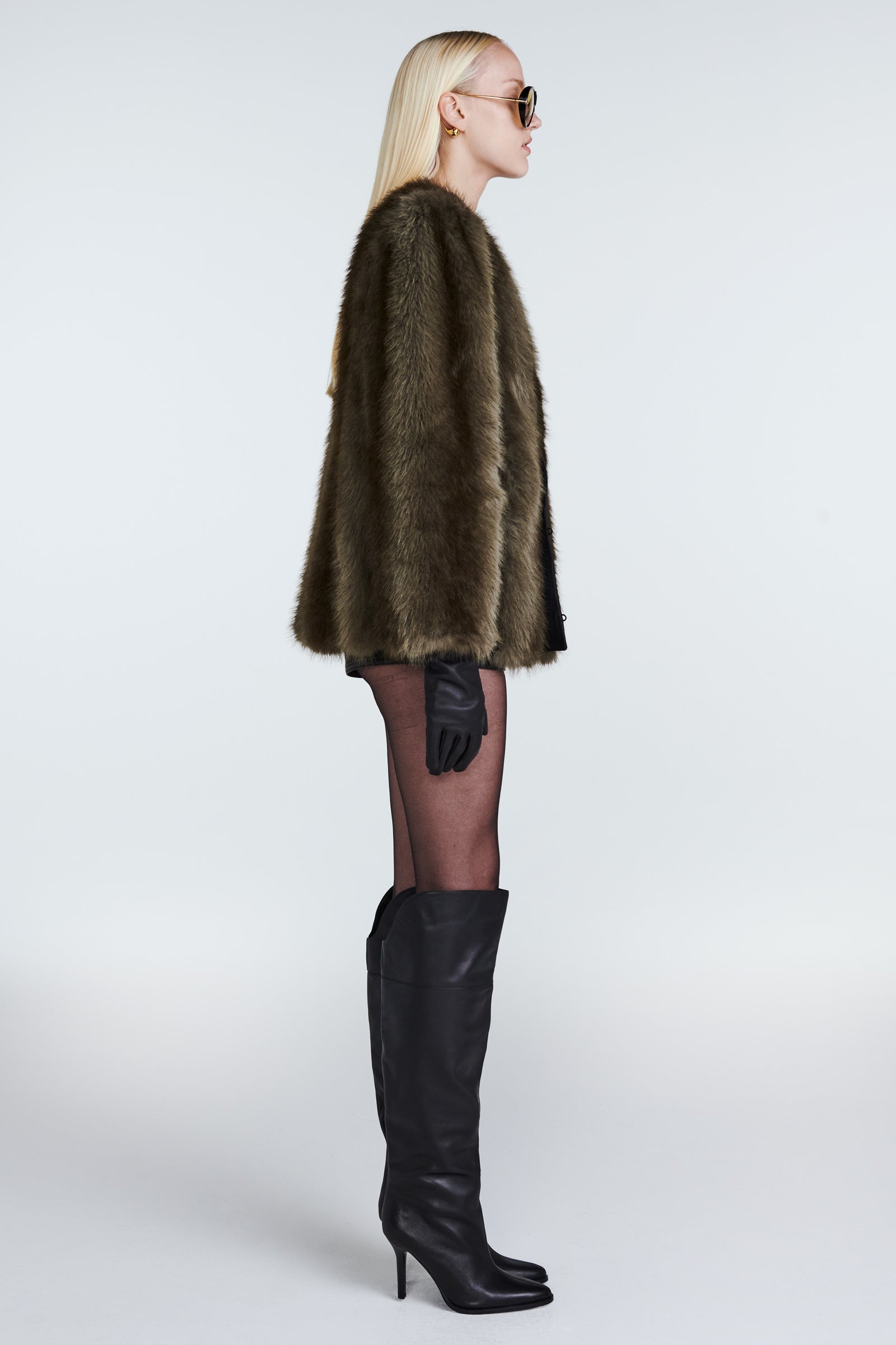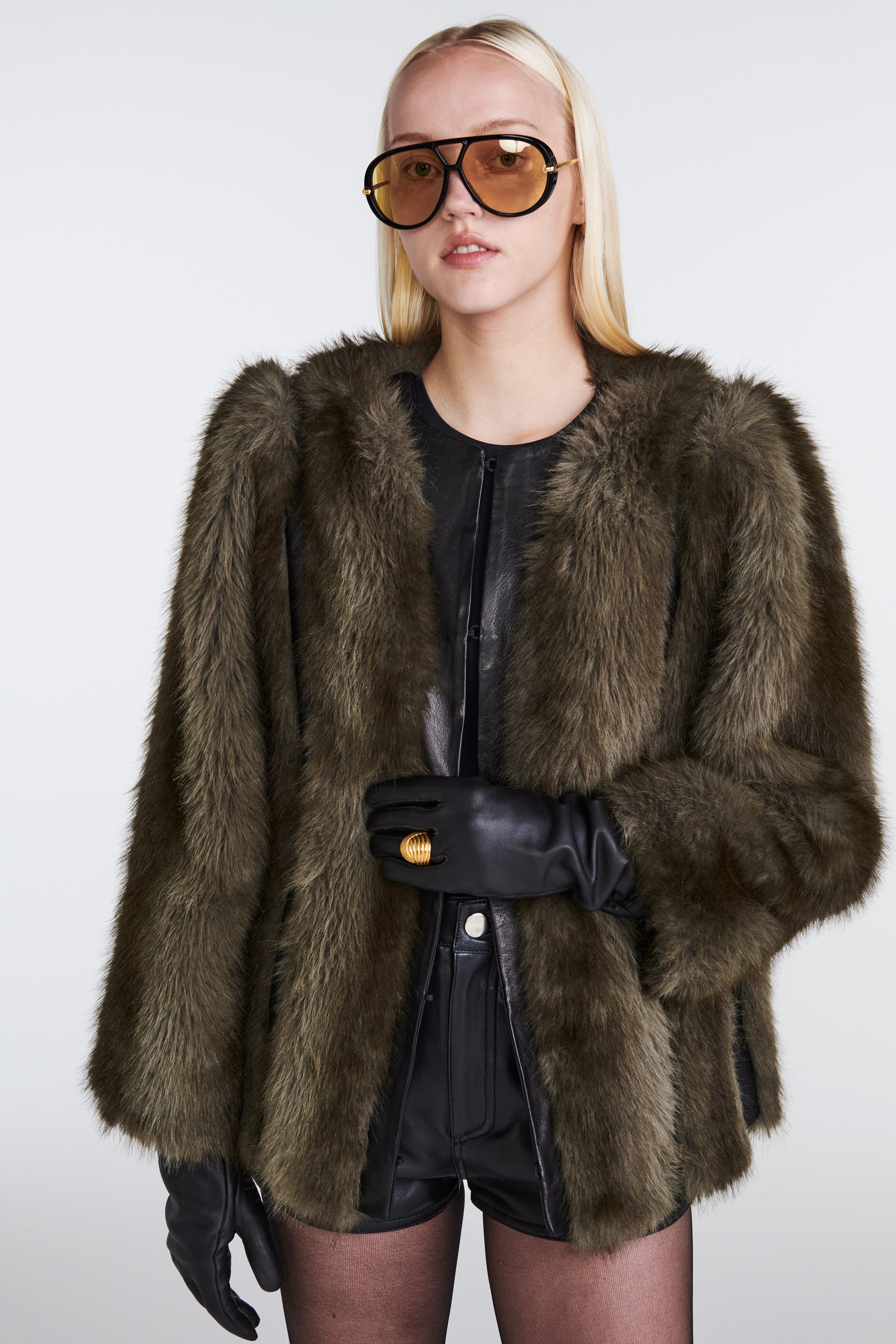 Sumptuous hip-length fur coat features imaginative structural design, combining leather and faux fur panels, with hook fastening and round neckline giving effortless chic look.