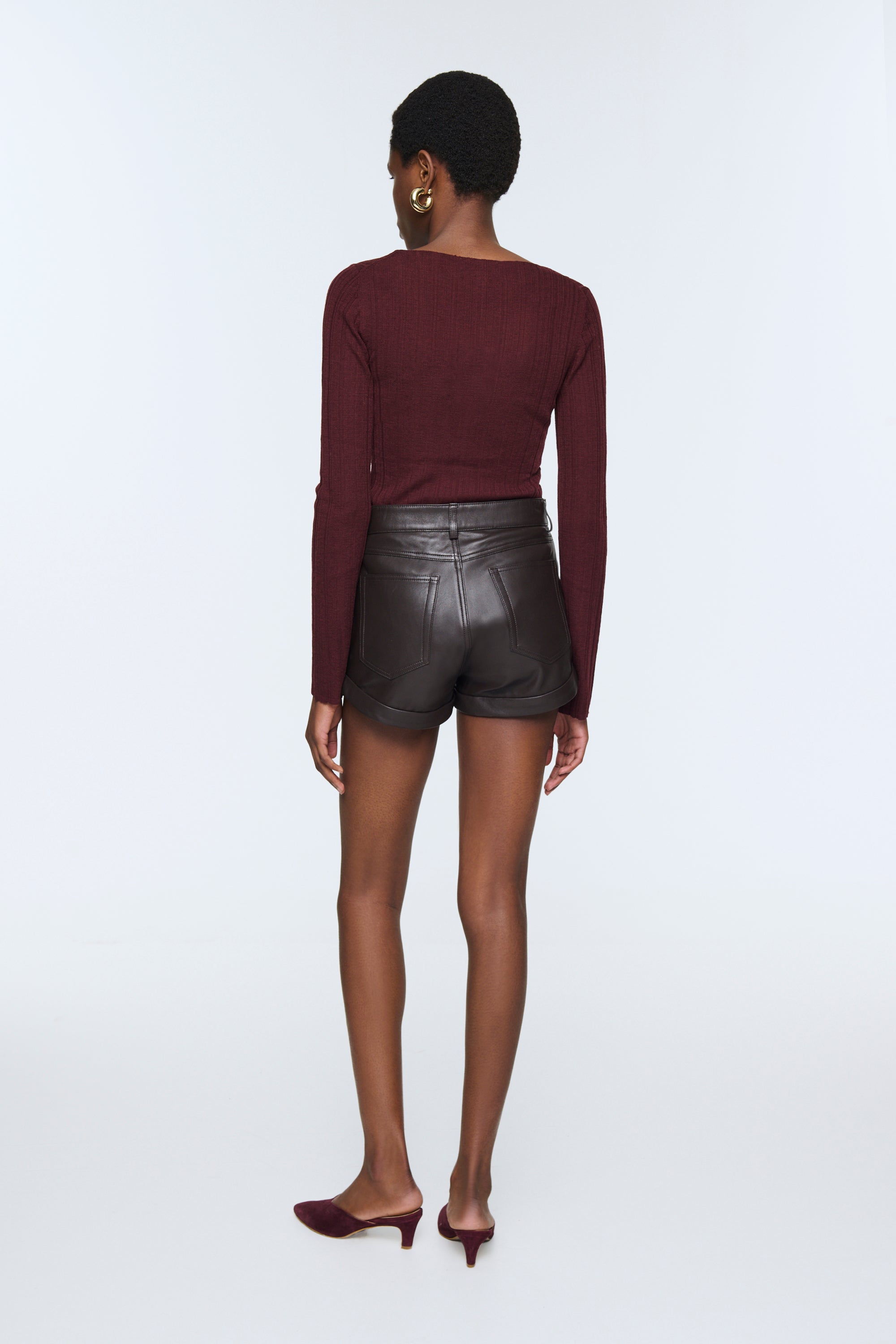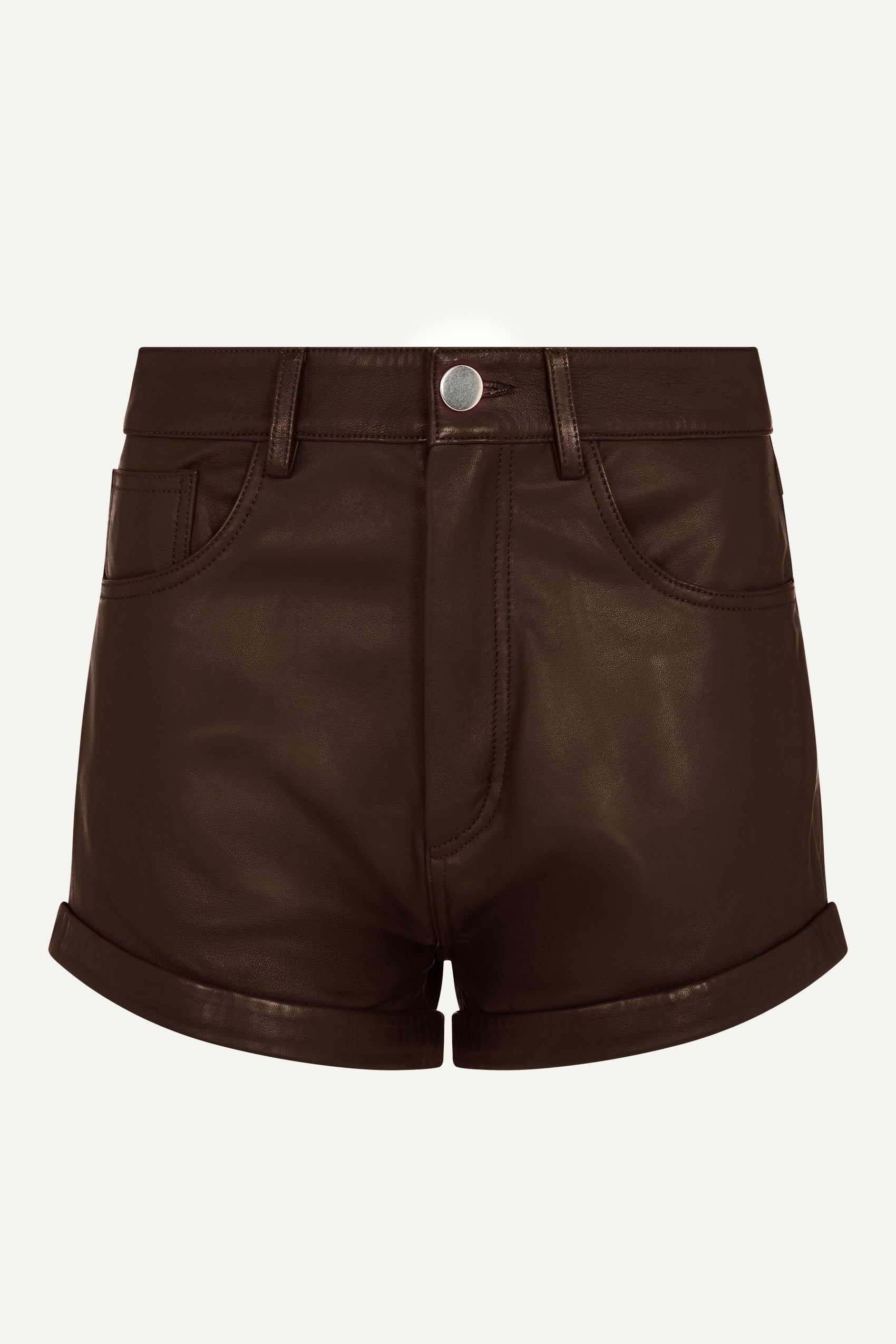 We adore these leather shorts boasting a denim-style look, sure to steal the spotlight in your spring wardrobe. With timeless details and a high-waist cut, this pair features rolled hems for added flair. They seamlessly transition from casual to dressed-up with a quick shoe change, or pair elegantly with tights for added versatility.