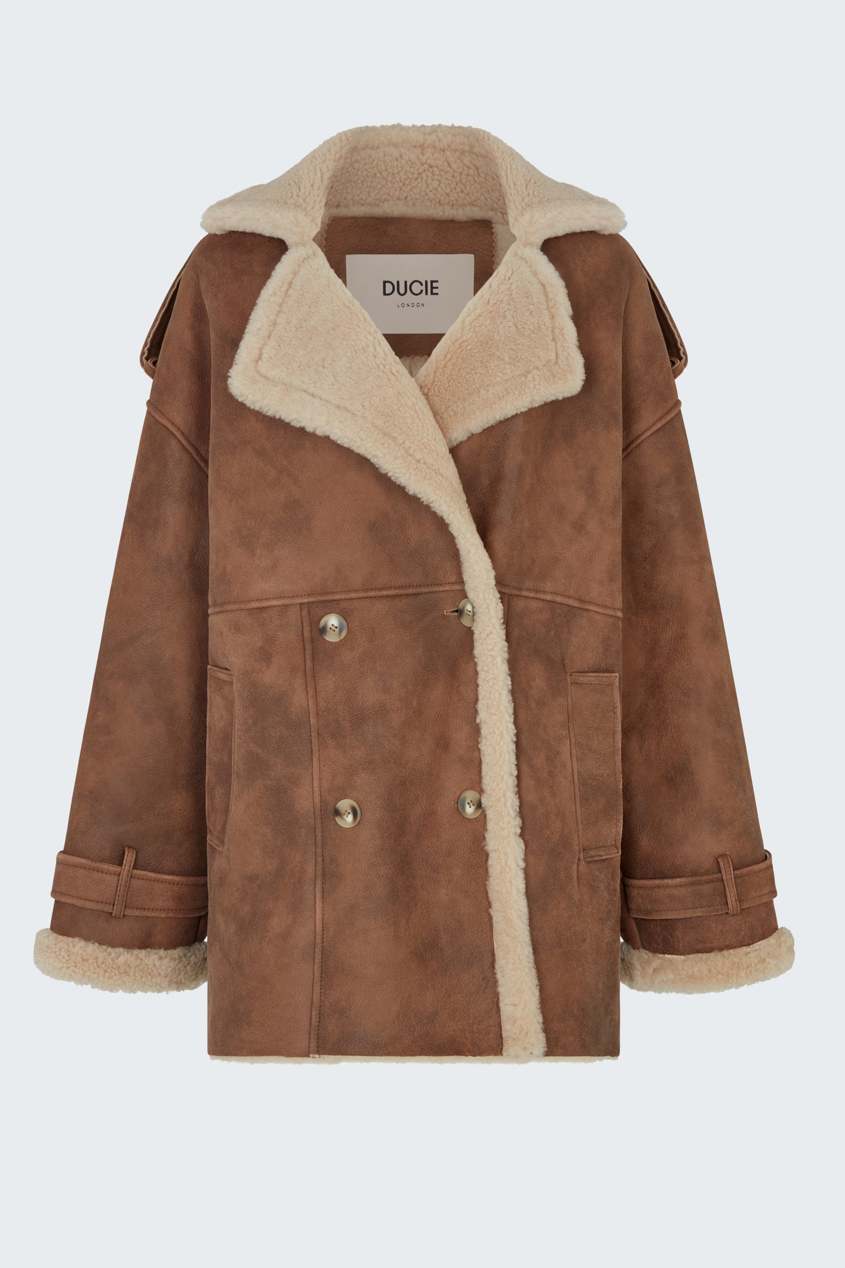 A sweeping coat made from the softest caramel shearling that peeks out from its soft outer layer. We love the dropped shoulders with epaulettes that play with formality, the generous lapels and the clever cinched waist detail that creates a slimmer silhouette at the back.