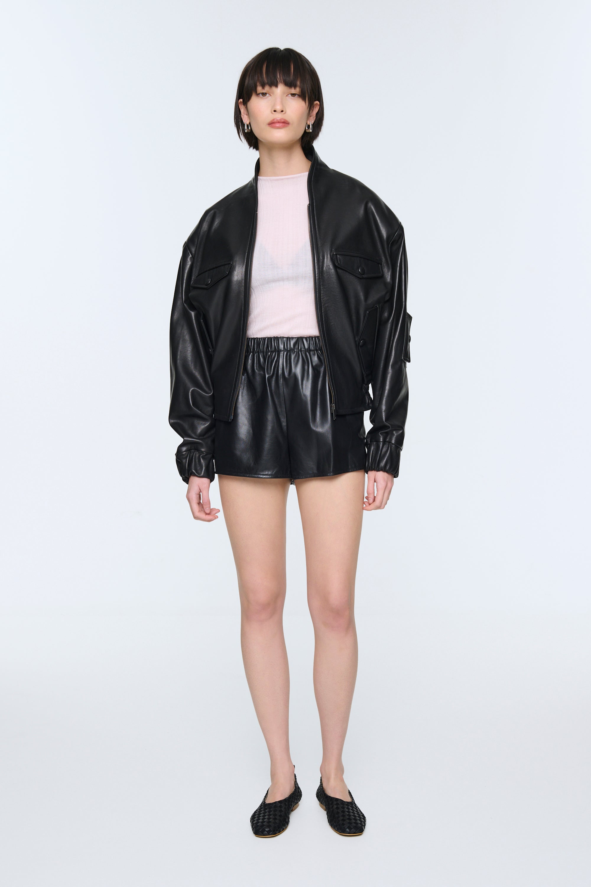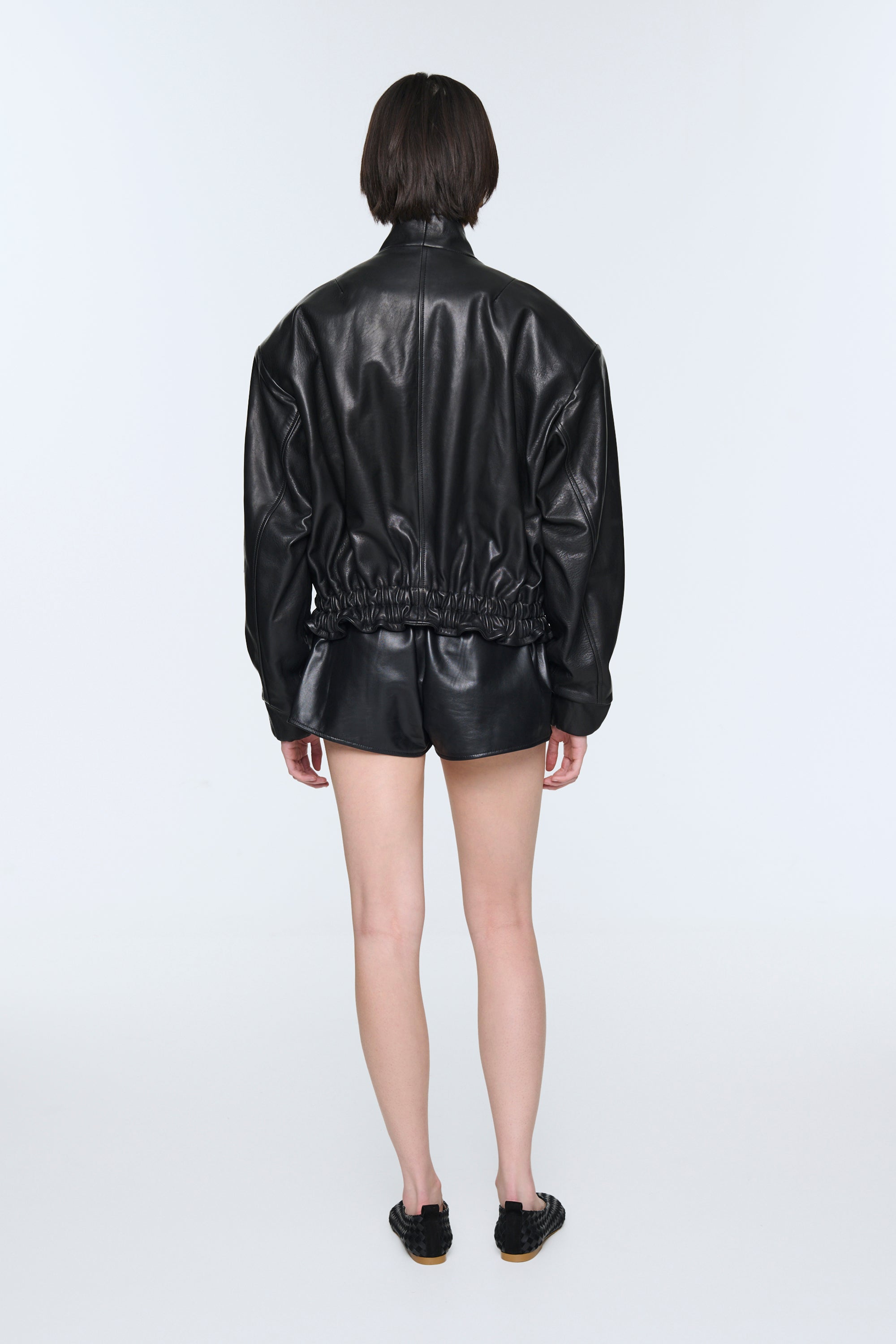 This beautifully cut jacket with classic bomber jacket styling falls at a flattering length on the hip. Featuring fabulous details, including pockets, leather covered ribbed cuffs and waistband and the all important stand collar make this jacket feel a cut above.