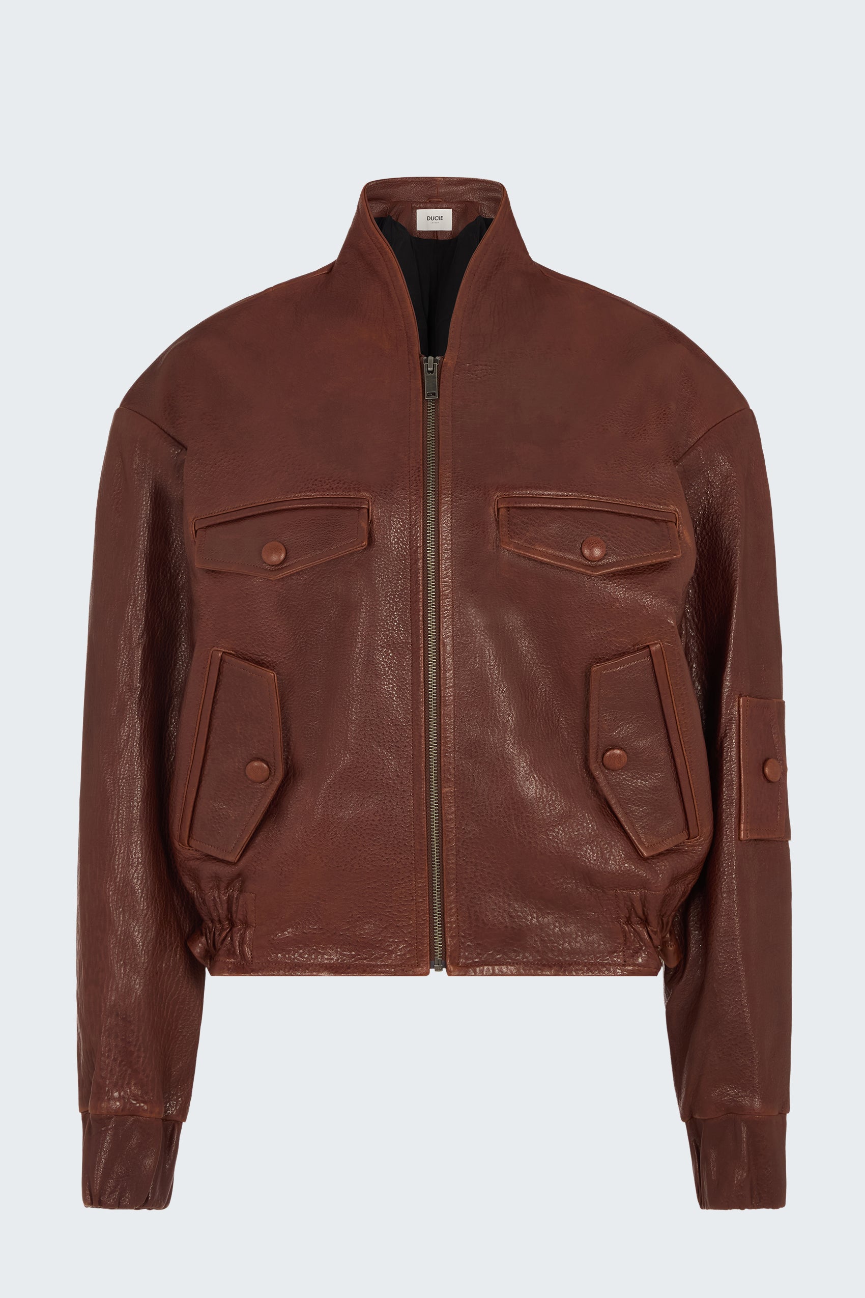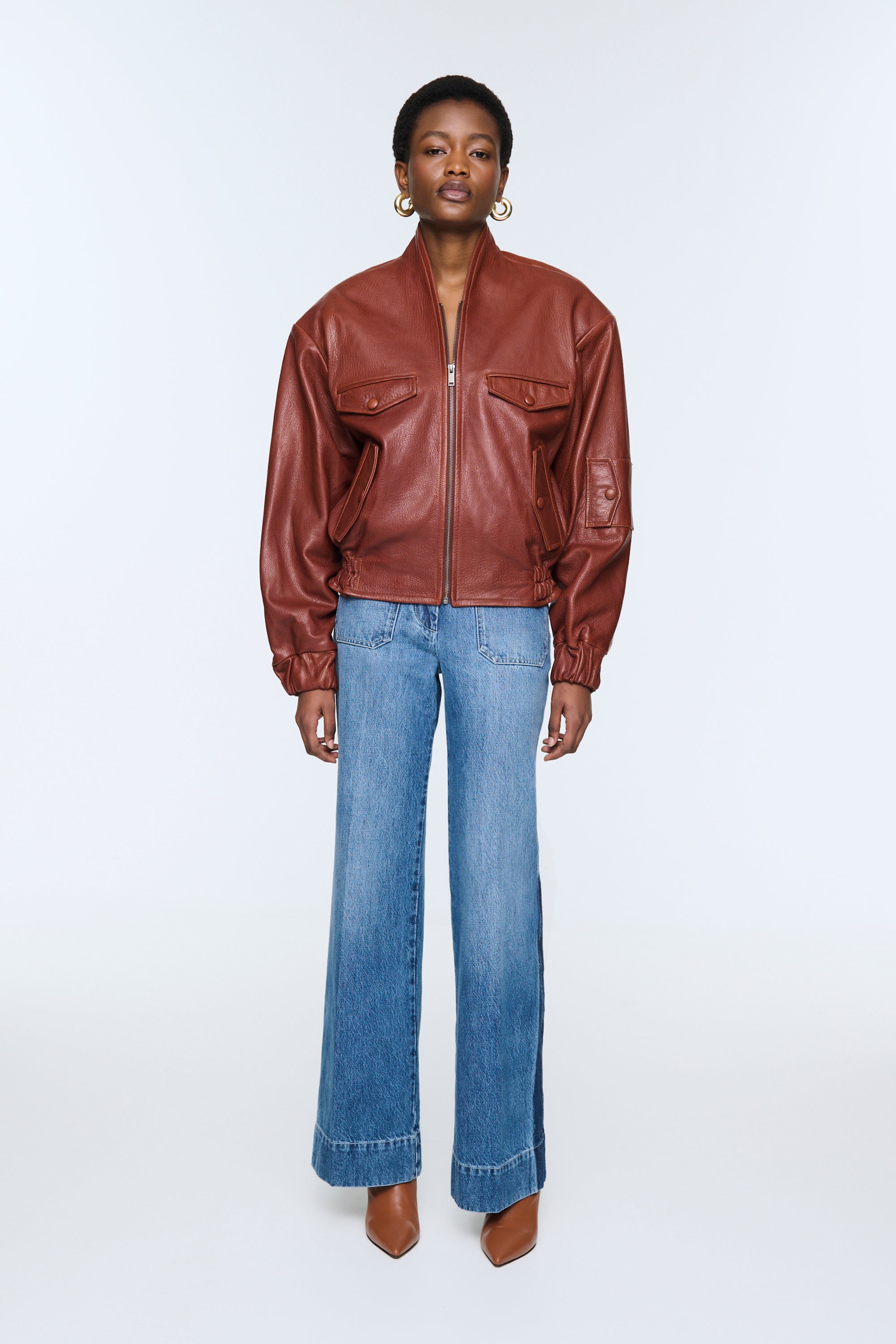 This beautifully cut jacket with classic bomber jacket styling falls at a flattering length on the hip. Featuring fabulous details, including pockets, leather covered ribbed cuffs and waistband and the all important stand collar make this jacket feel a cut above.