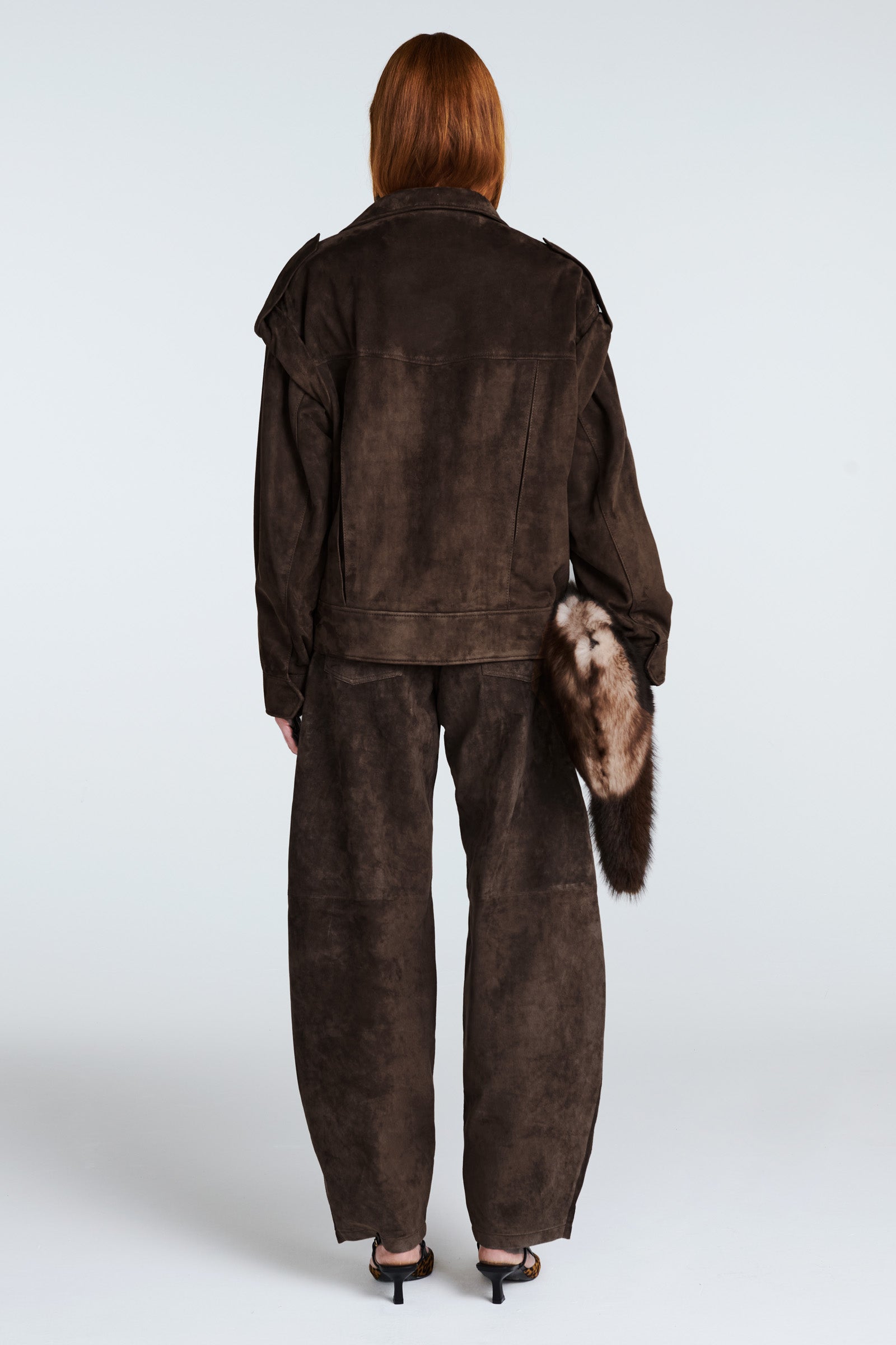This soft suede jacket plays with proportion to perfection. We love the boxy cut teamed with epaulettes and trench coat-style gun flaps, which house beautifully concealed, slanted pockets for a practical touch. Add subtle press fastenings and a gently rounded collar and you have the perfect jacket.