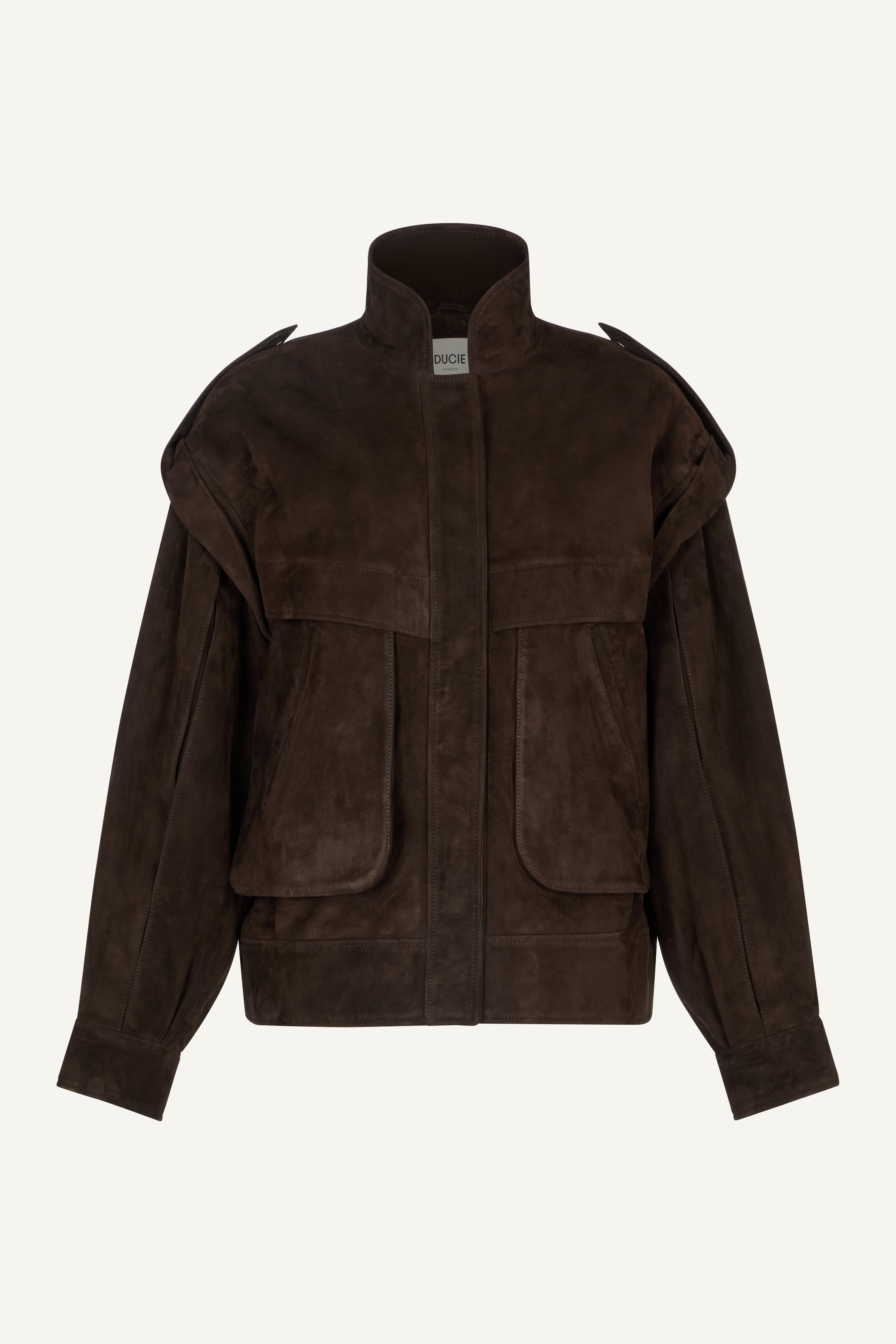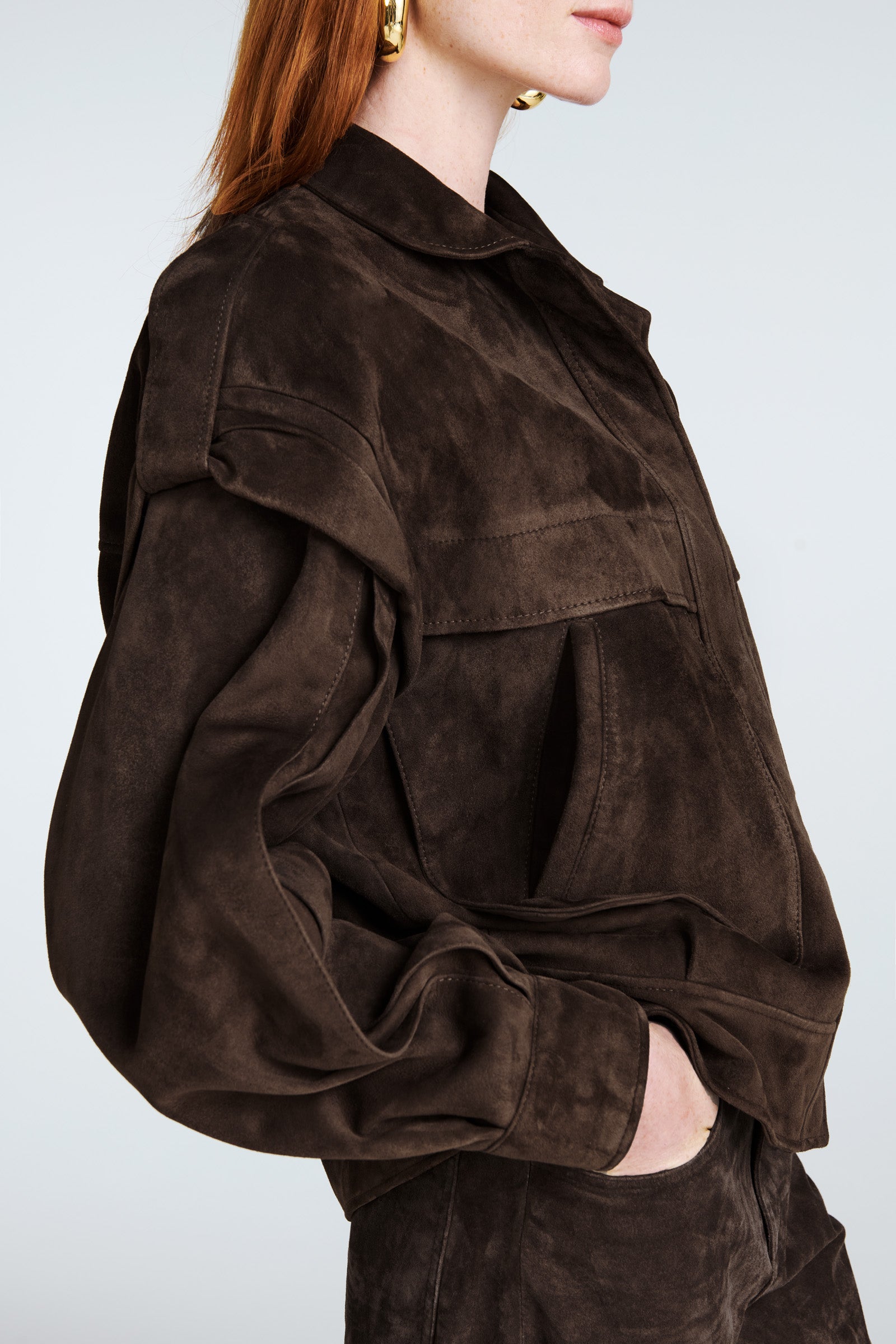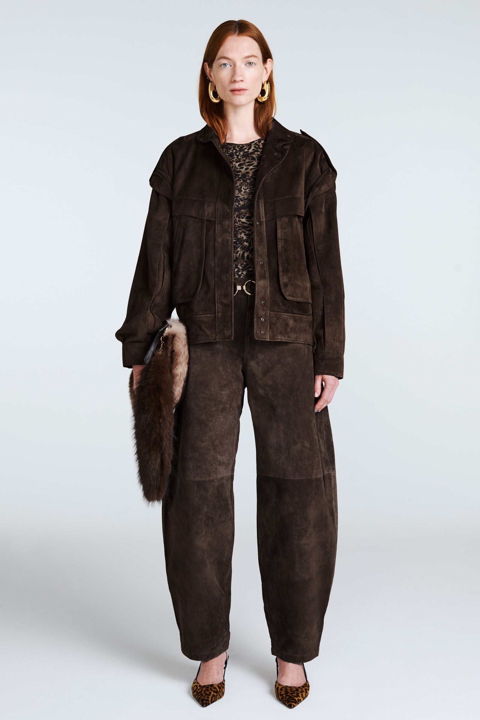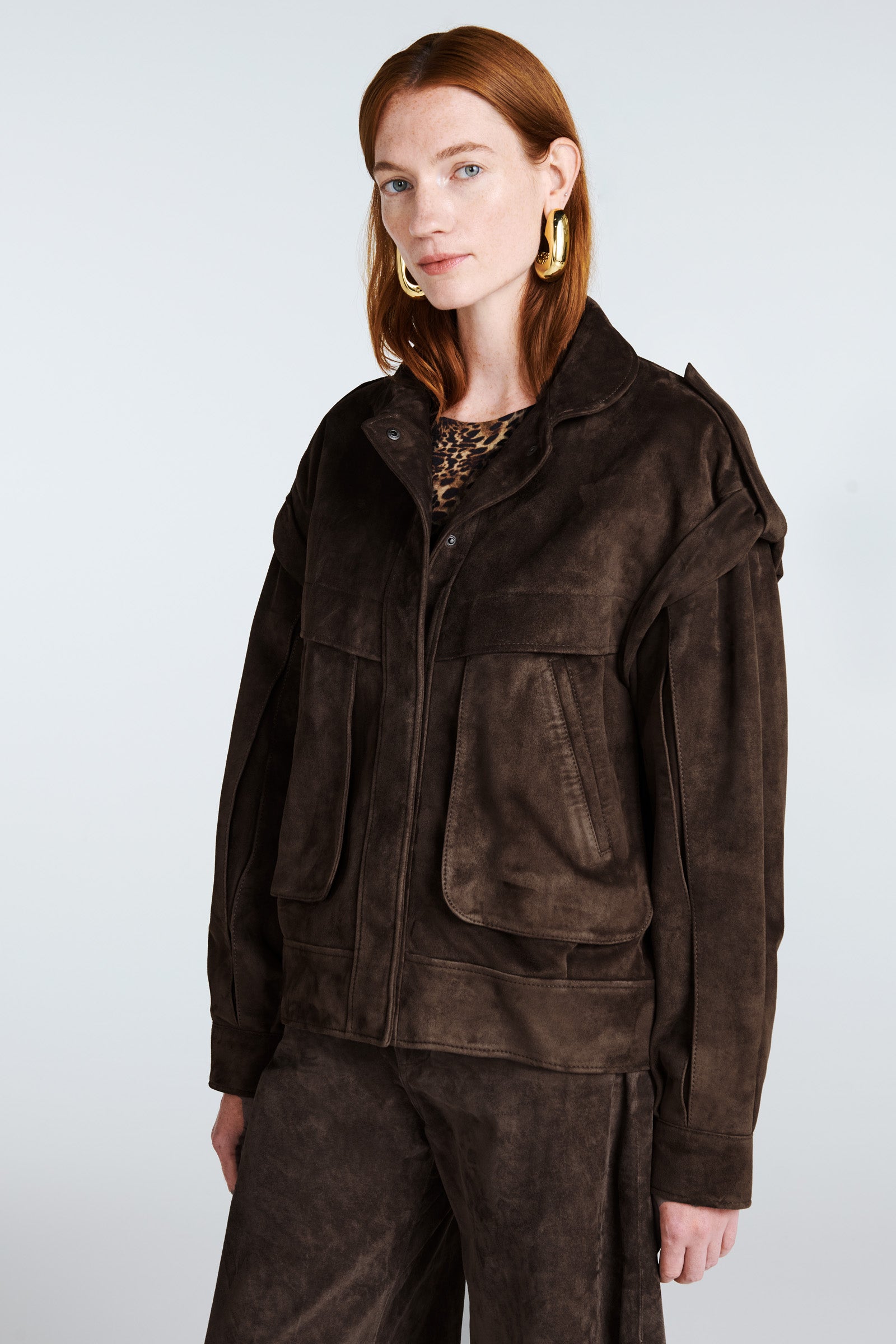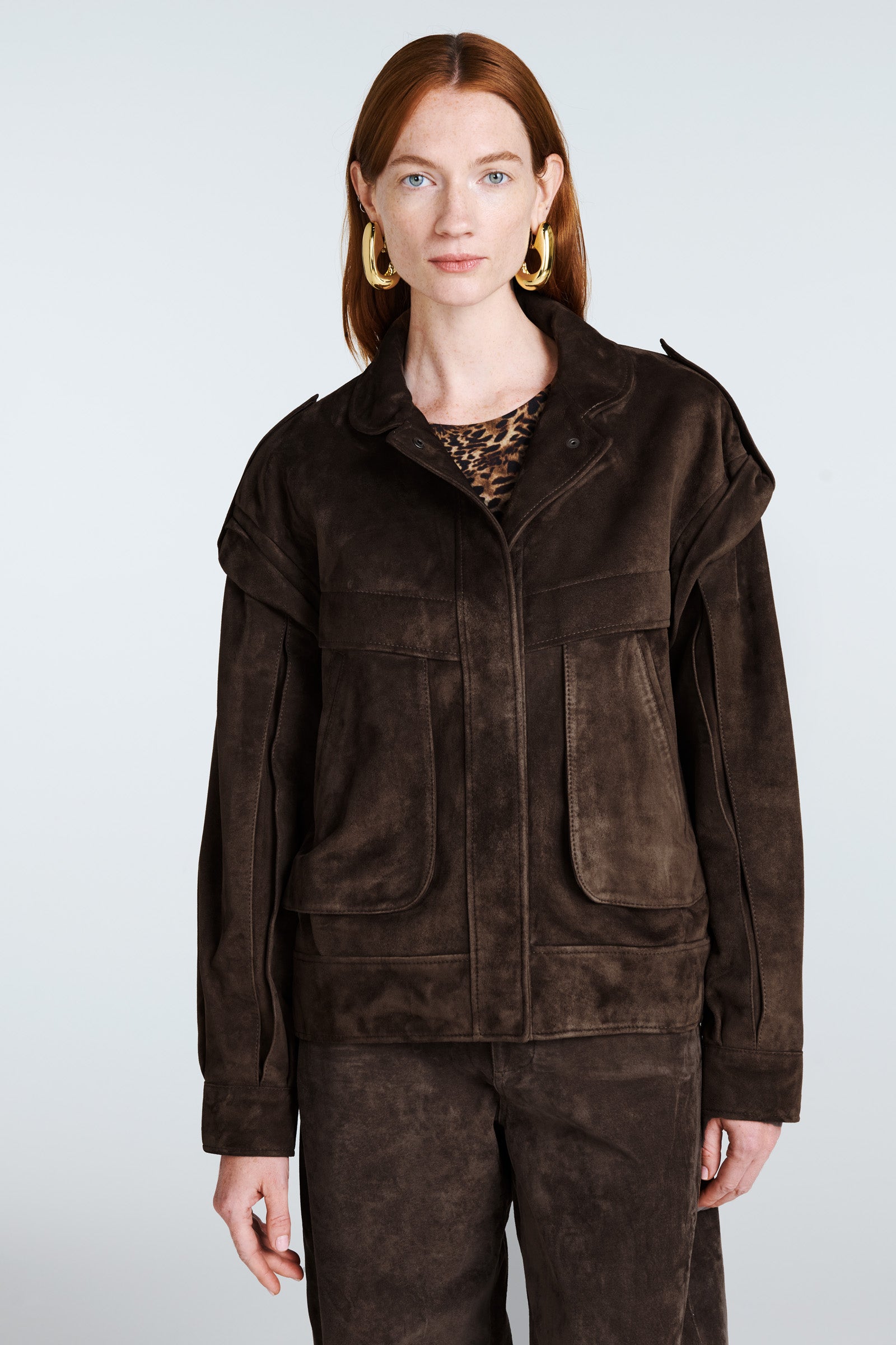 This soft suede jacket plays with proportion to perfection. We love the boxy cut teamed with epaulettes and trench coat-style gun flaps, which house beautifully concealed, slanted pockets for a practical touch. Add subtle press fastenings and a gently rounded collar and you have the perfect jacket.