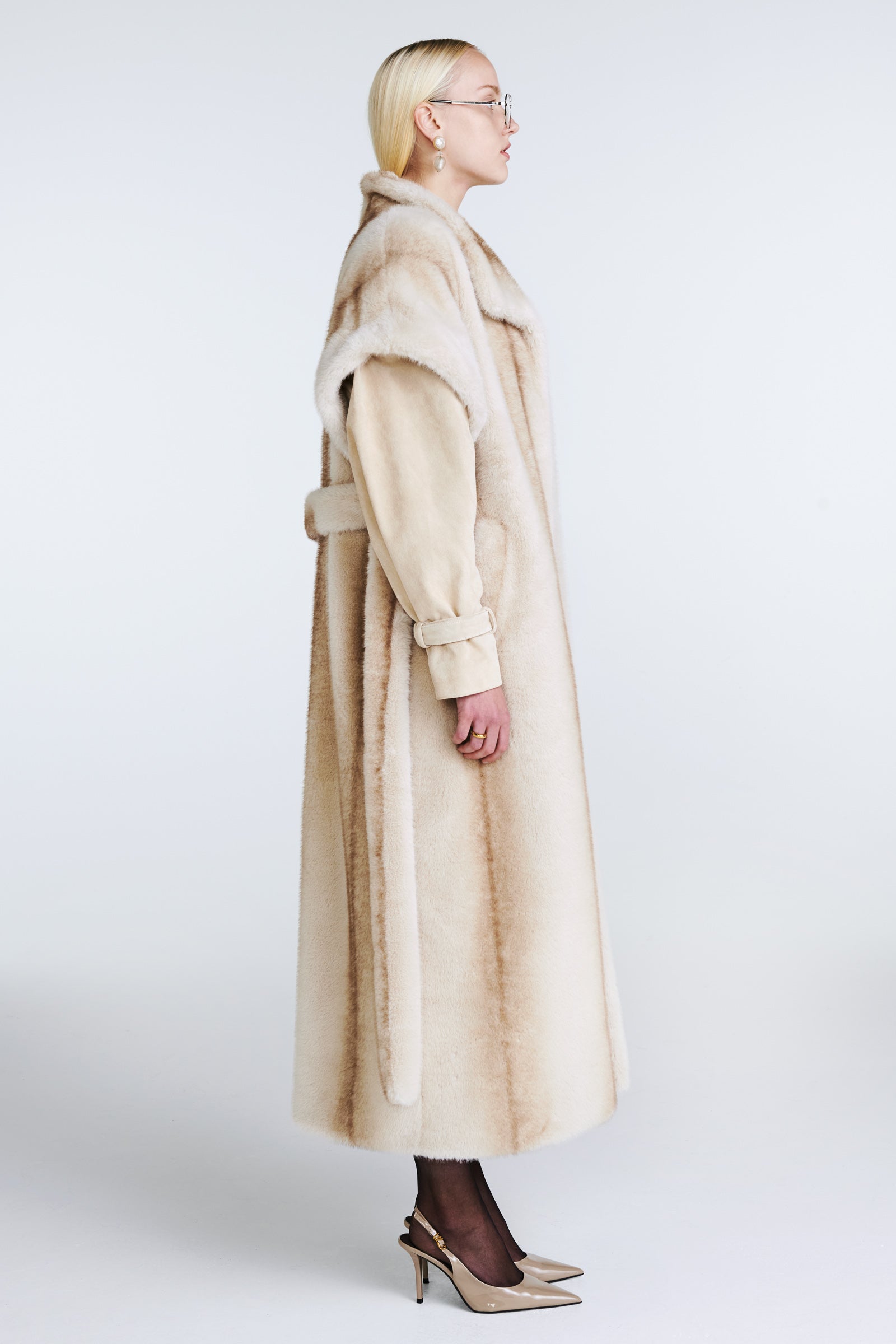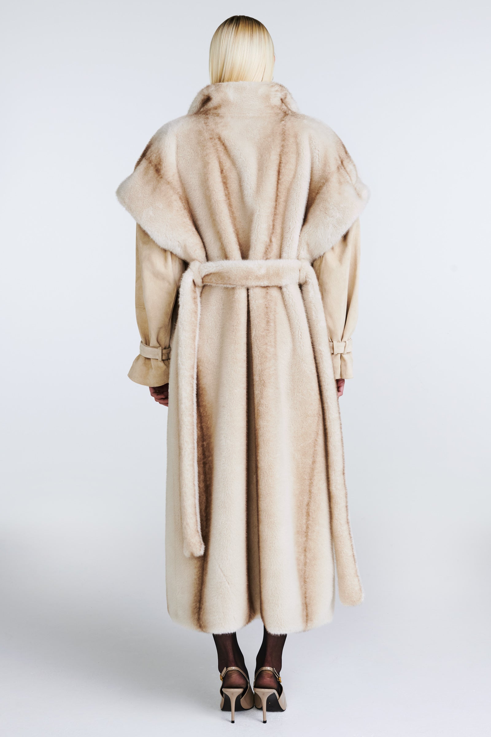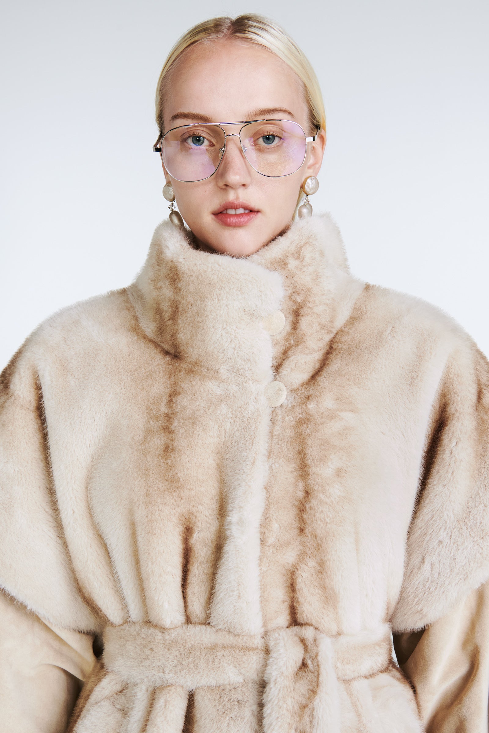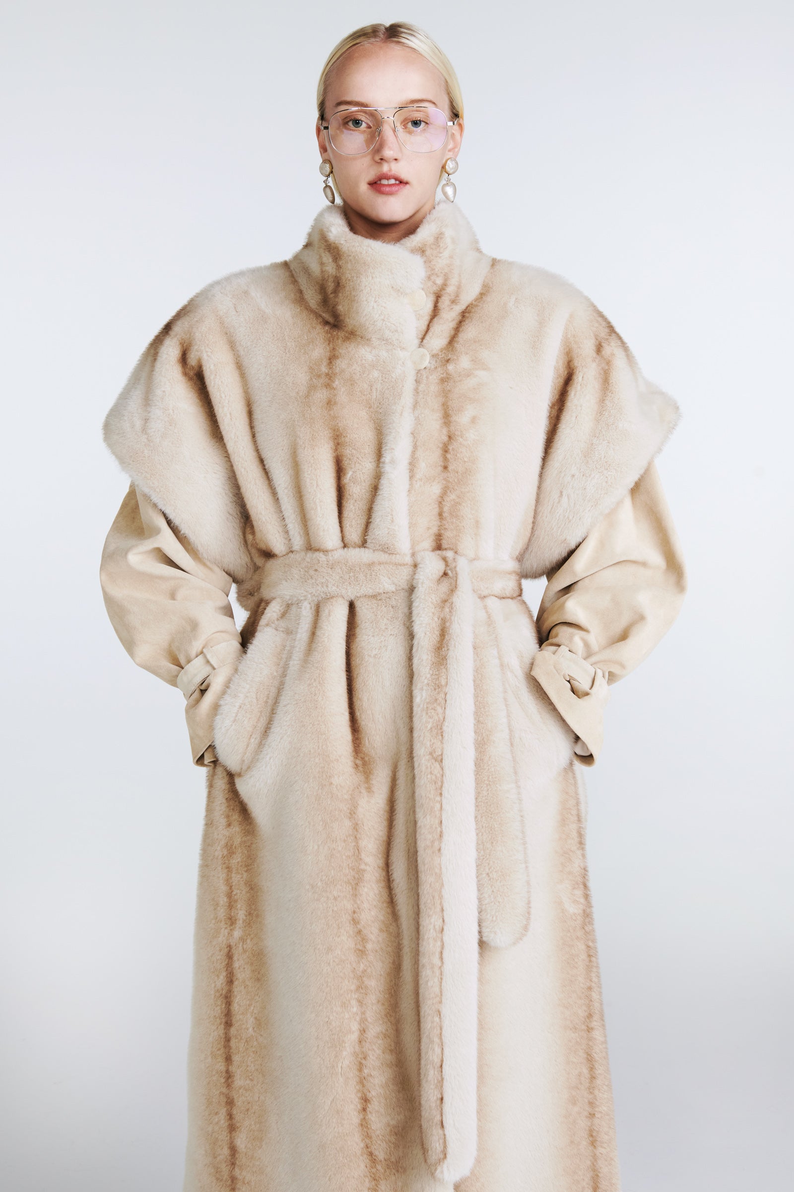 A star piece in the collection, harper combines two favourite textures – softest faux fur and silky suede. Oversized silhouette and drop shoulder design echoes 80’s fashion staples. Suede sleeves contrast with plush fur, long line length makes Harper a standout style.