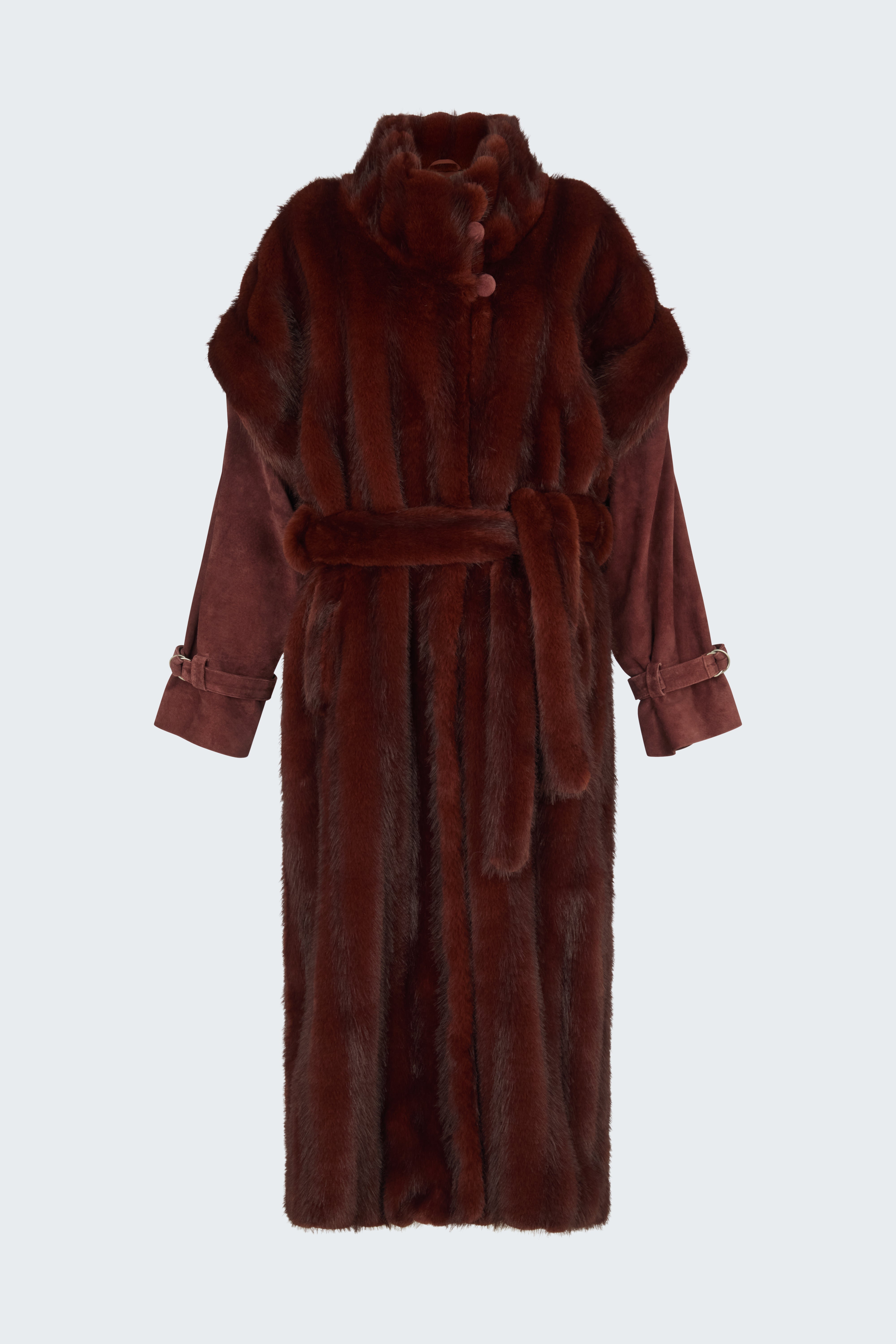 This oversize, funnel neck maxi coat will add drama and luxury to your winter wardrobe. The incredibly soft shearling, backed in sumptuous matte suede.