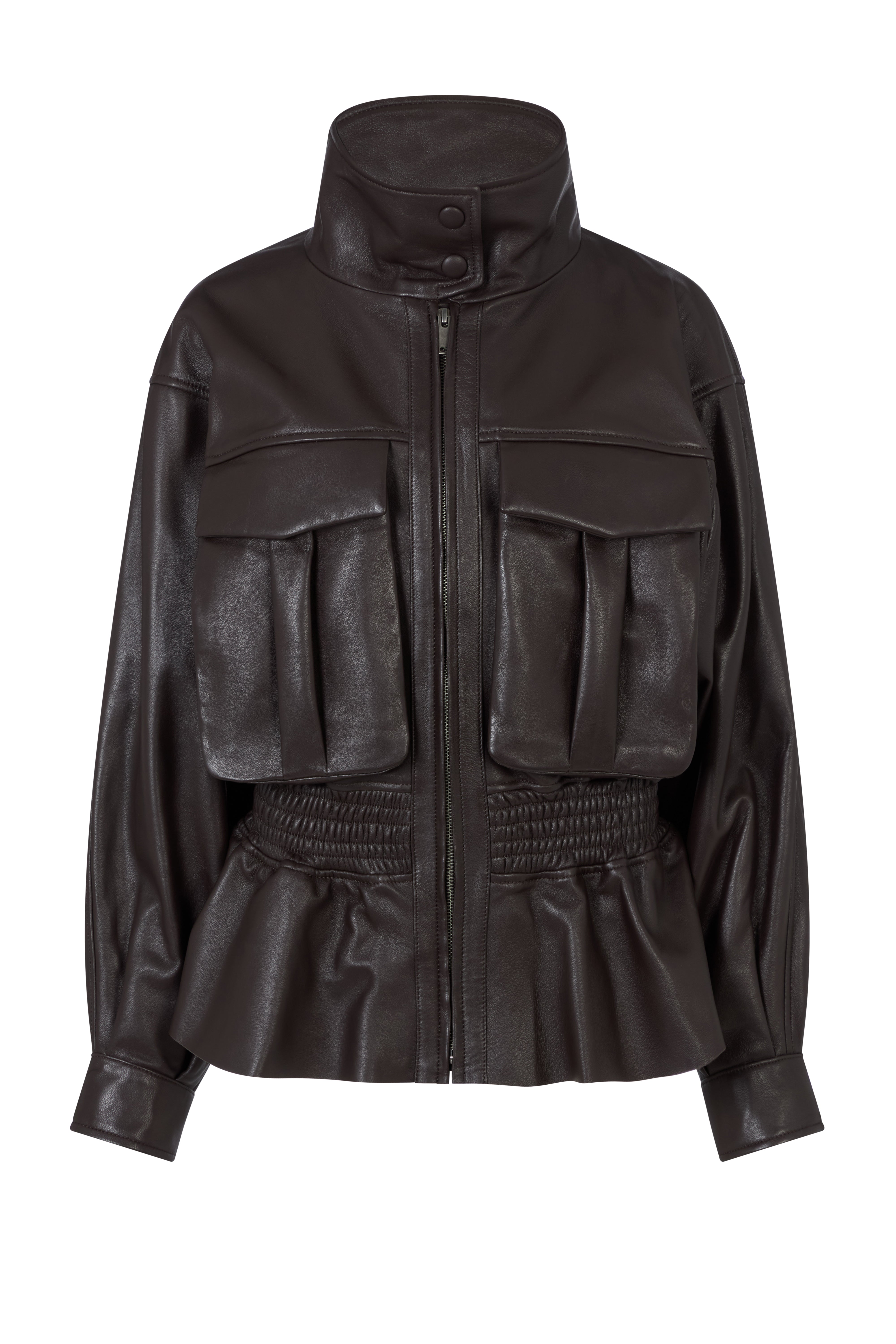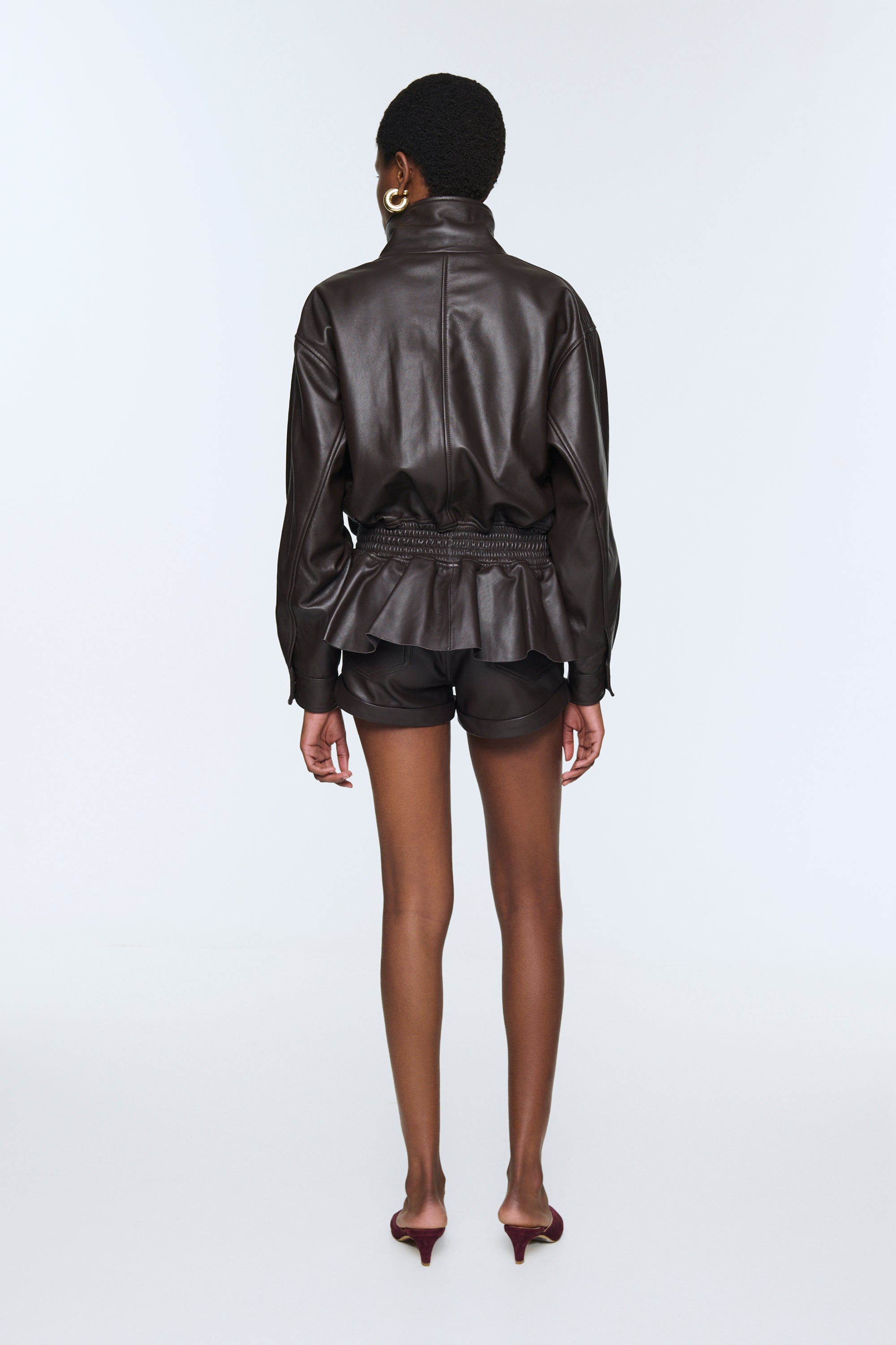 A blouson jacket with a twist. The Hazel adds a light and flirtatious feel to this classic cut with its gathered waist and subtle peplum. The incredibly supple, glossy leather, lined with soft satin and finished with expertly tailored pockets makes it the perfect example of utility meets pretty.