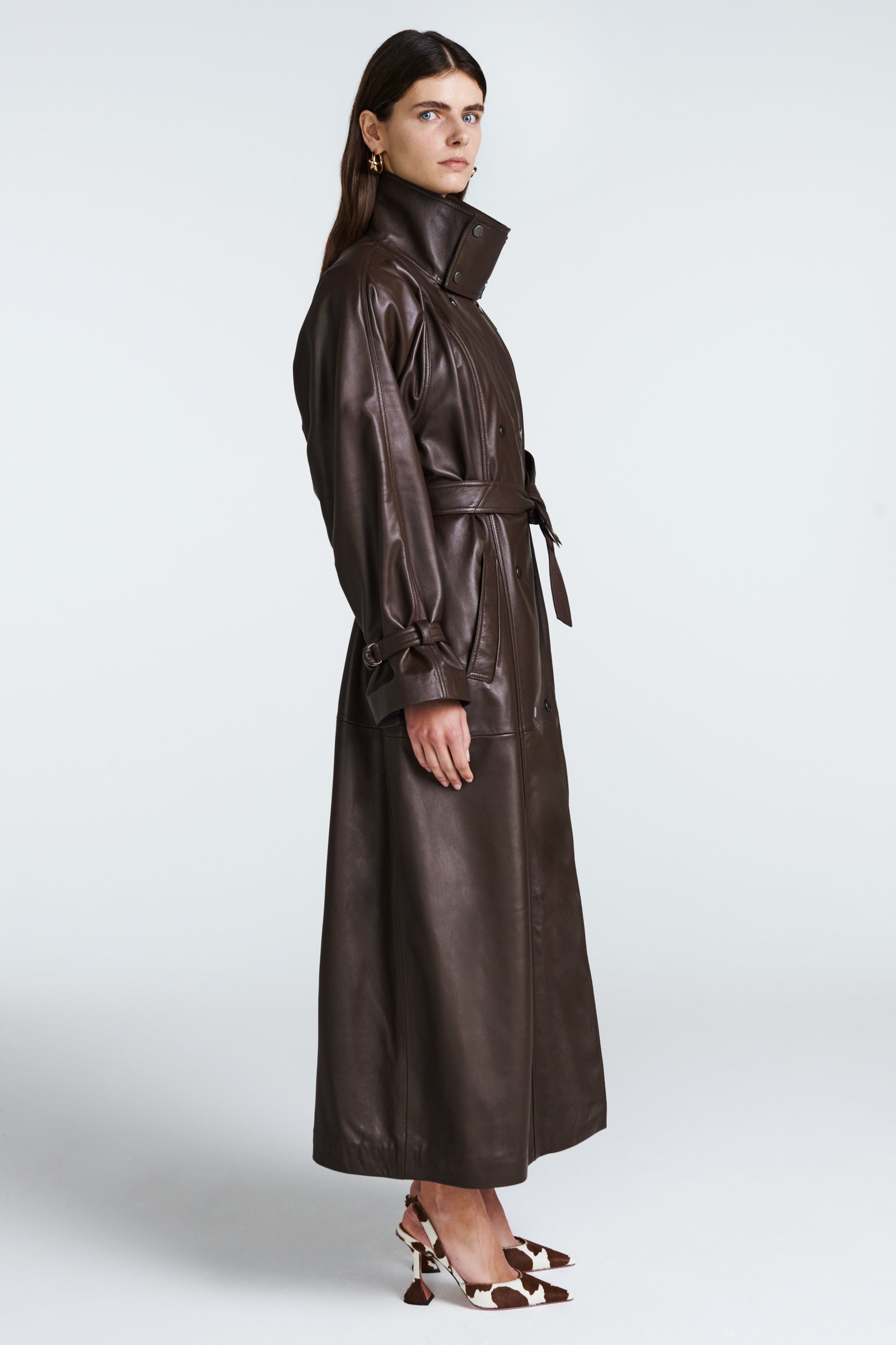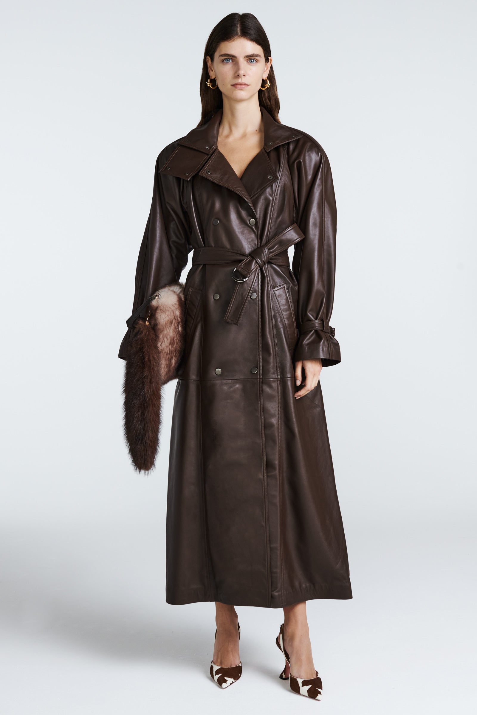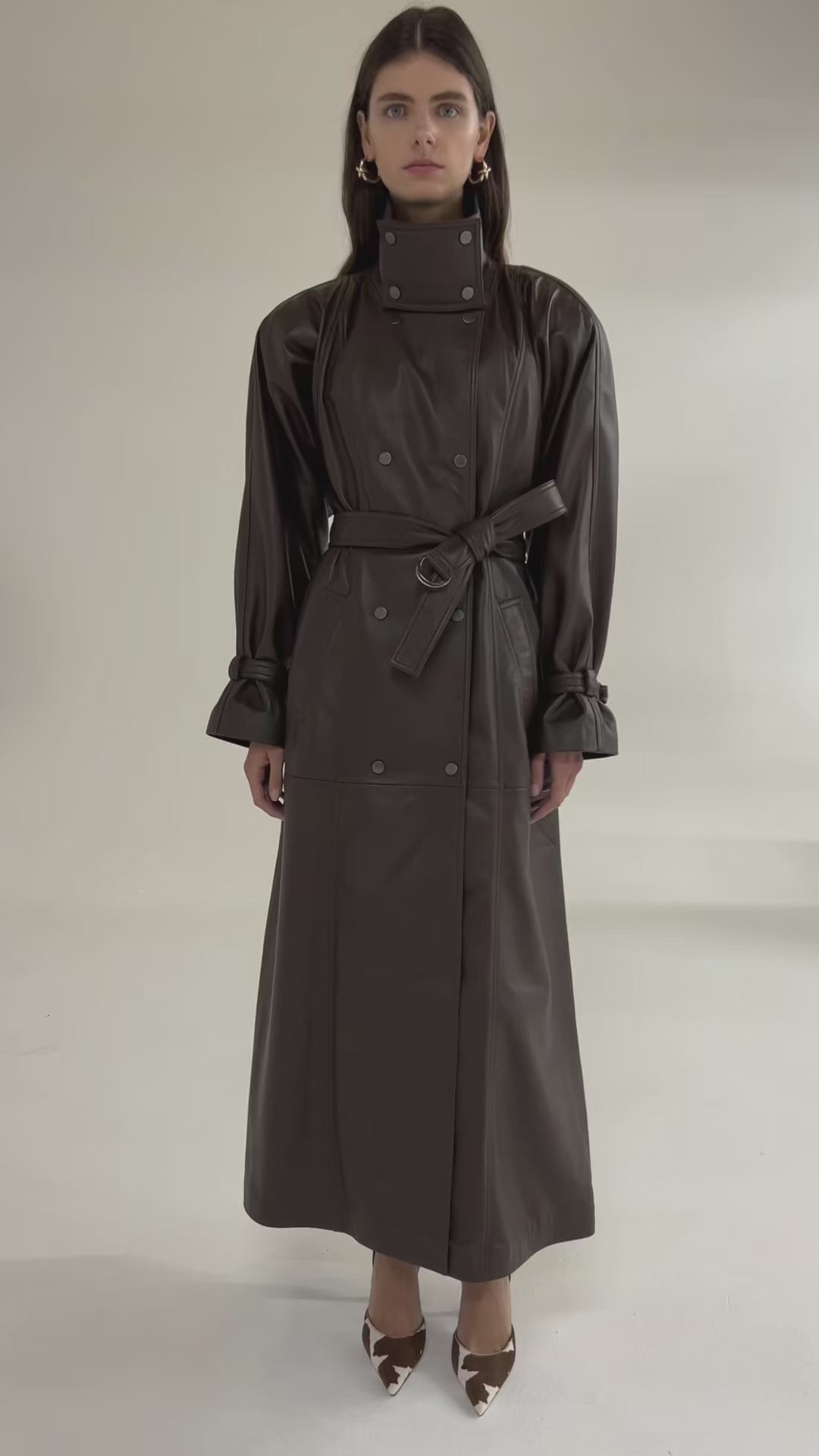 This gorgeous longline trench coat is meticulously crafted from supple leather, offering both durability and luxury. It features a striking neckline and an adaptable collar, which can be styled in multiple ways thanks to the innovative use of pop fastenings.