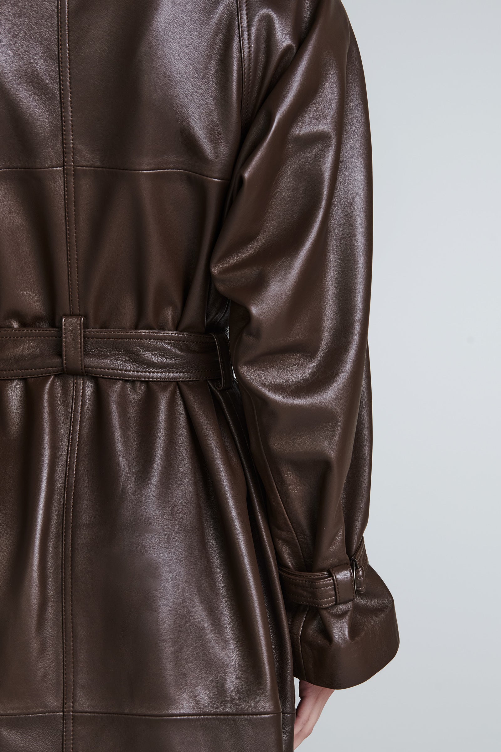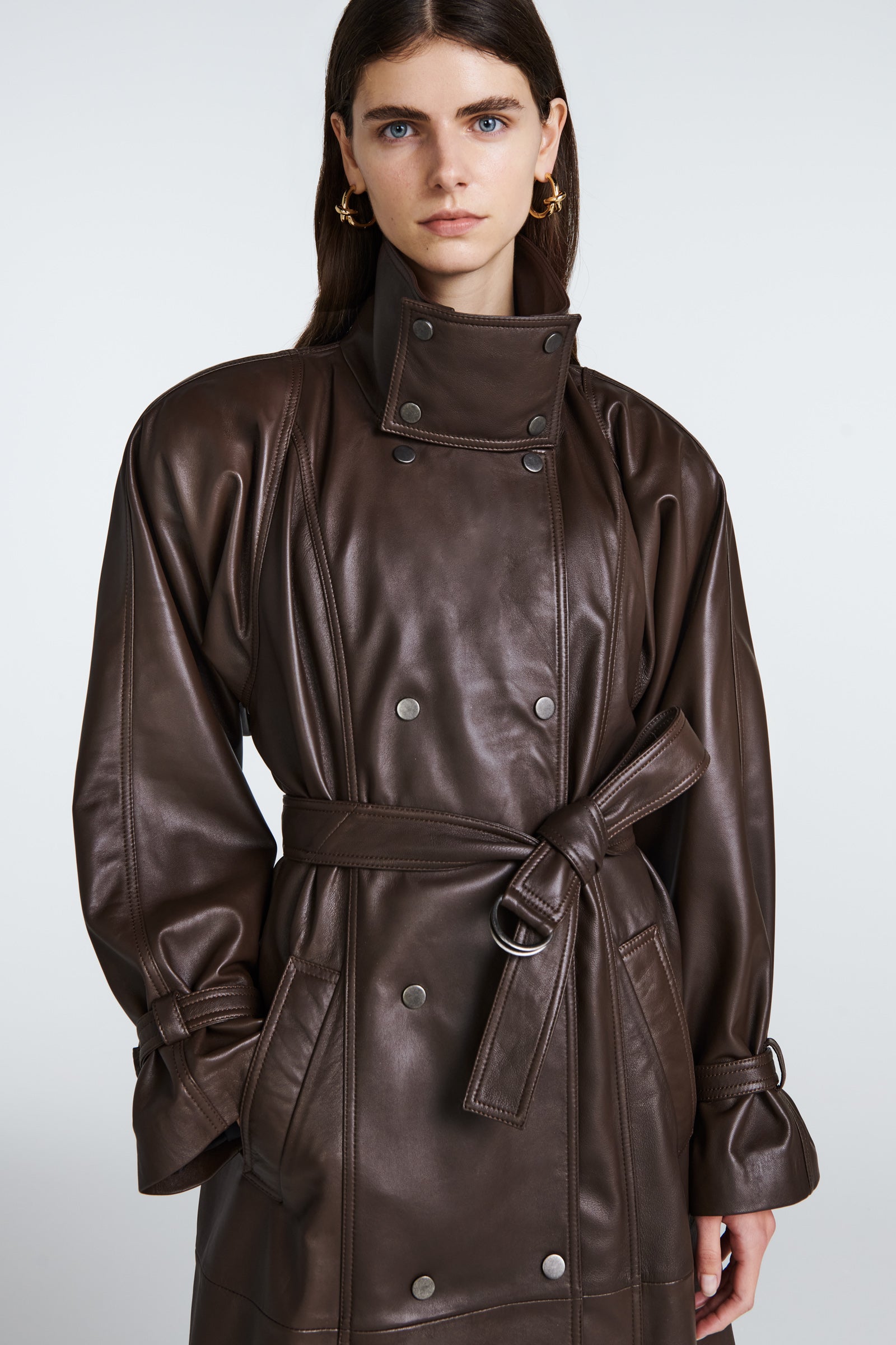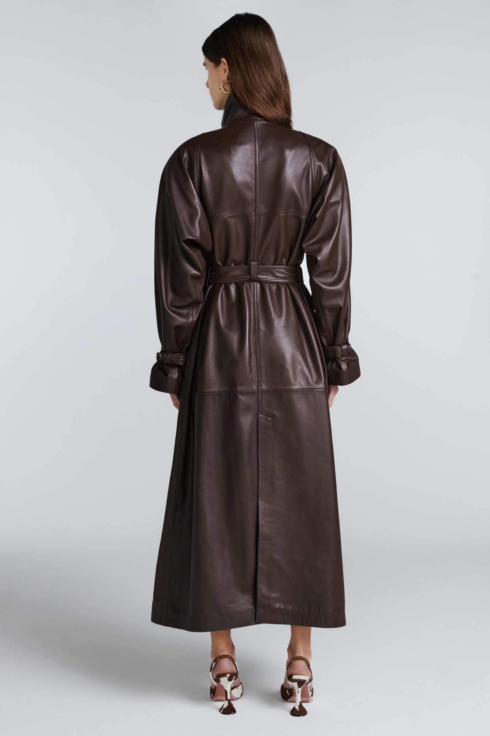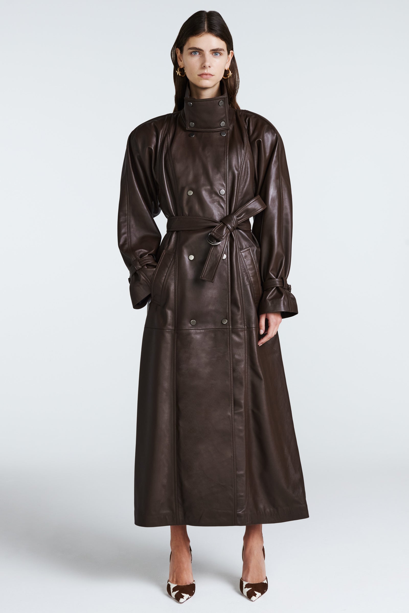 This gorgeous longline trench coat is meticulously crafted from supple leather, offering both durability and luxury. It features a striking neckline and an adaptable collar, which can be styled in multiple ways thanks to the innovative use of pop fastenings.