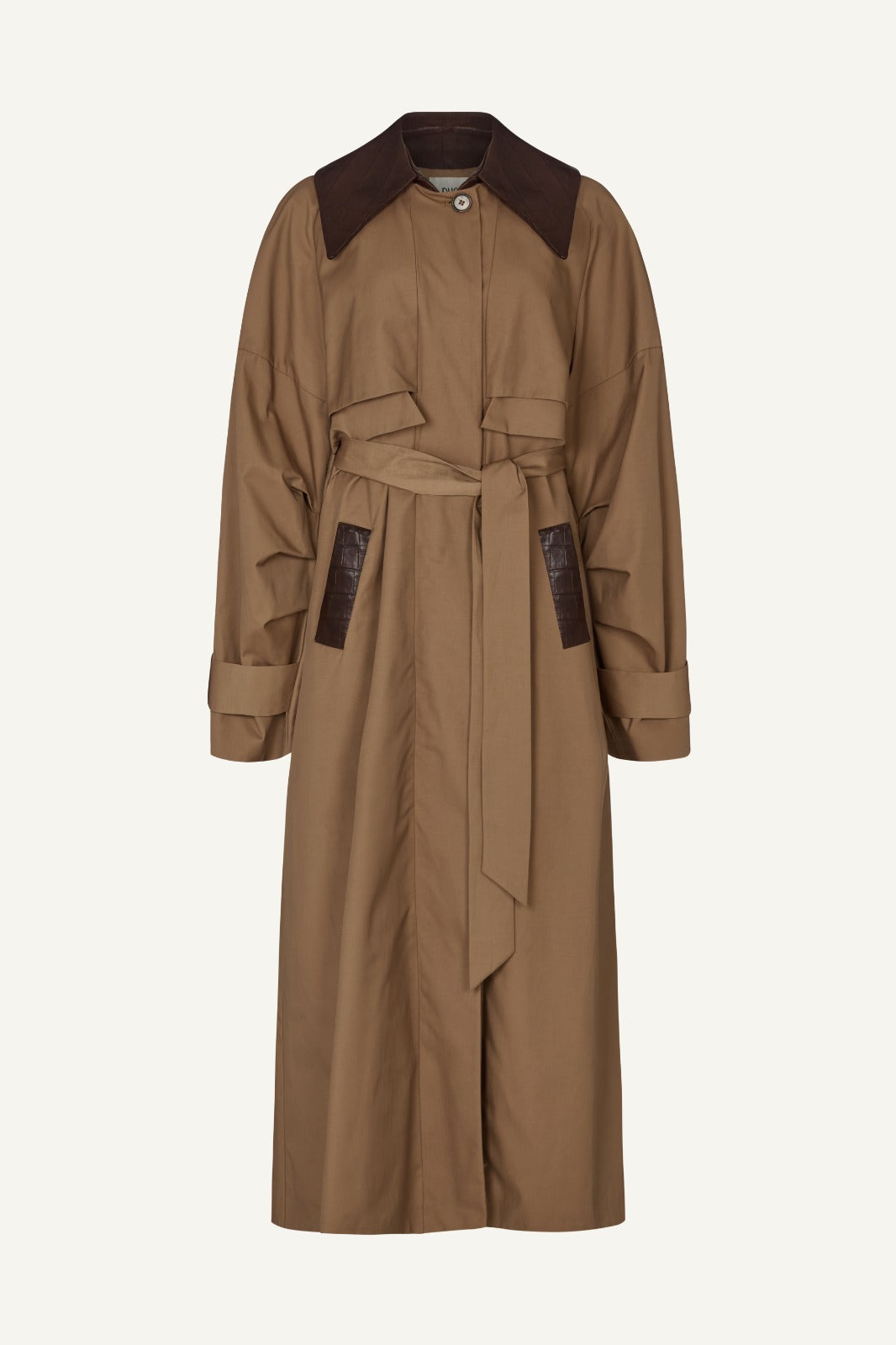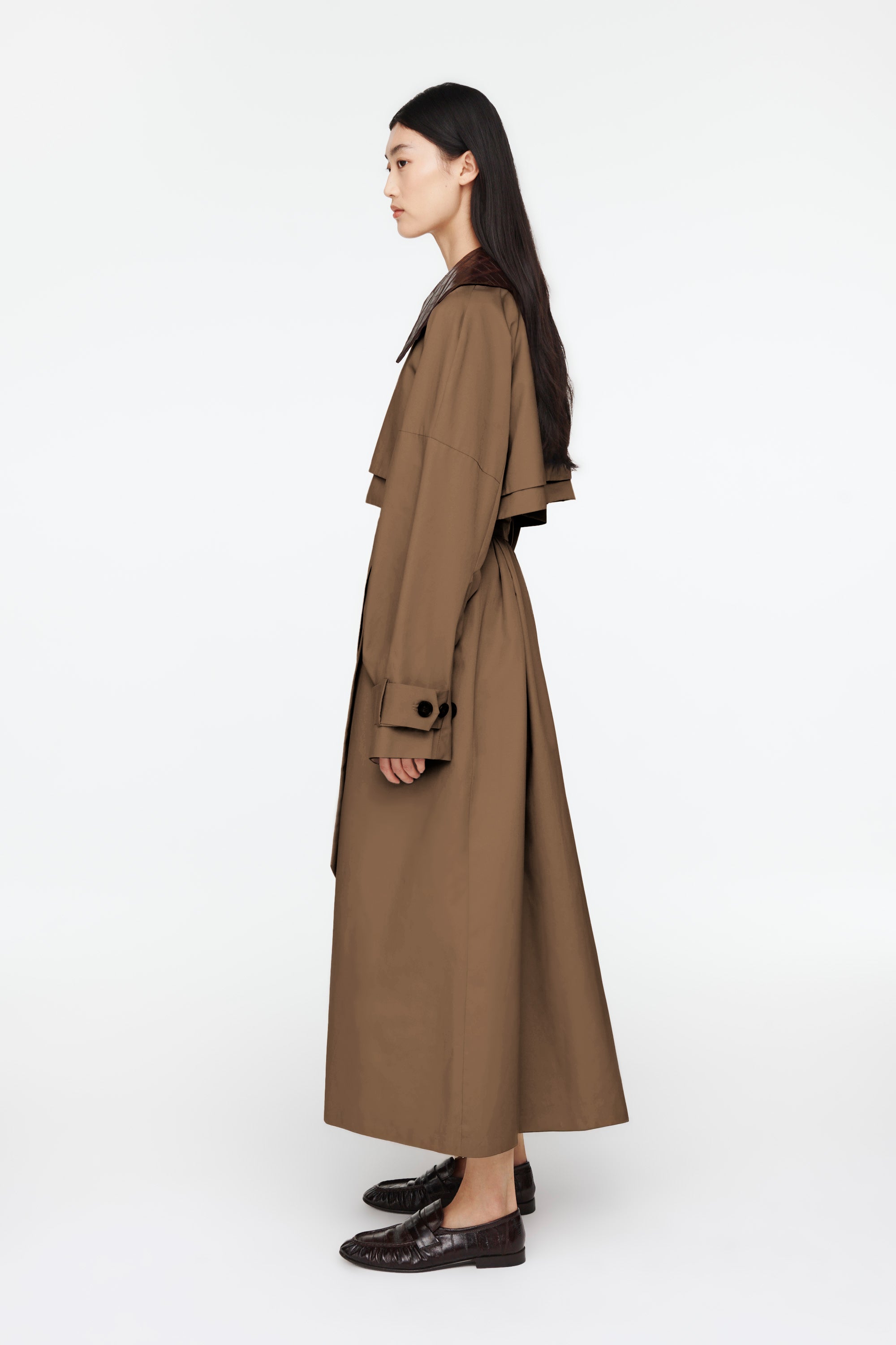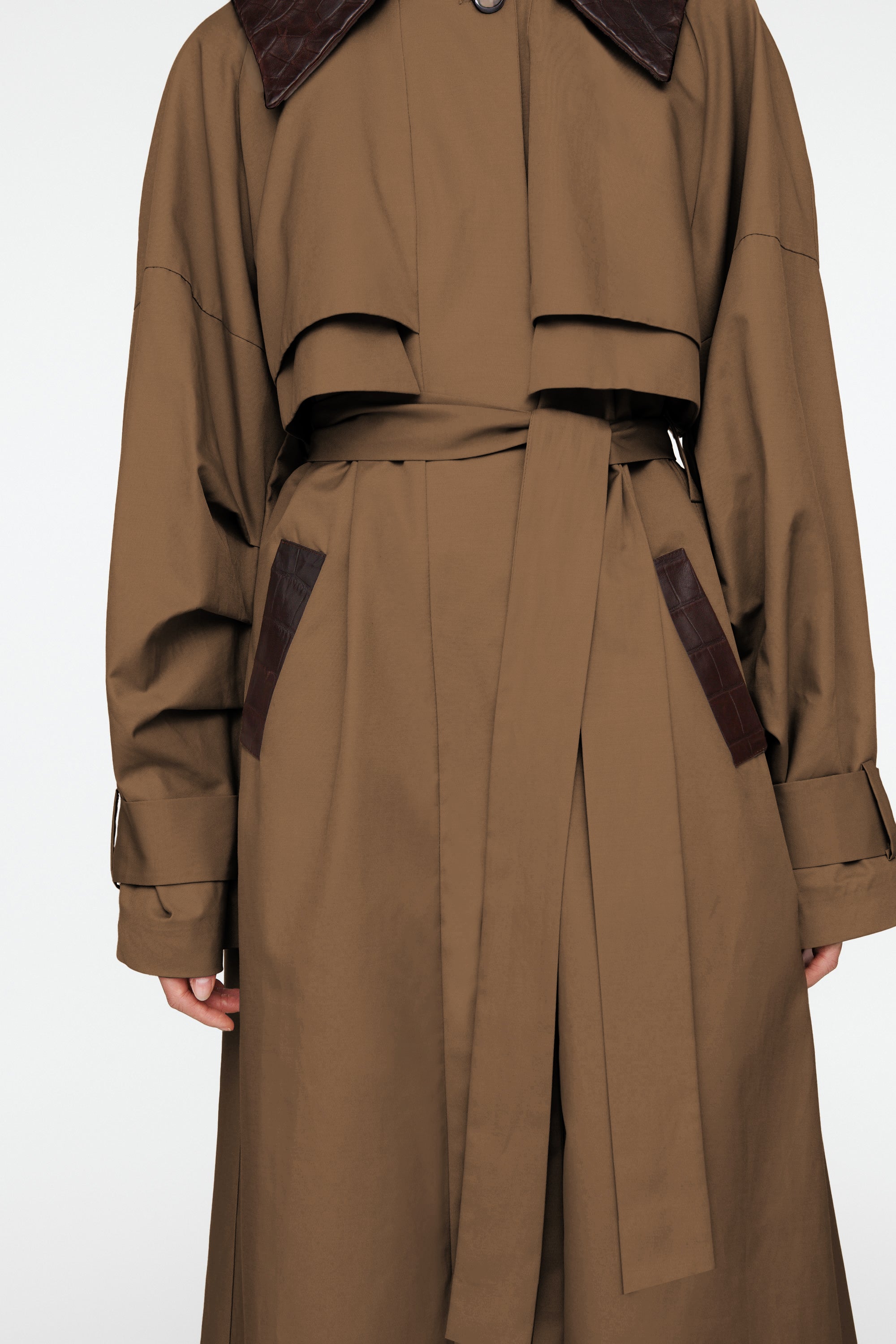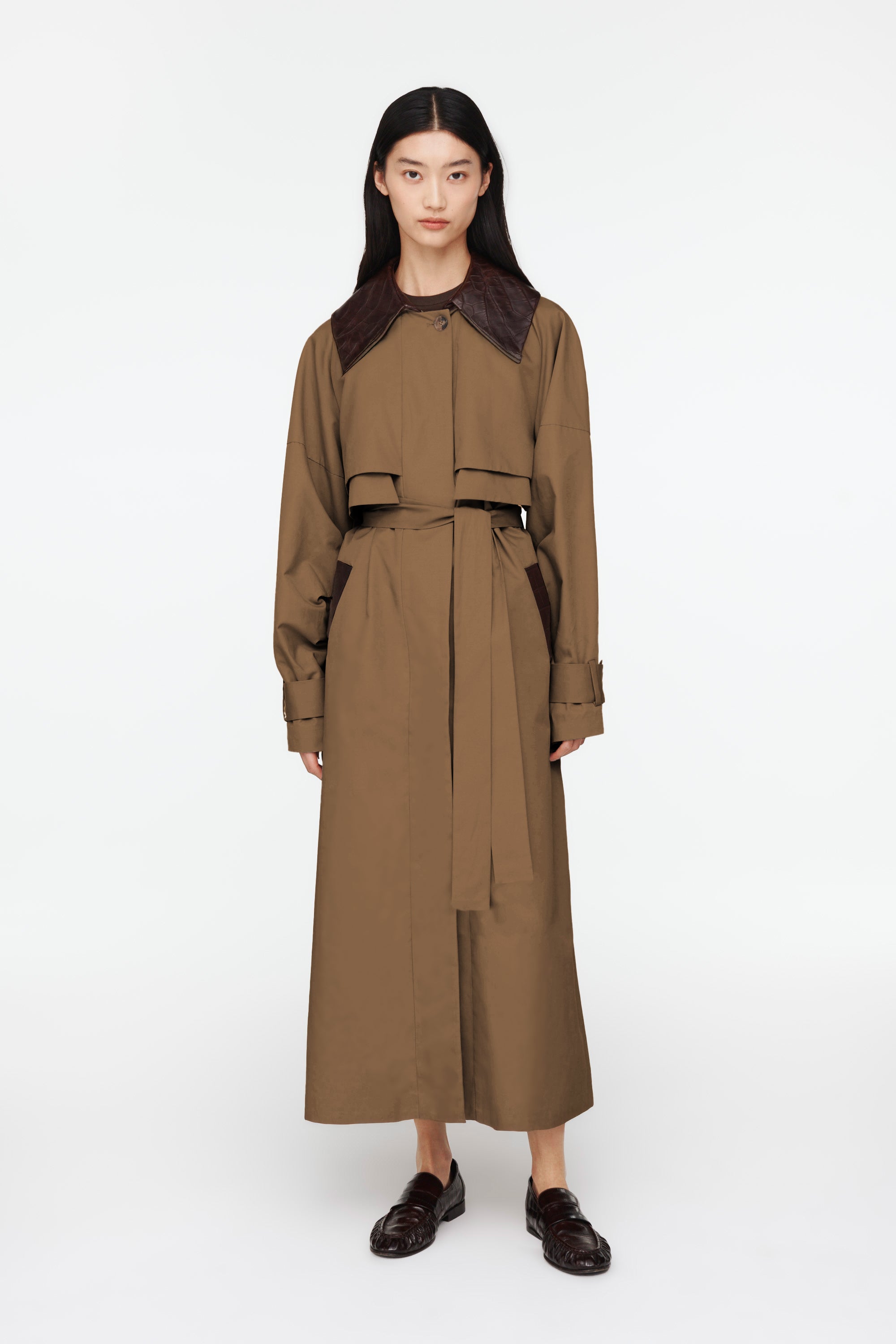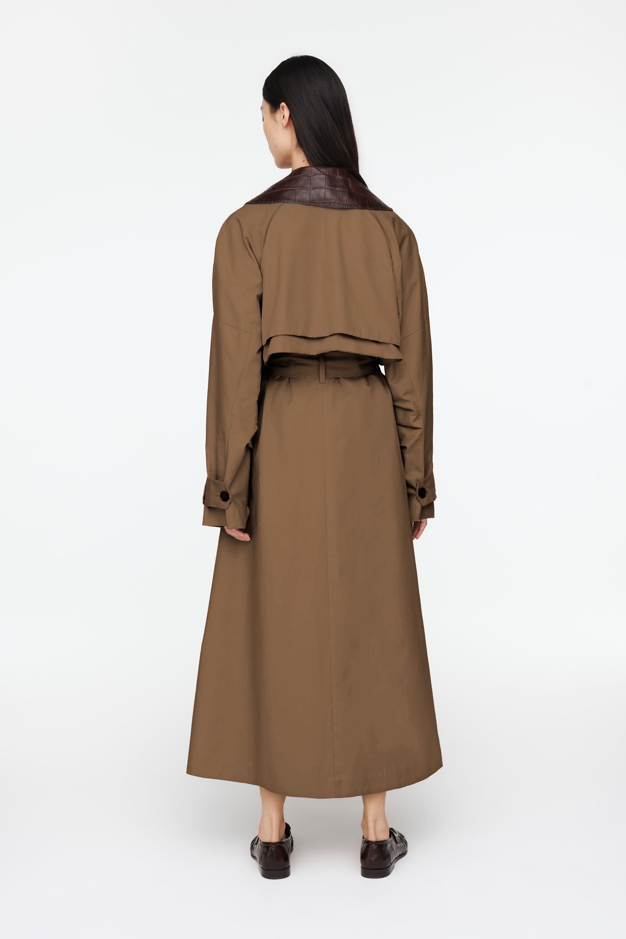 Our Juliet canvas trench coat trimmed with leather, puts a contemporary spin on a classic. Designed for a relaxed fit with a cinching waist belt this is the perfect transeasonal investment piece.