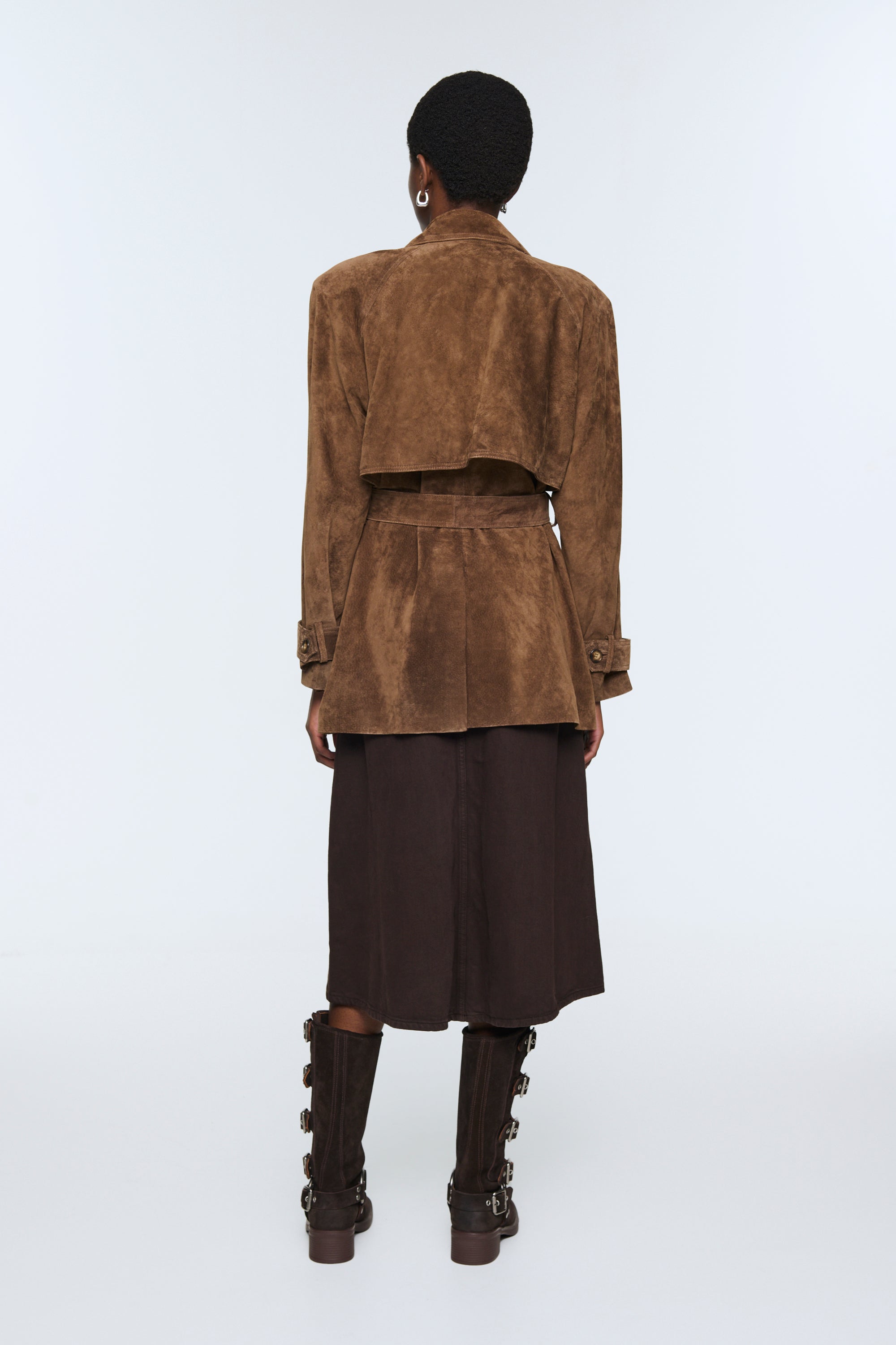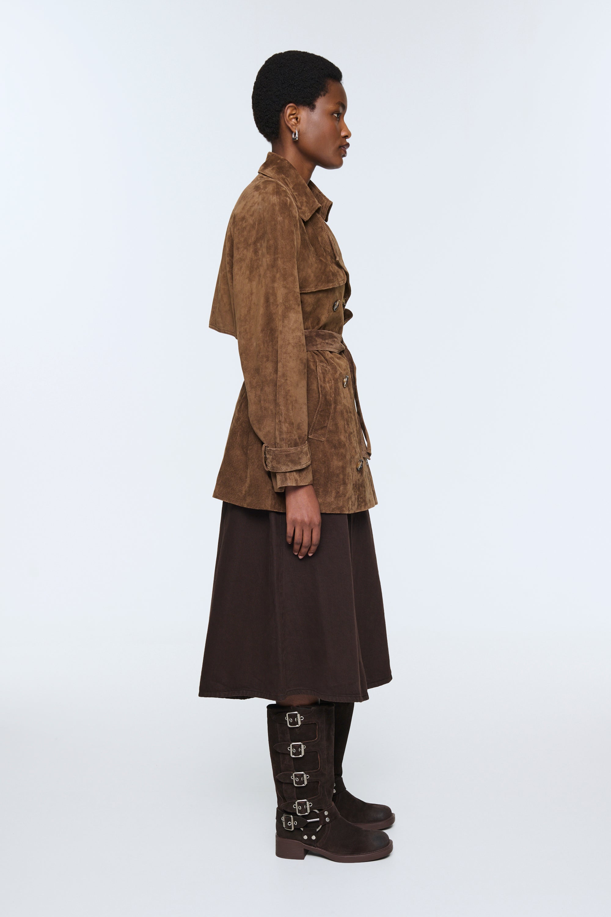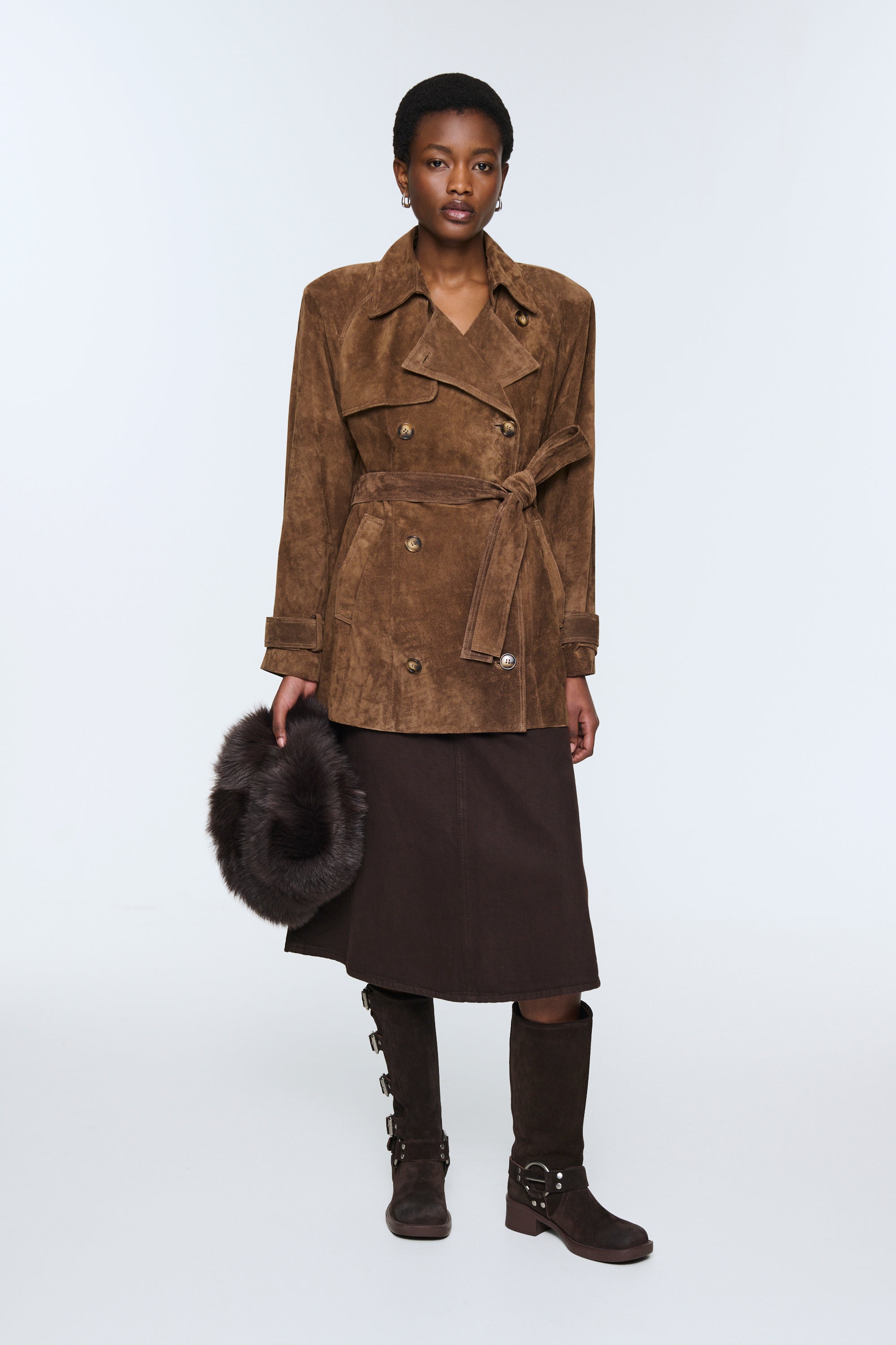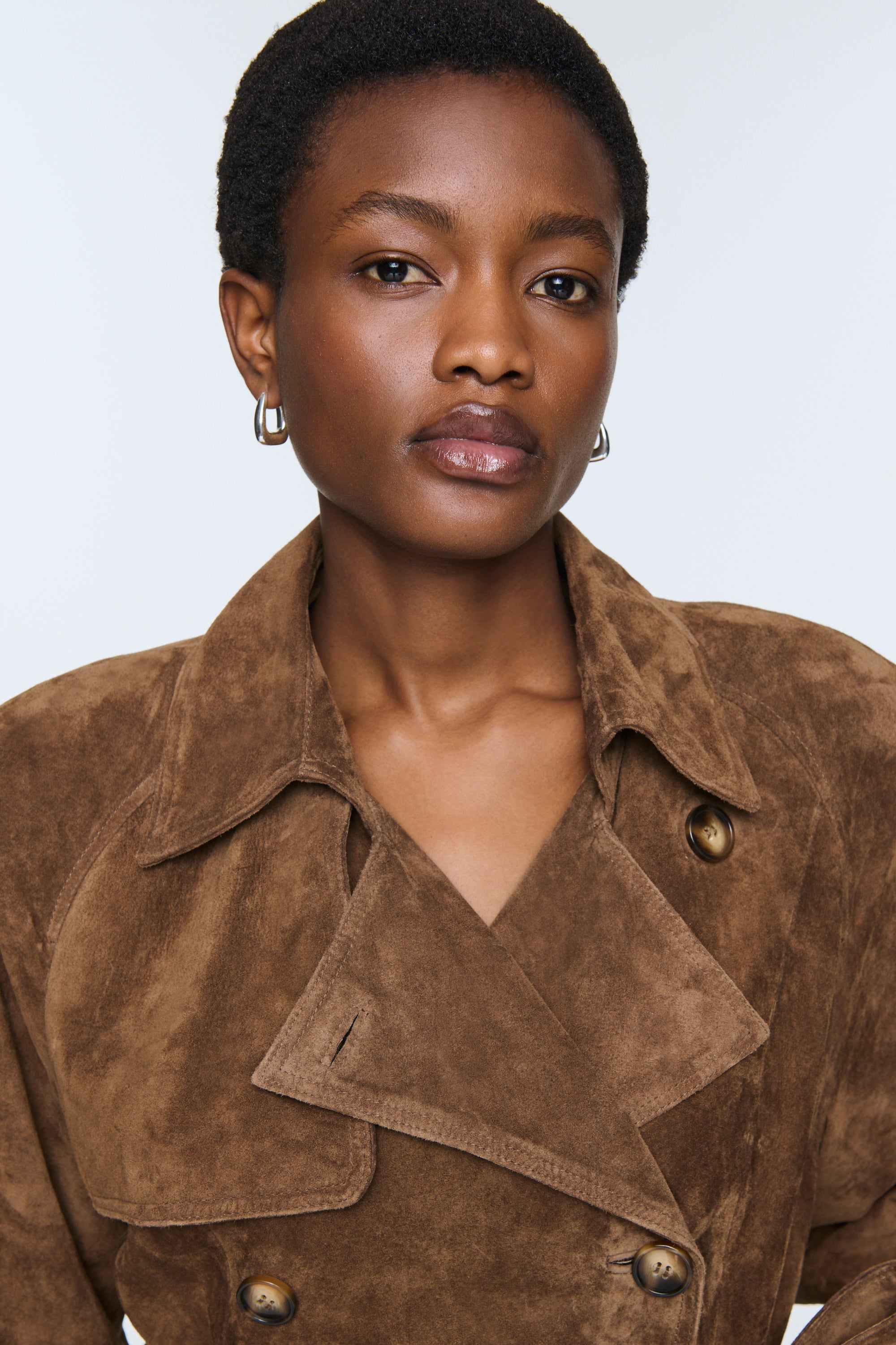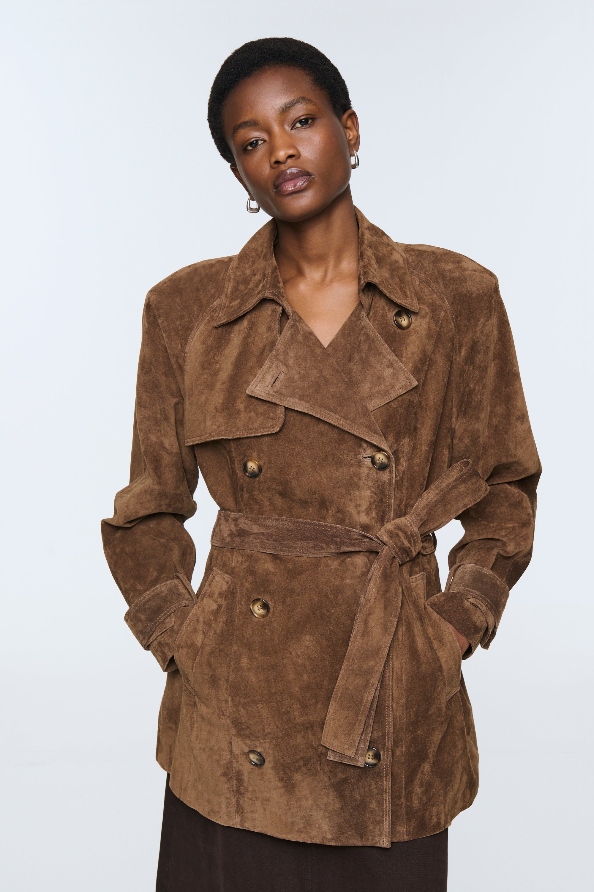 This coat will get you noticed. The incredibly soft, high quality suede leather is beautifully tailored into a classic double breasted trench complete with storm flap and leather sash. This cocooning coat will be a constant in your wardrobe.