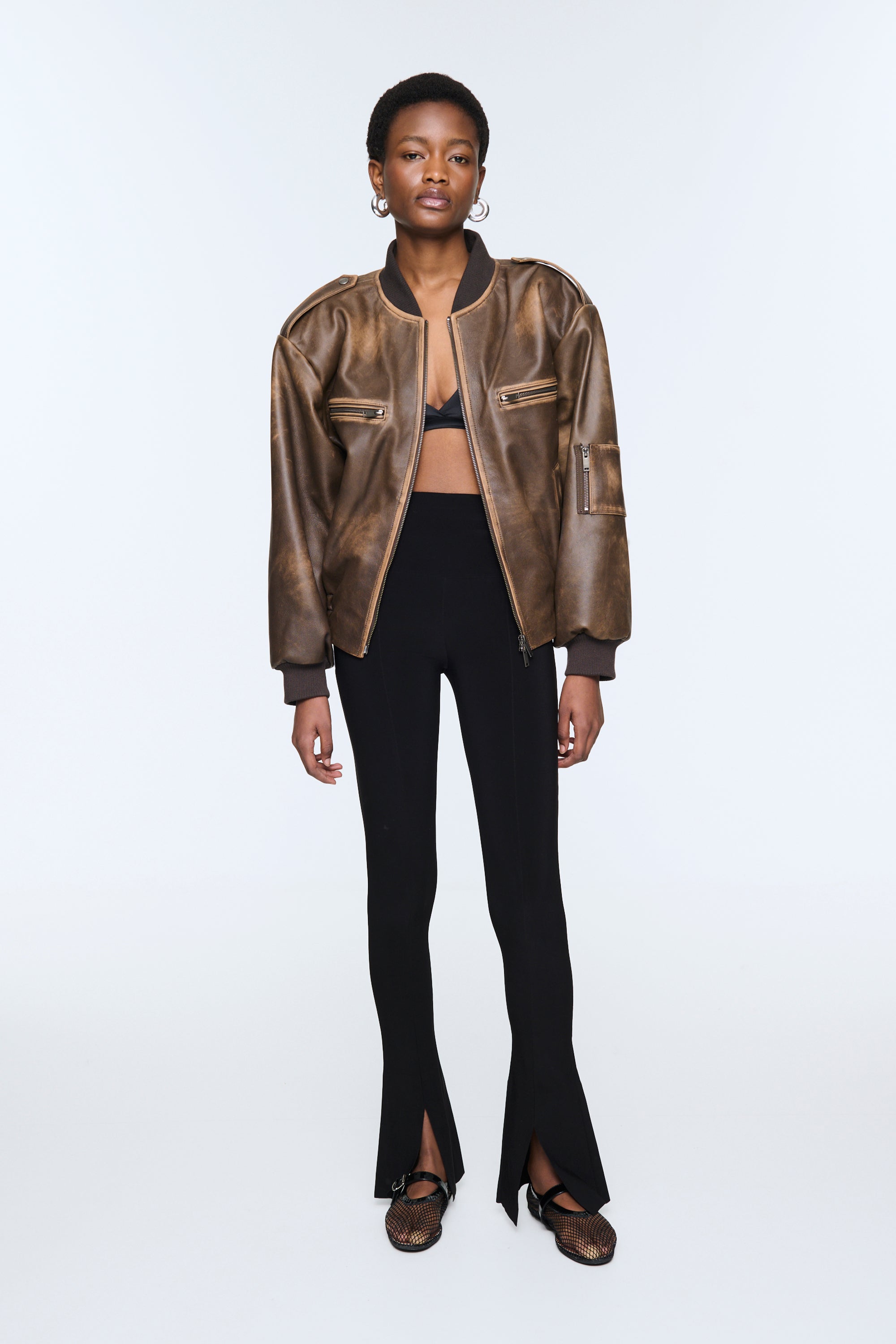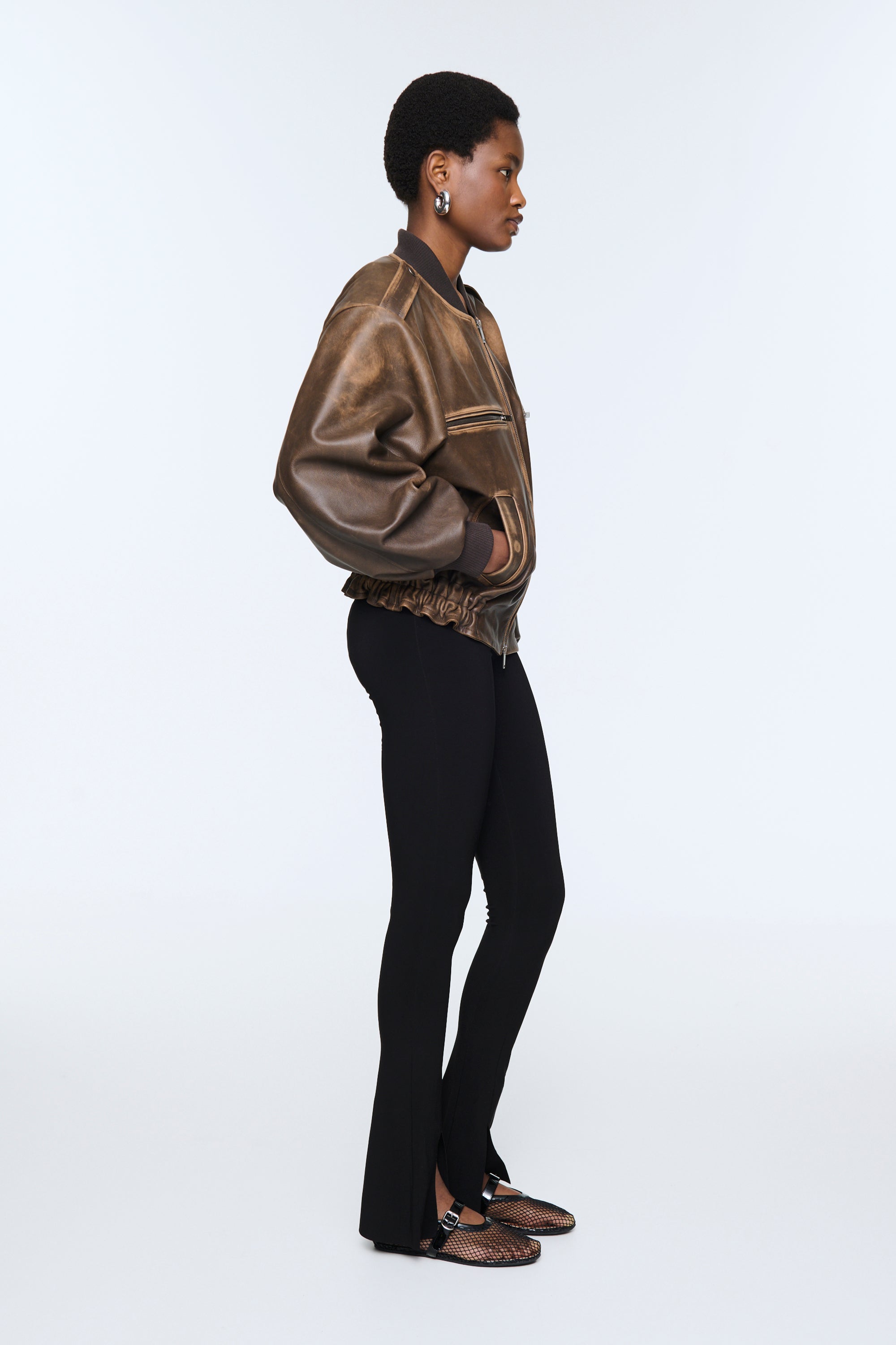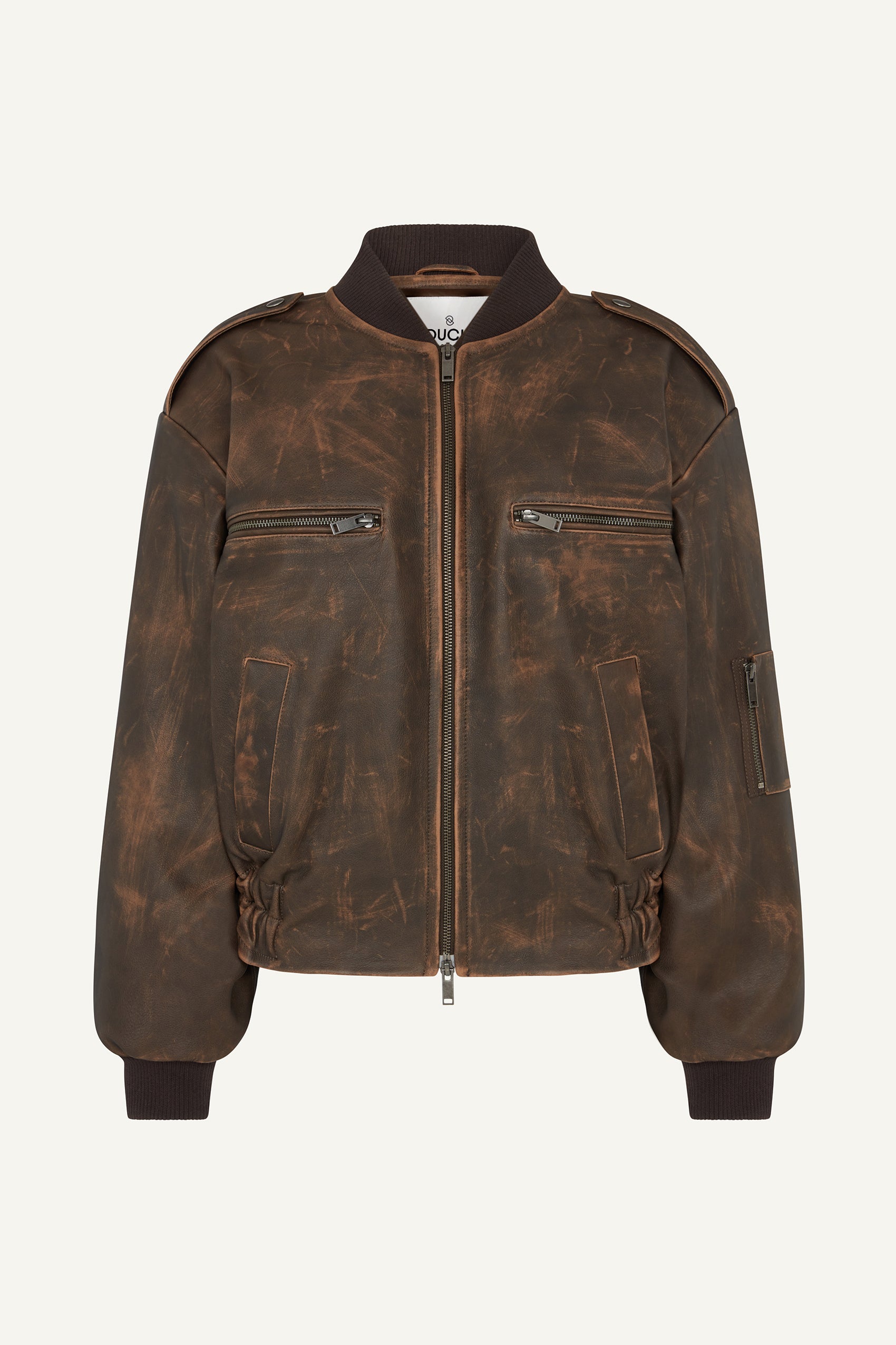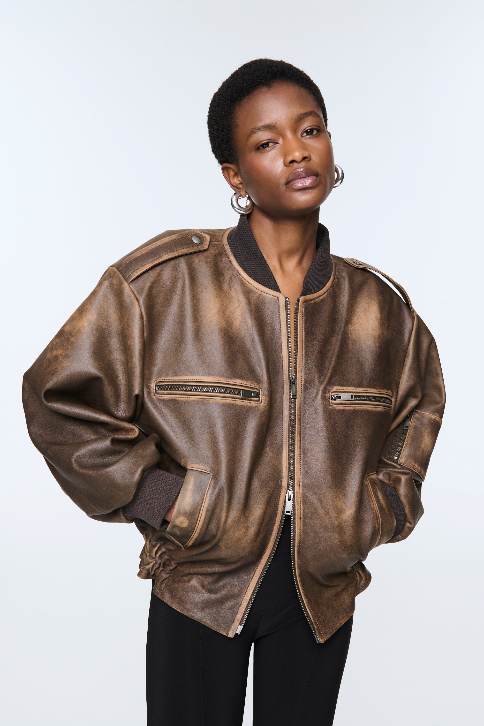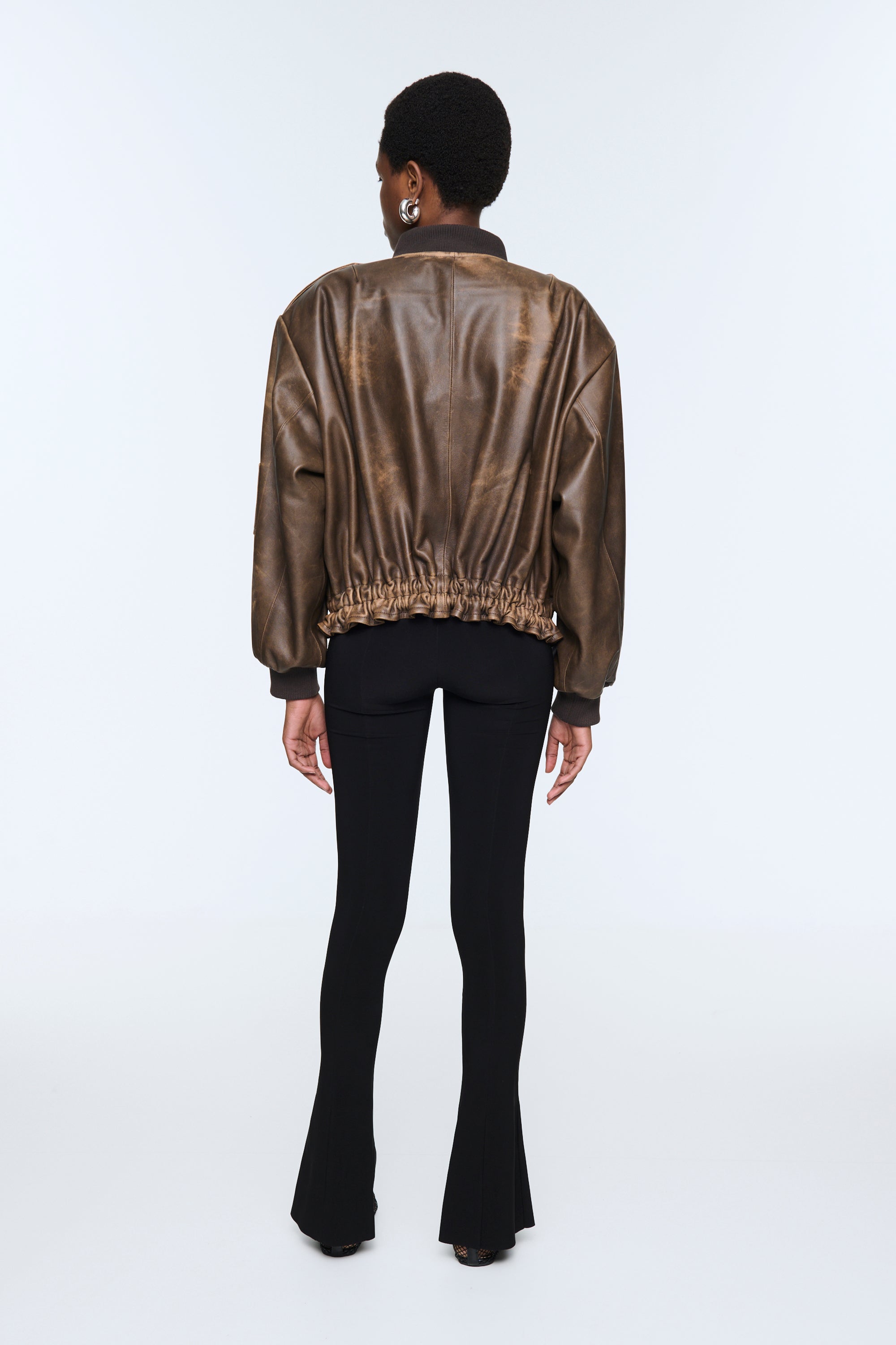 A soft textured leather bomber that will become your favourite sidekick through winter and beyond. We love the vintage feel, faded finish, the classic ribbed cuffs and collar and the slightly shorter length that ends in a flattering ruched waistline.