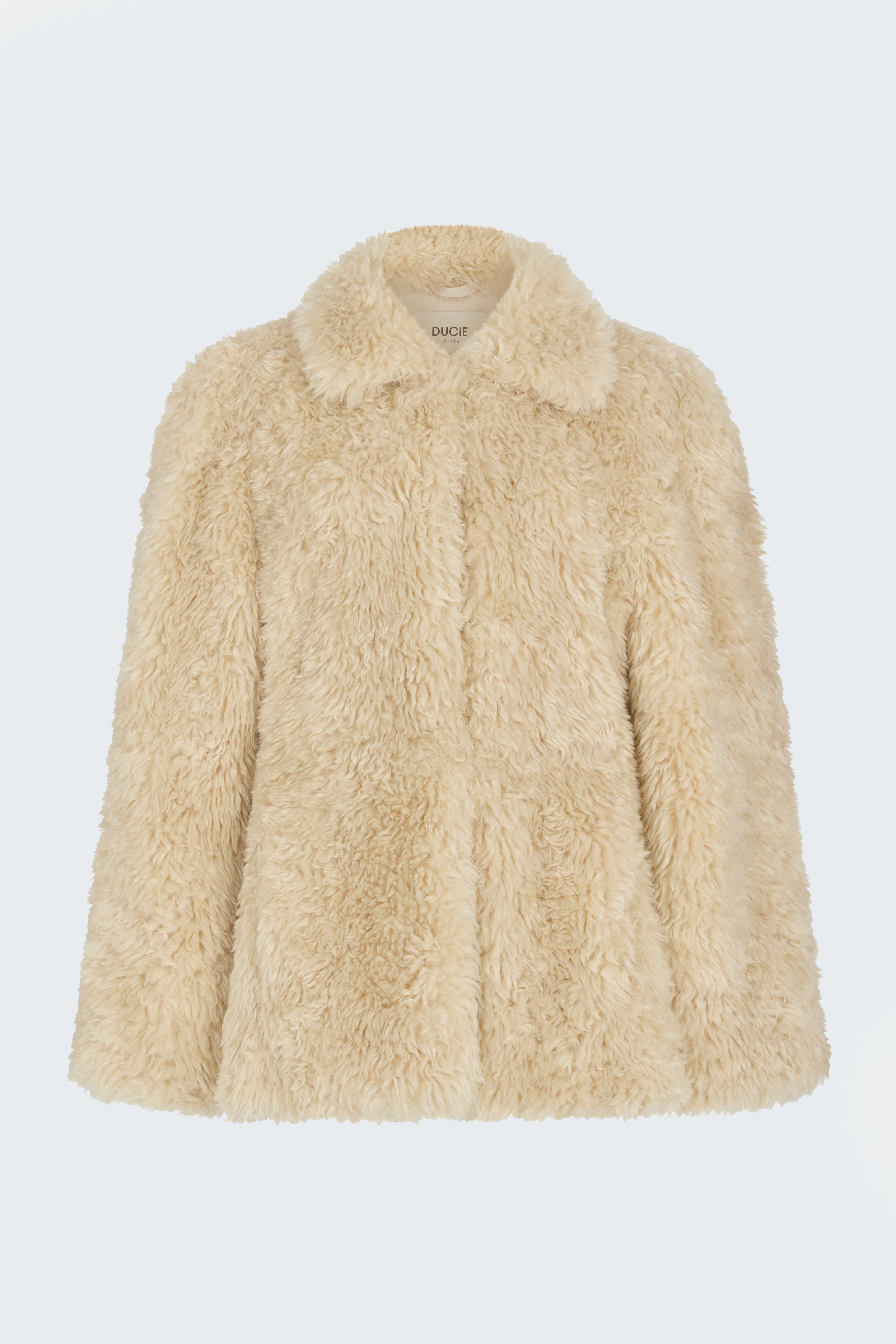 Softness embodied in our fabulous Maeve. A short Faux fur coat features oversized princess sleeves and peplum for even more dramatic look, with hook fastening and front pockets.