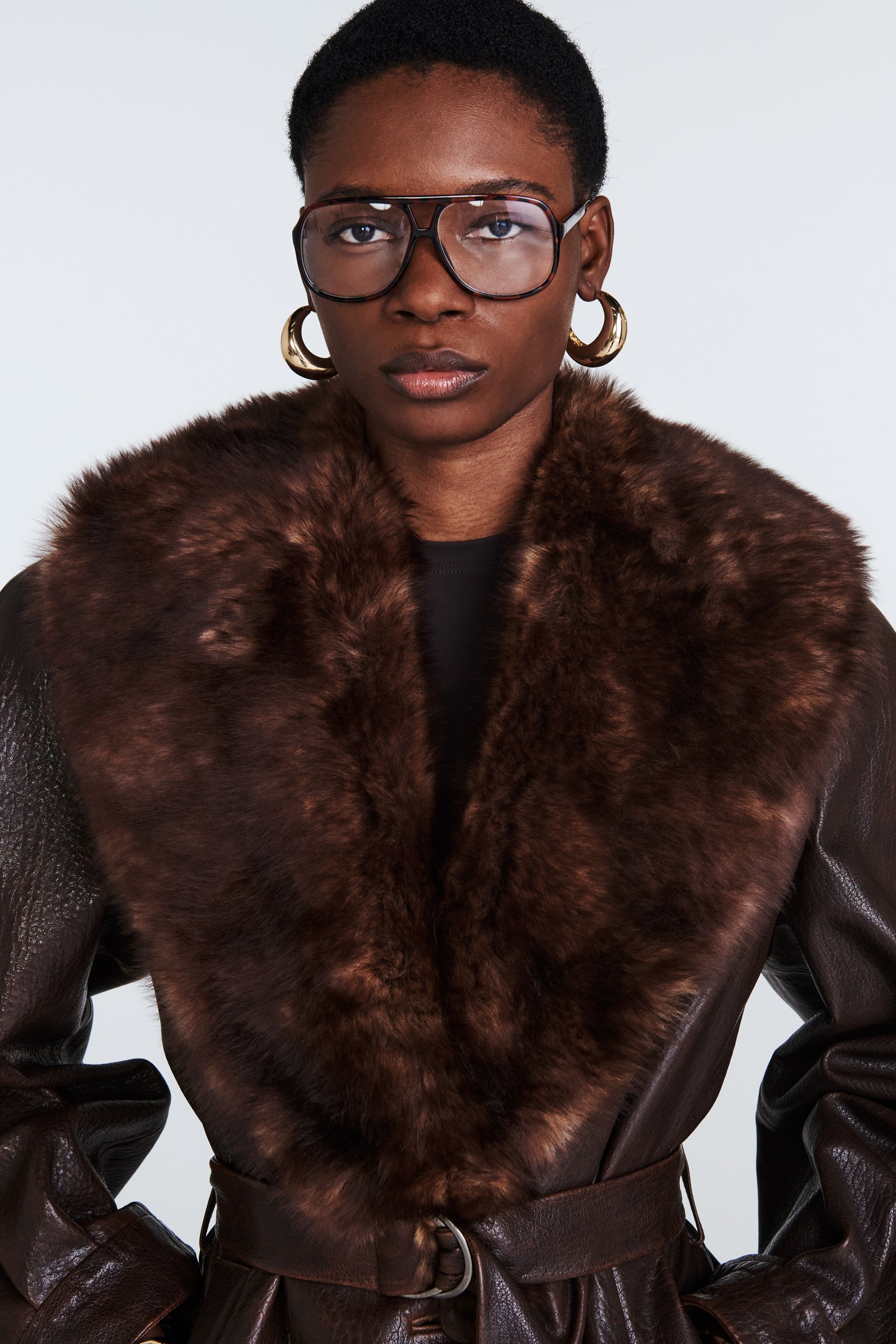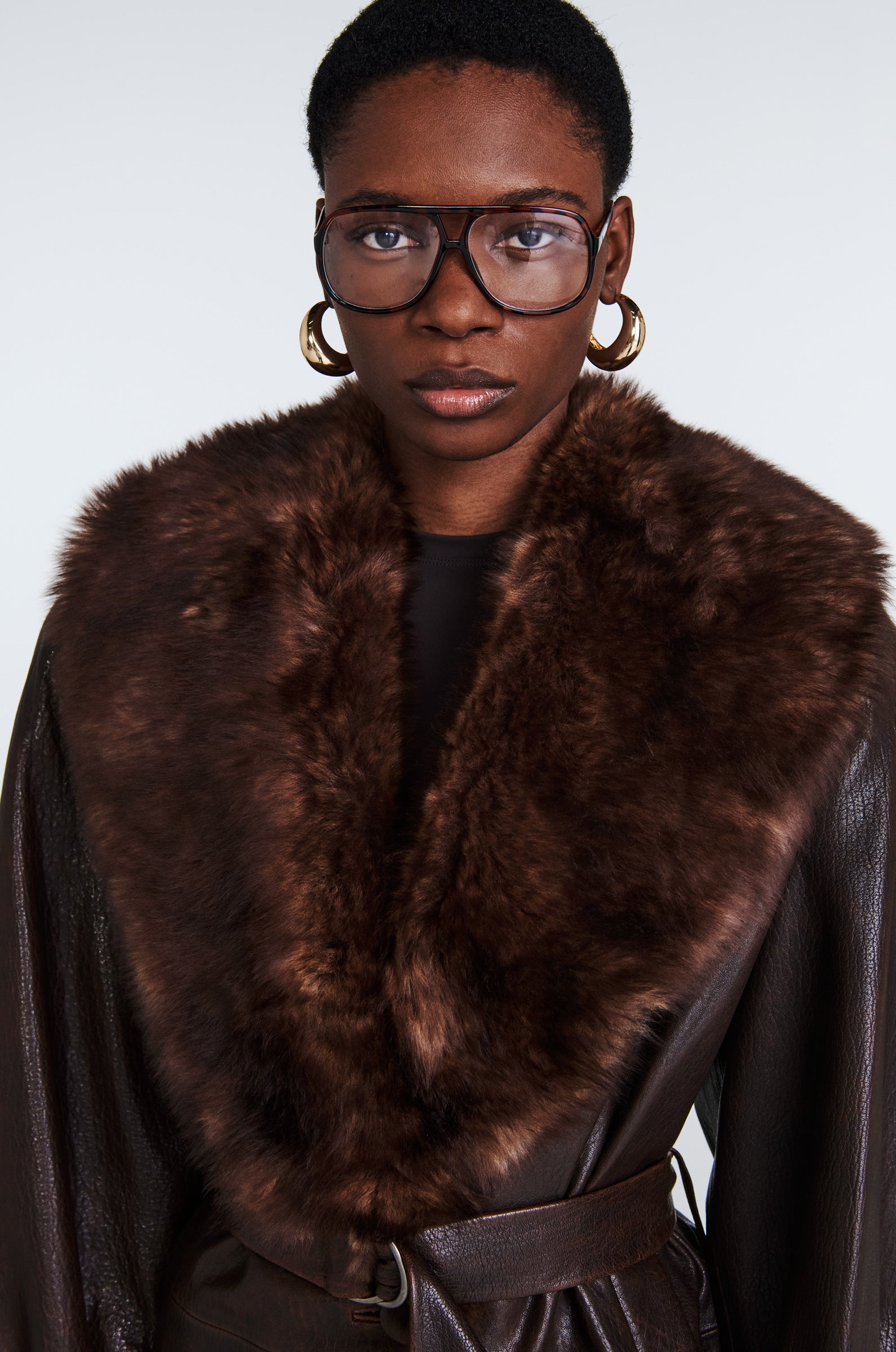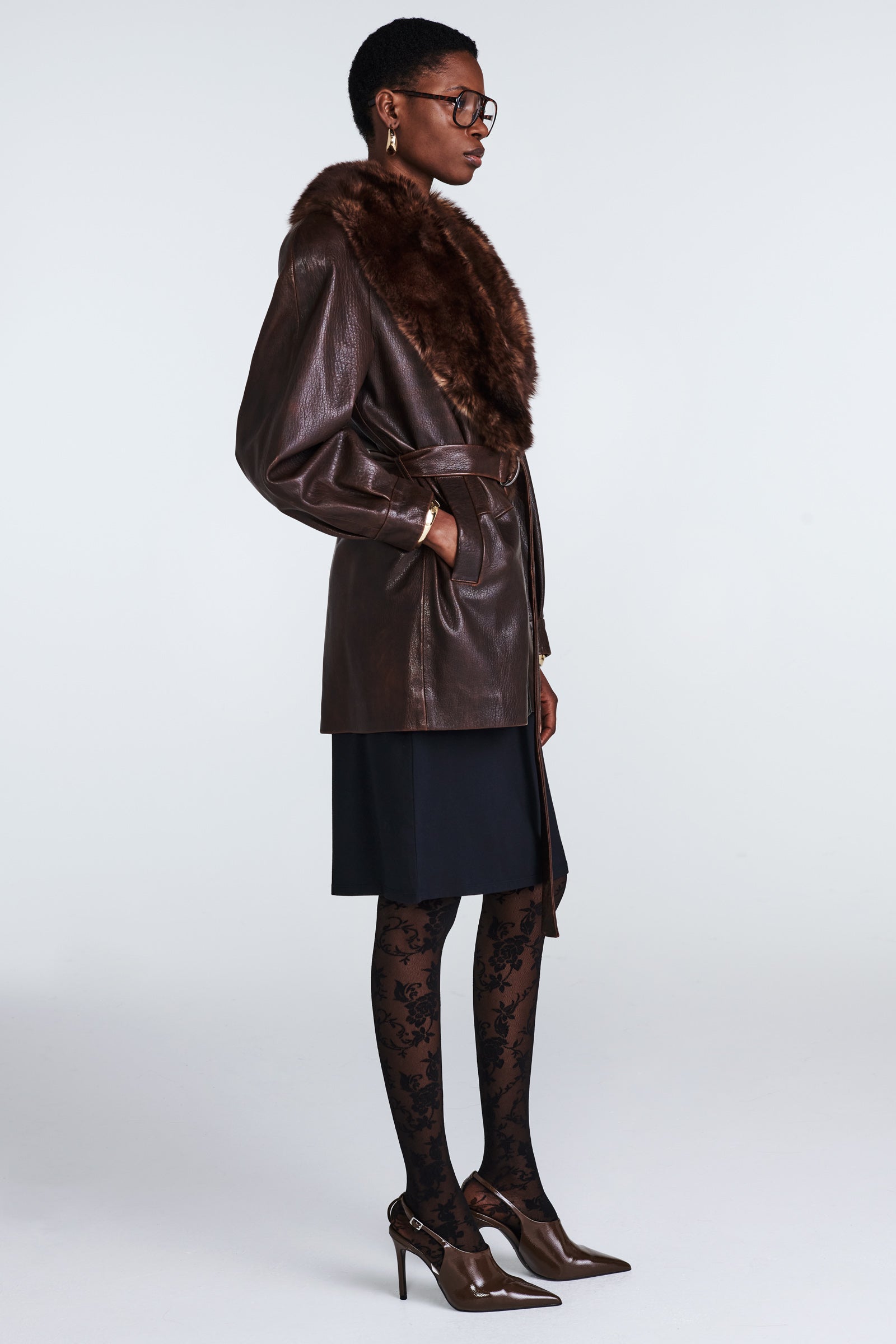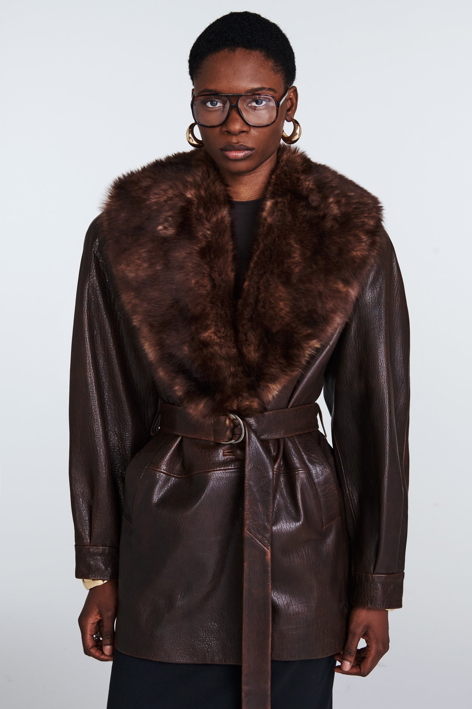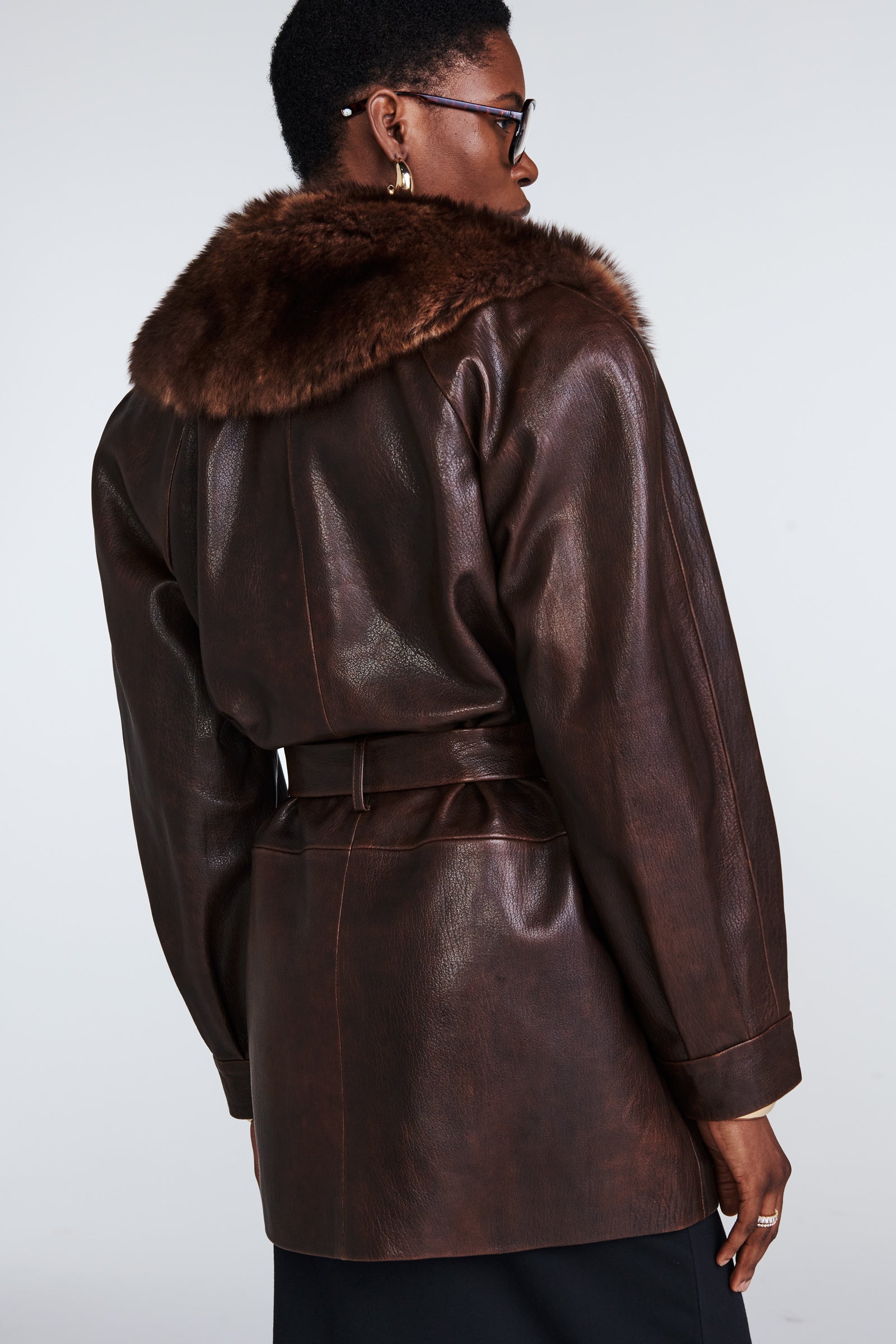 Our Nova is a sophisticated, yet versatile hip length leather coat adorned with opulent shearling shawl collar. Belted style for sleek silhouette, featuring stunning bell sleeves.