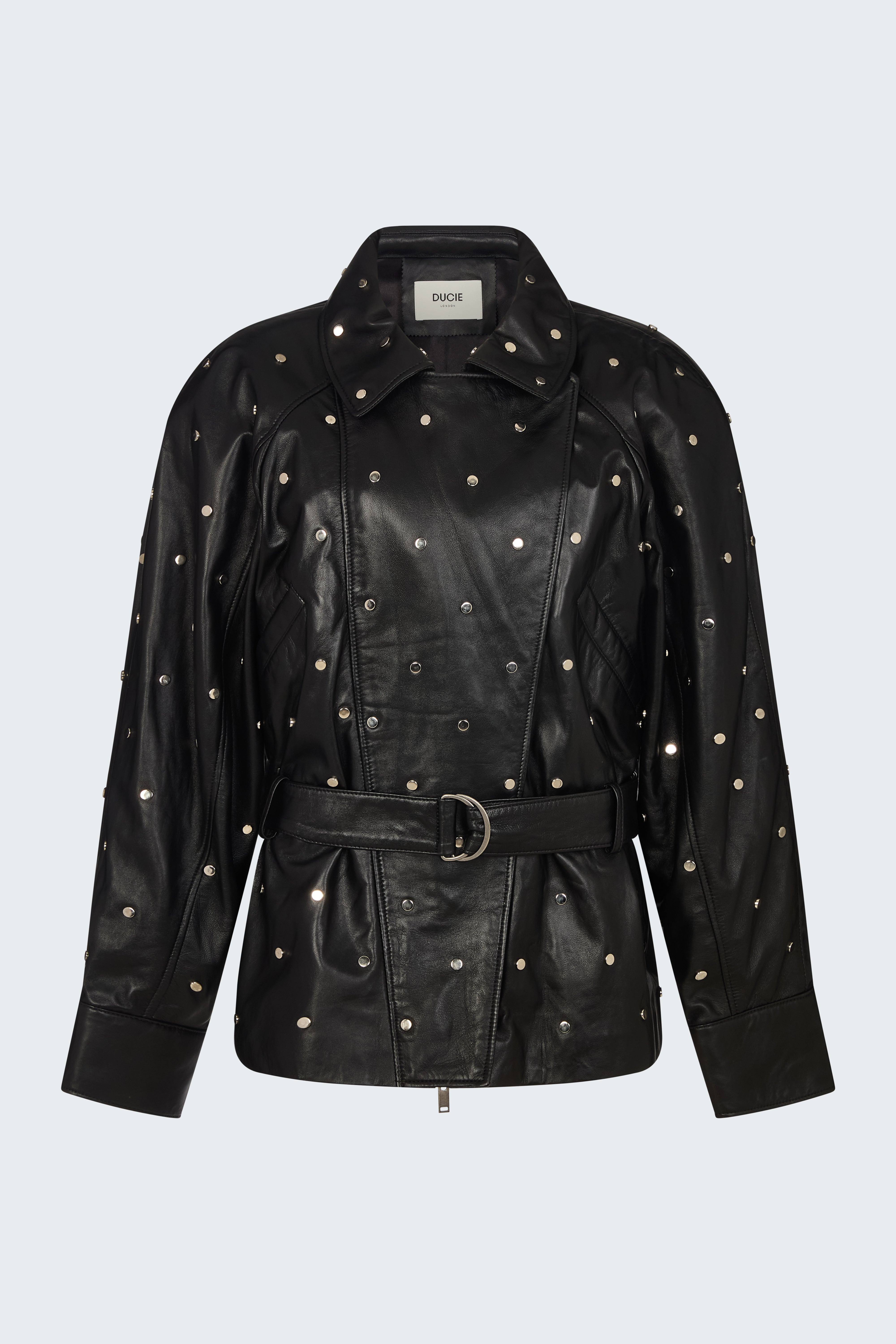 Made from supple leather the belted Sadie jacket with studs hidden zip front opening is the perfect understated transeasonal piece to add to your wardrobe.