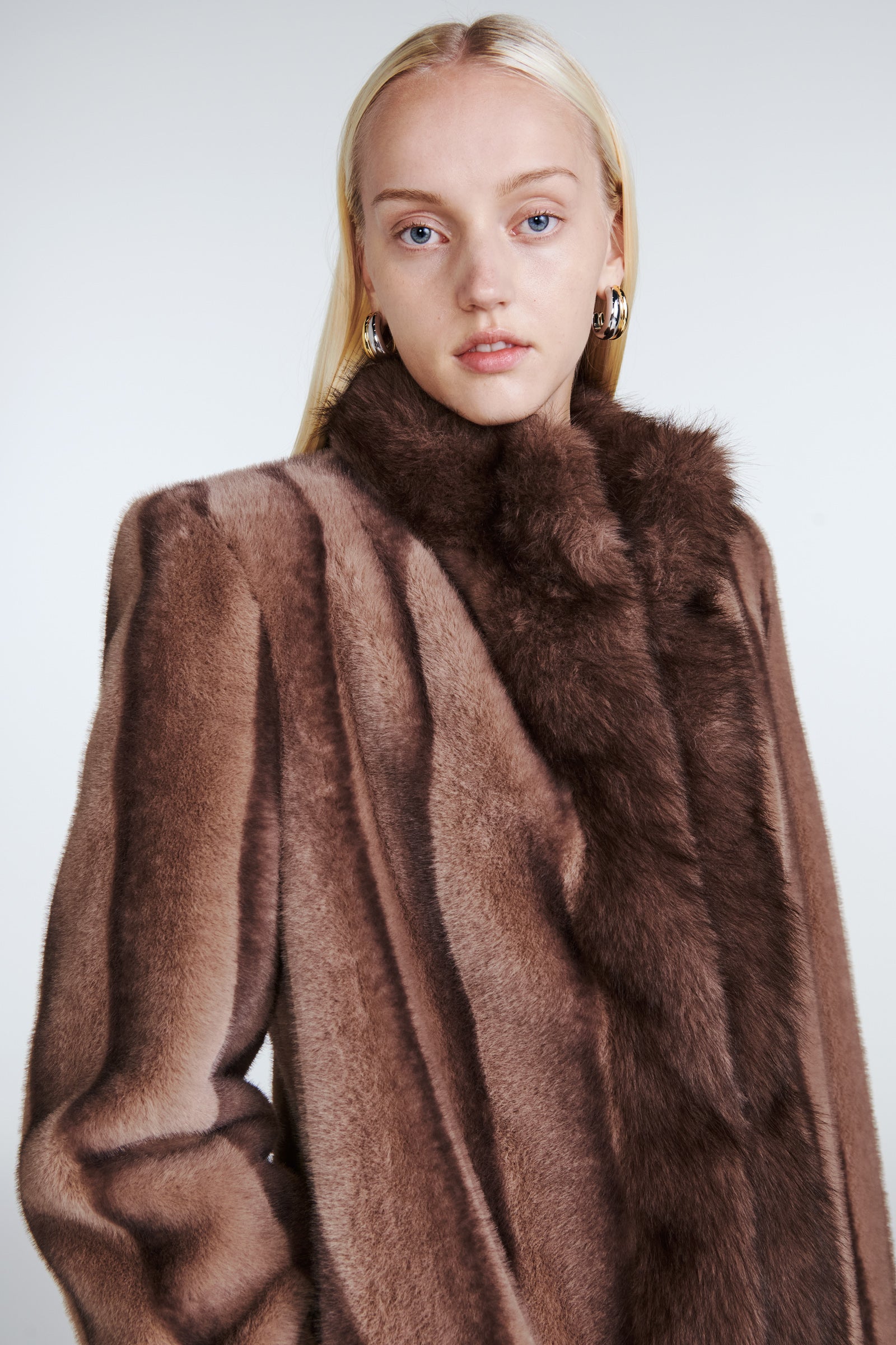 Stylish short faux fur coat combining two types of fur. It features stand collar and princess sleeves inspired design as a reference to 90’s power shoulders silhouette, and side seam pockets.