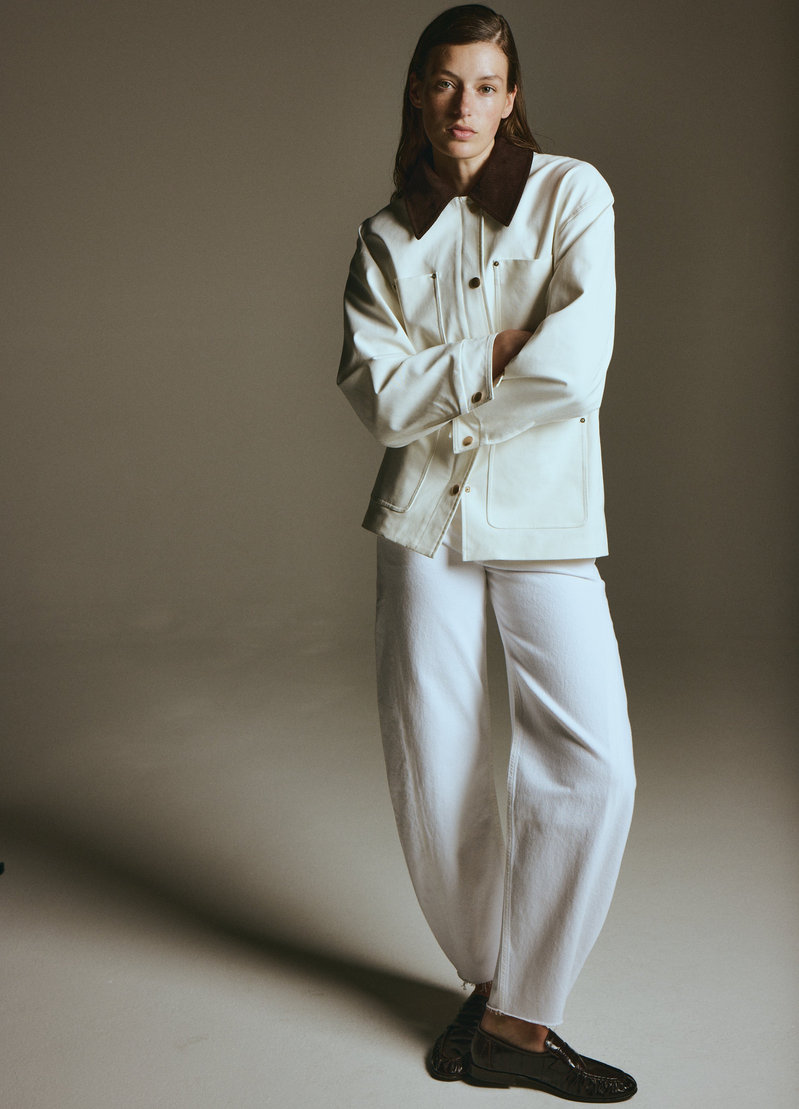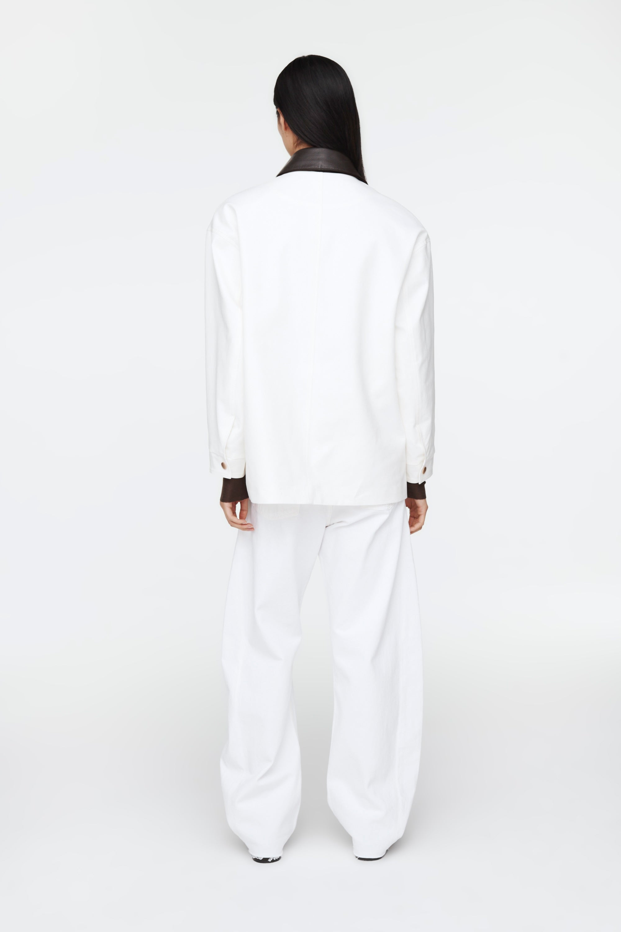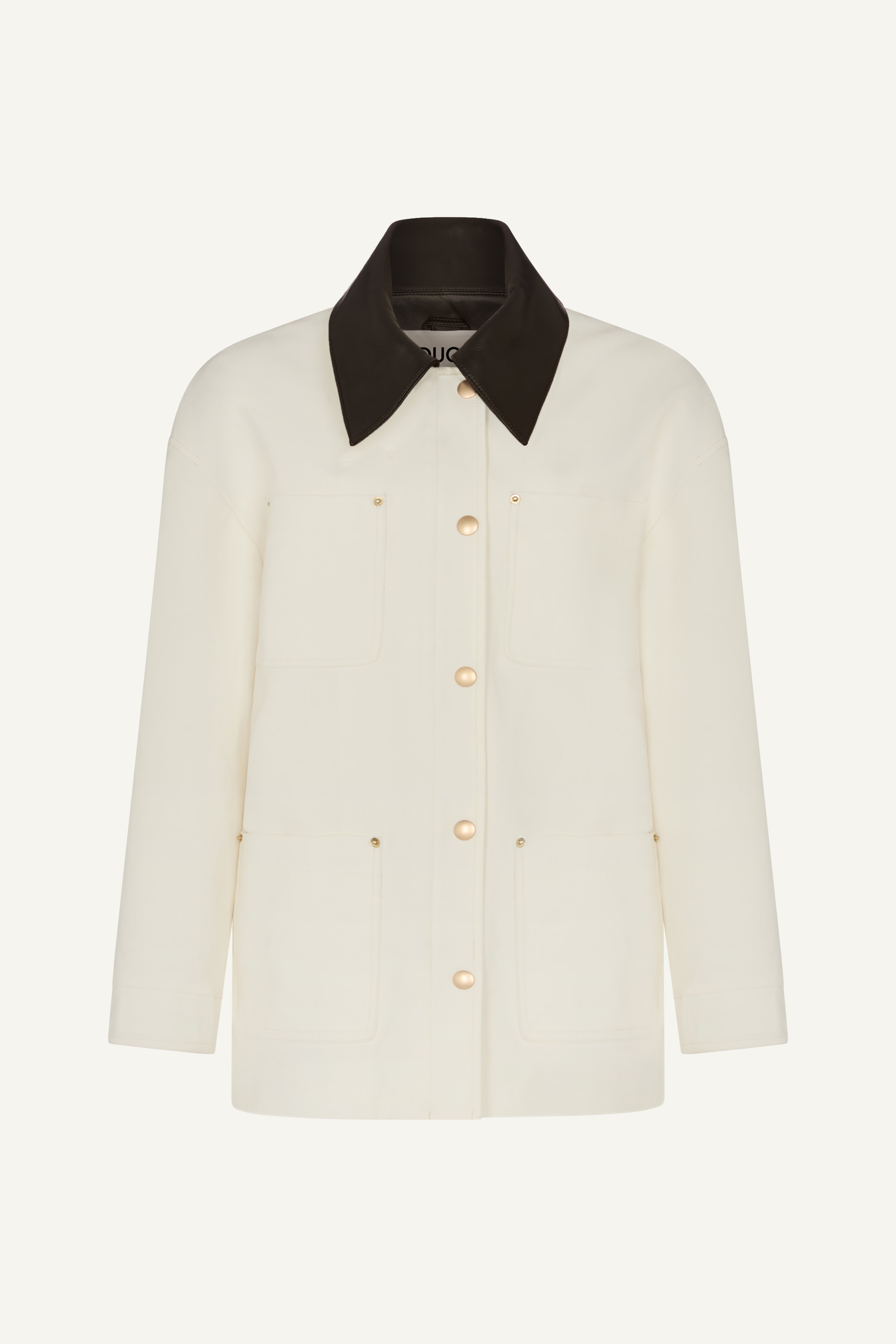 An elevated take on a barn jacket, the Stella is a beautiful white canvas jacket with patch pockets and a corduroy collar. Cut for a slightly loose fit the array of pockets gives it a utilitarian feel.