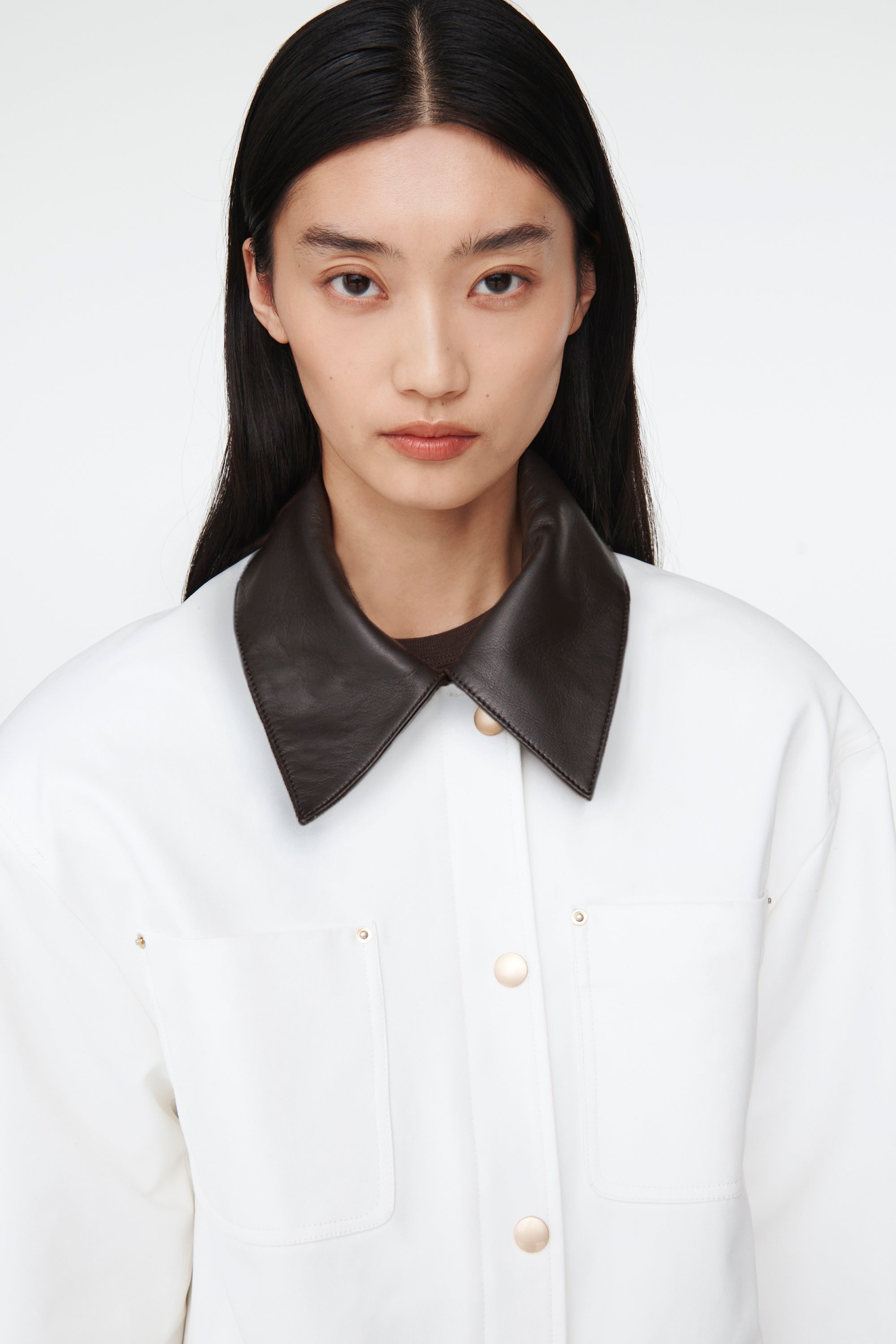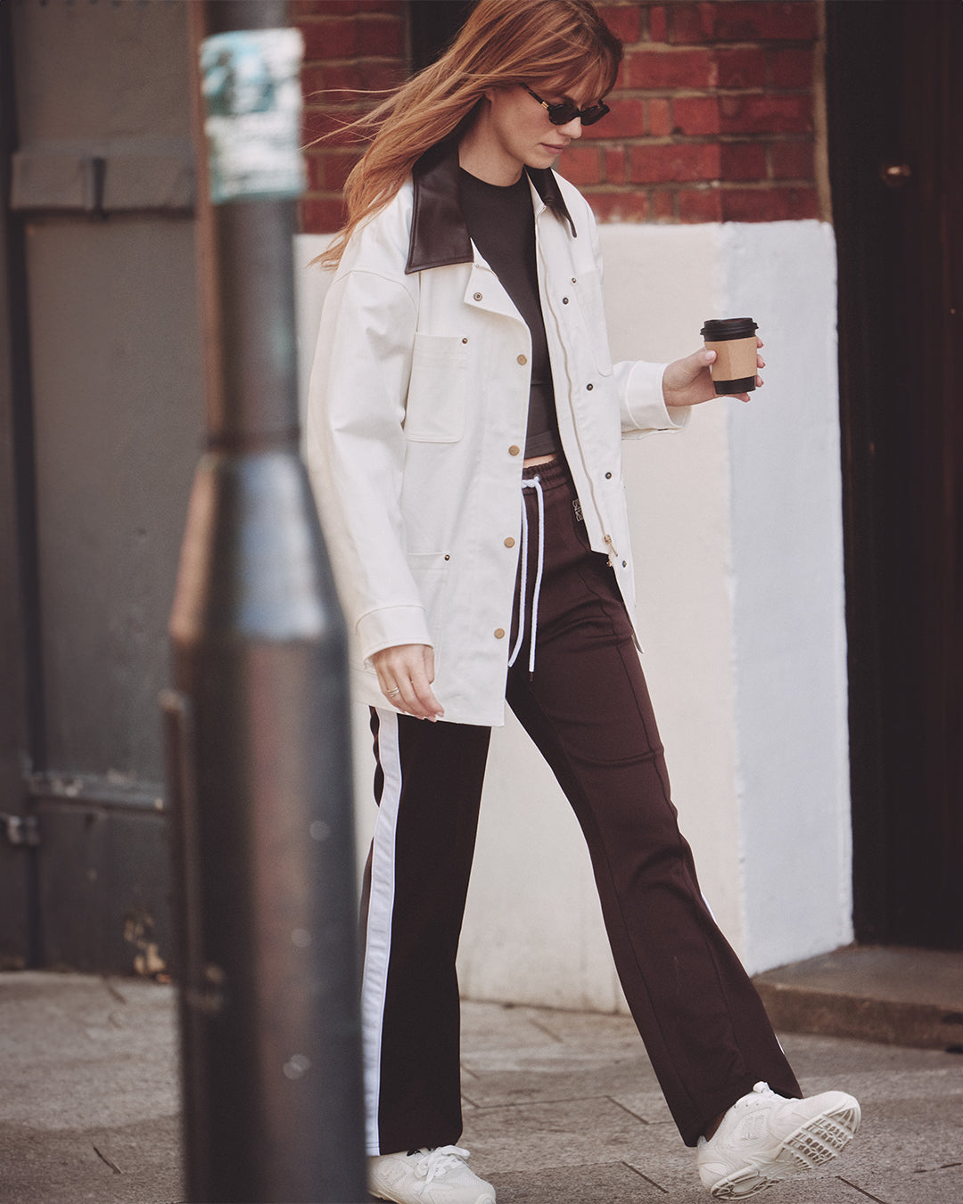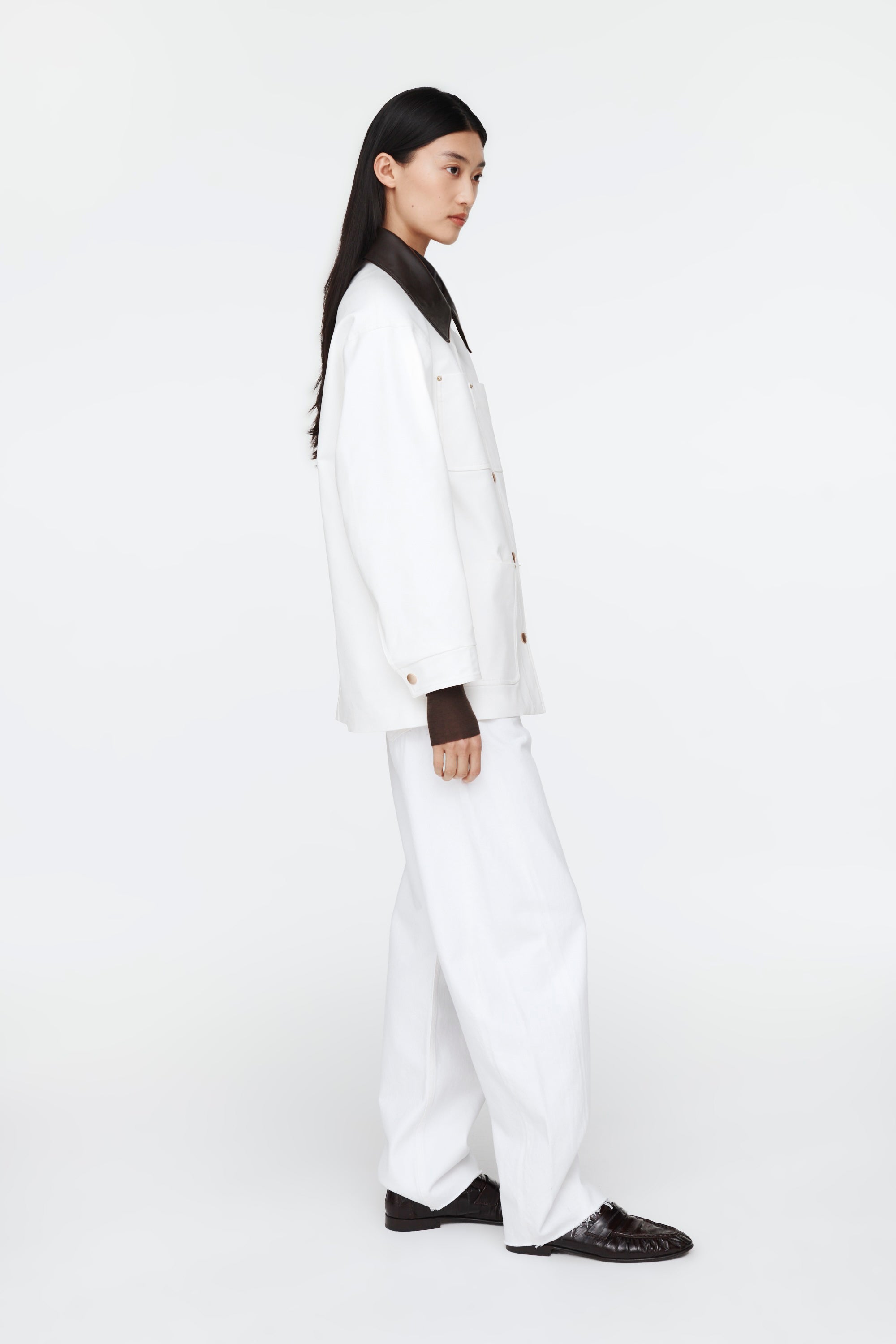 An elevated take on a barn jacket, the Stella is a beautiful white canvas jacket with patch pockets and a corduroy collar. Cut for a slightly loose fit the array of pockets gives it a utilitarian feel.