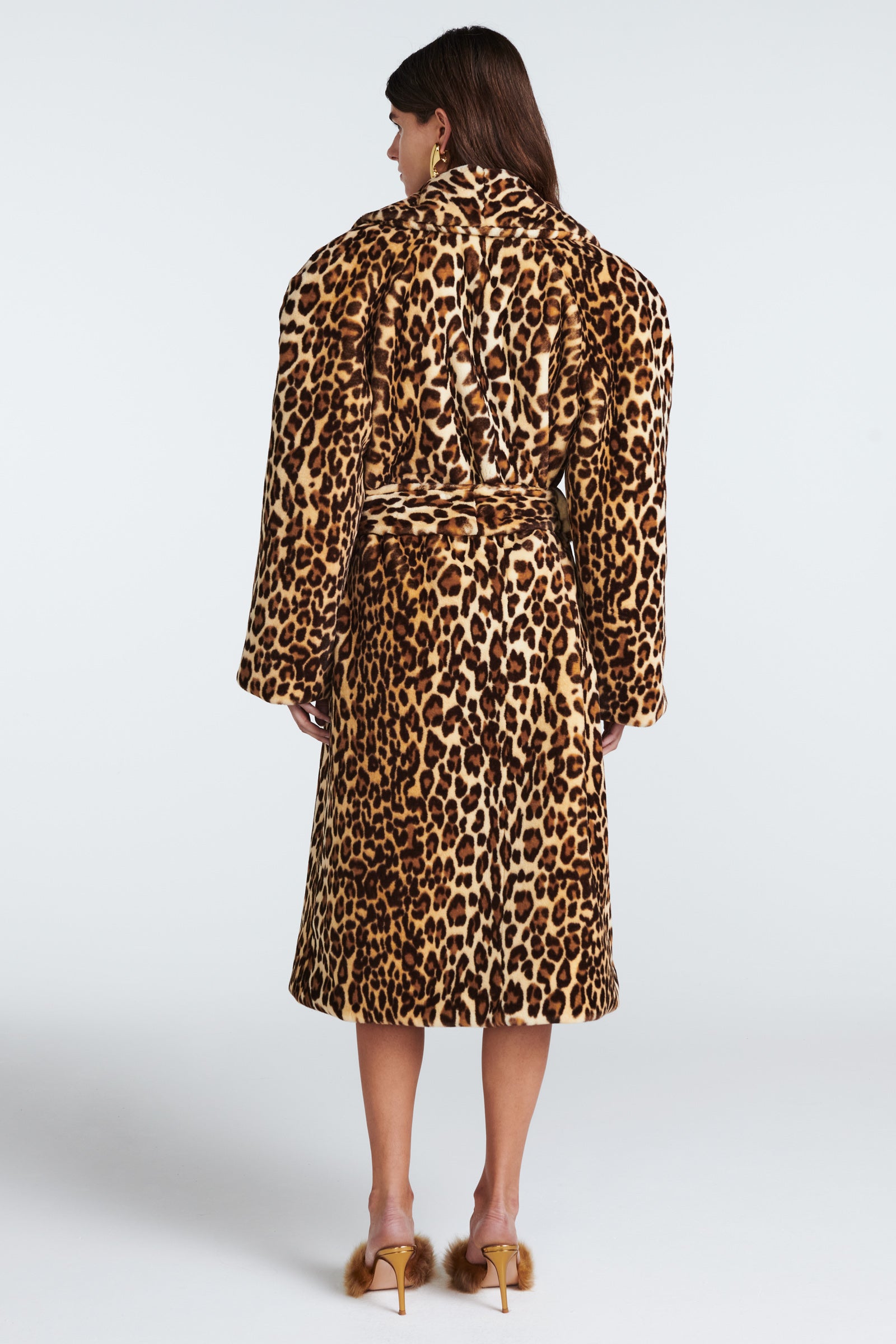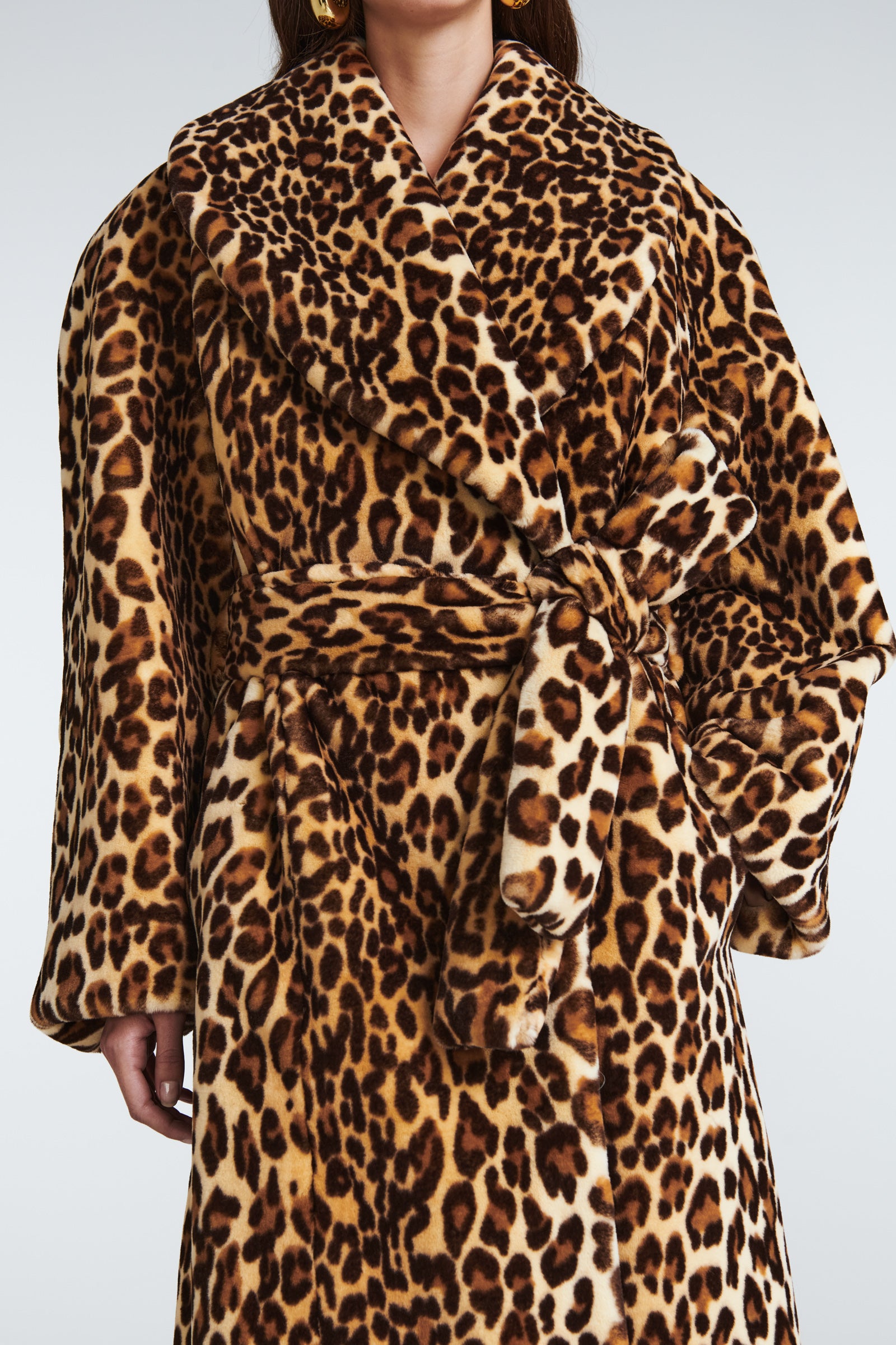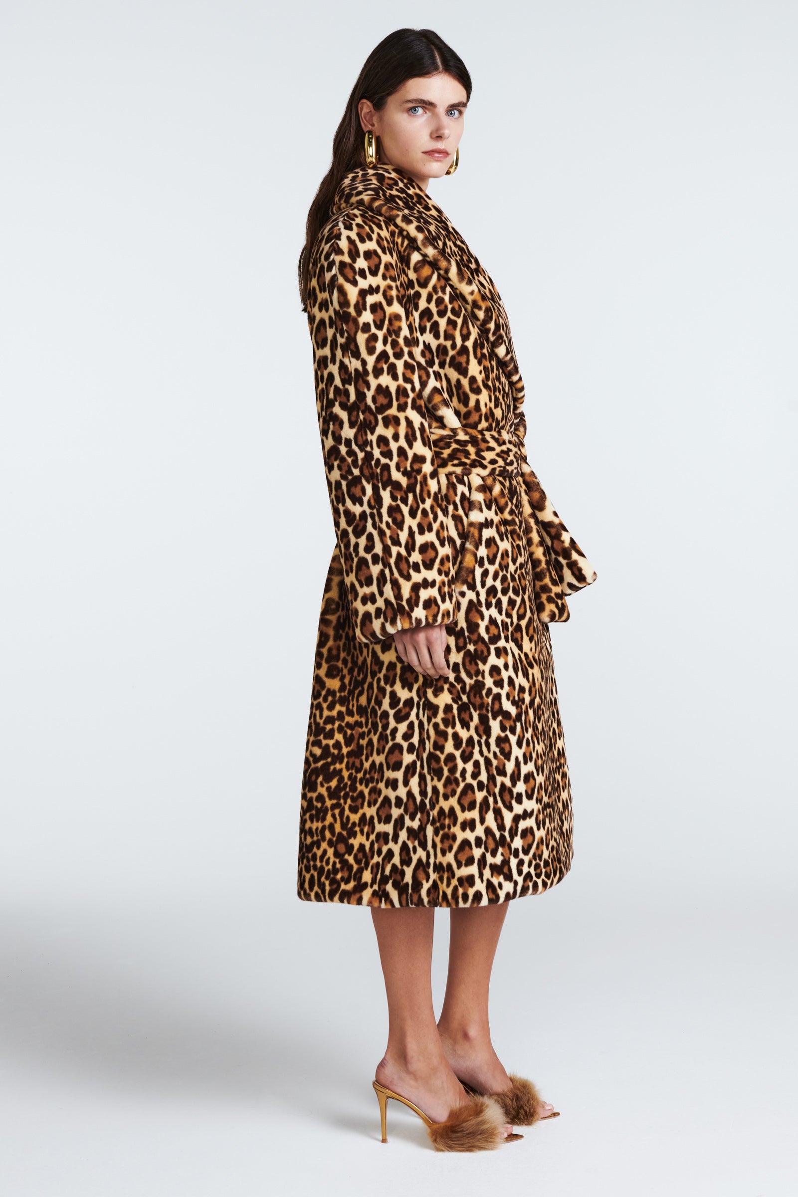 Incredibly fashionable and indulgently soft mid- calf length faux fur coat in leopard print with shawl lapels, tied up with a belt. Cut-through pockets for convenience. Versatile styling options, can be worn open without the belt for a relaxed fit.