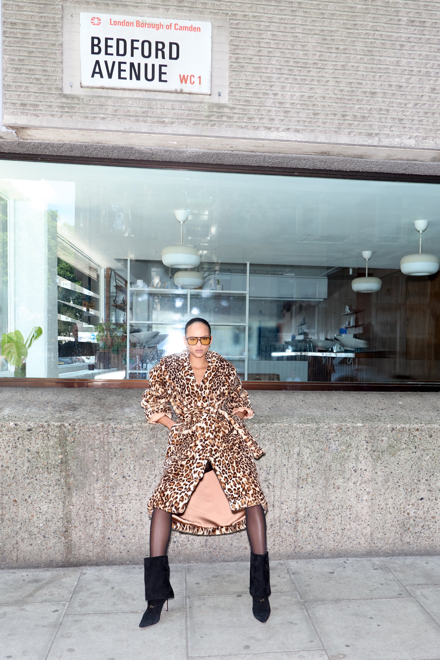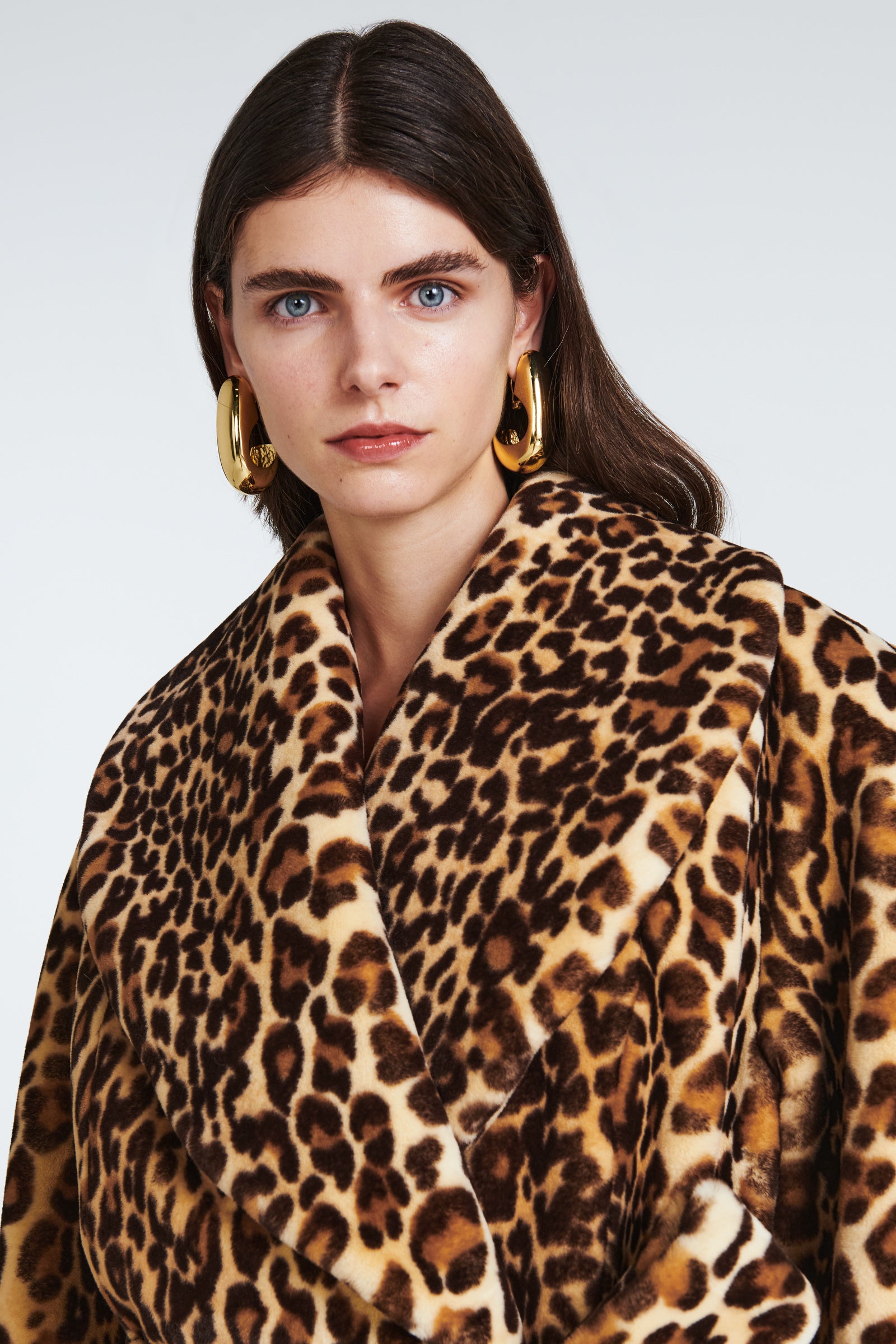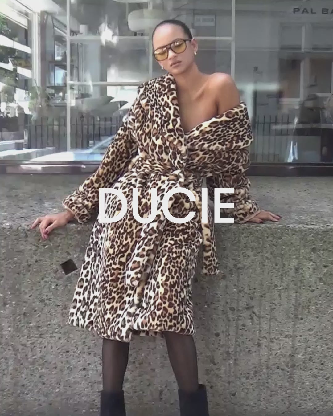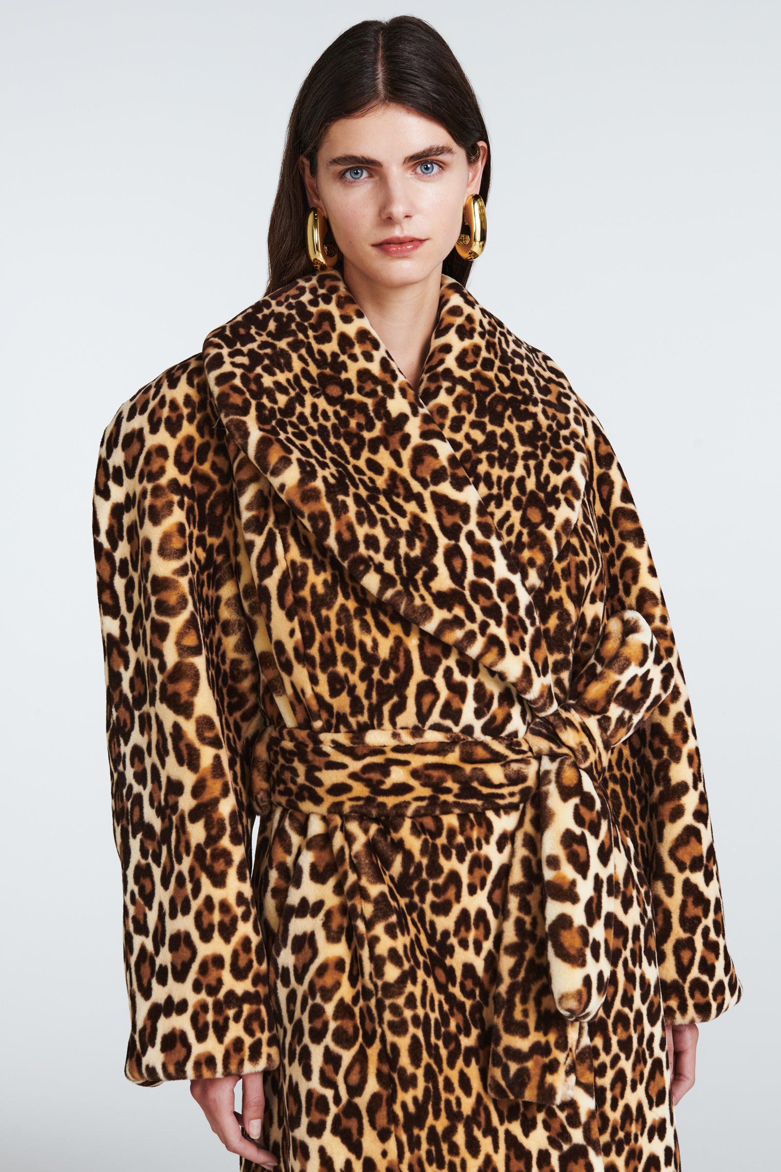 Incredibly fashionable and indulgently soft mid- calf length faux fur coat in leopard print with shawl lapels, tied up with a belt. Cut-through pockets for convenience. Versatile styling options, can be worn open without the belt for a relaxed fit.